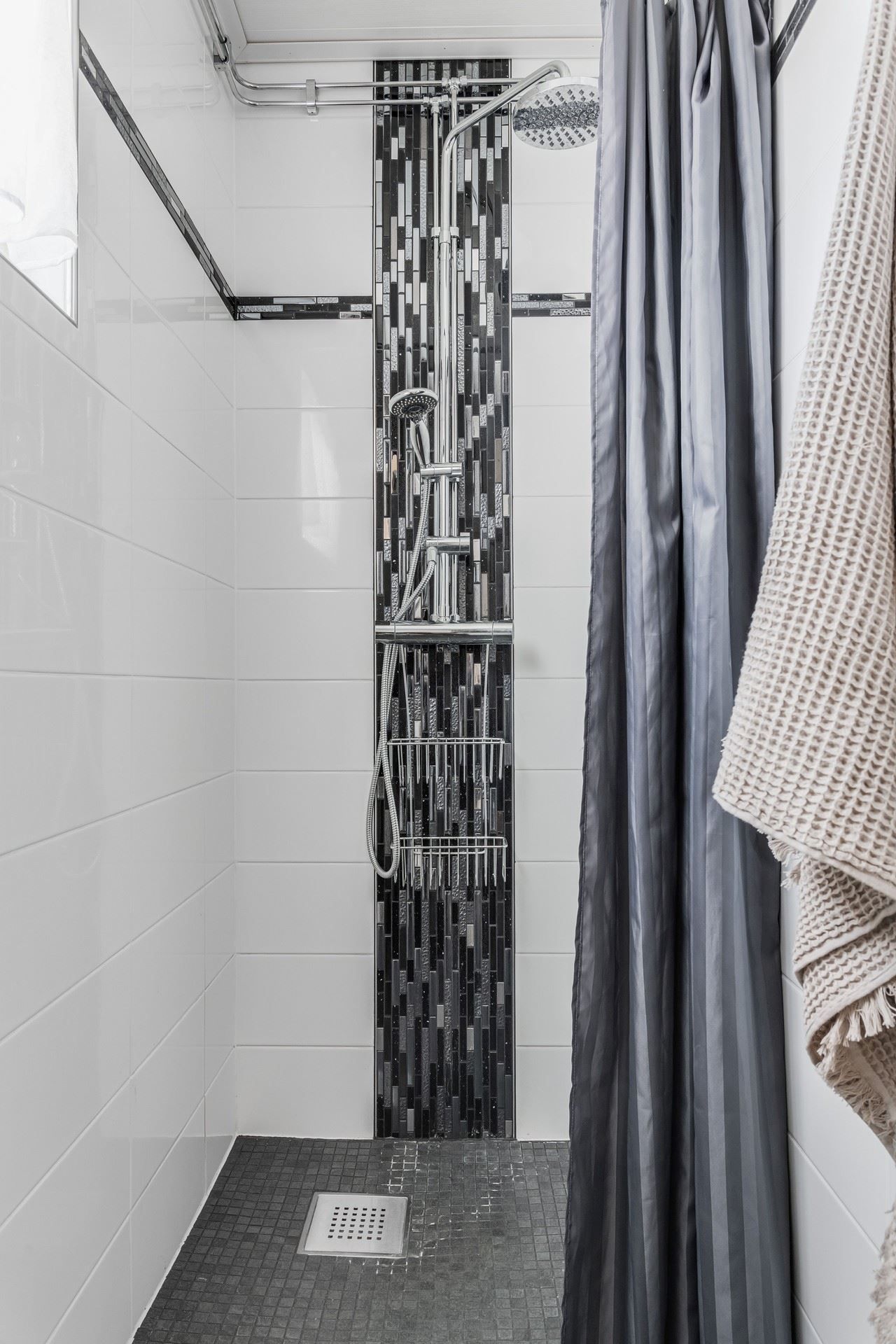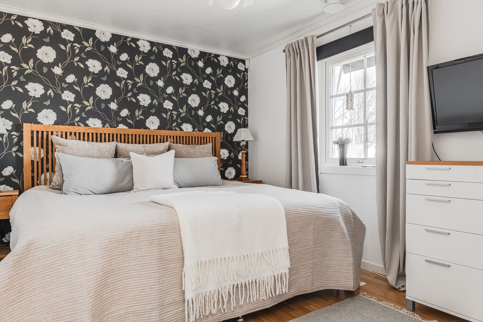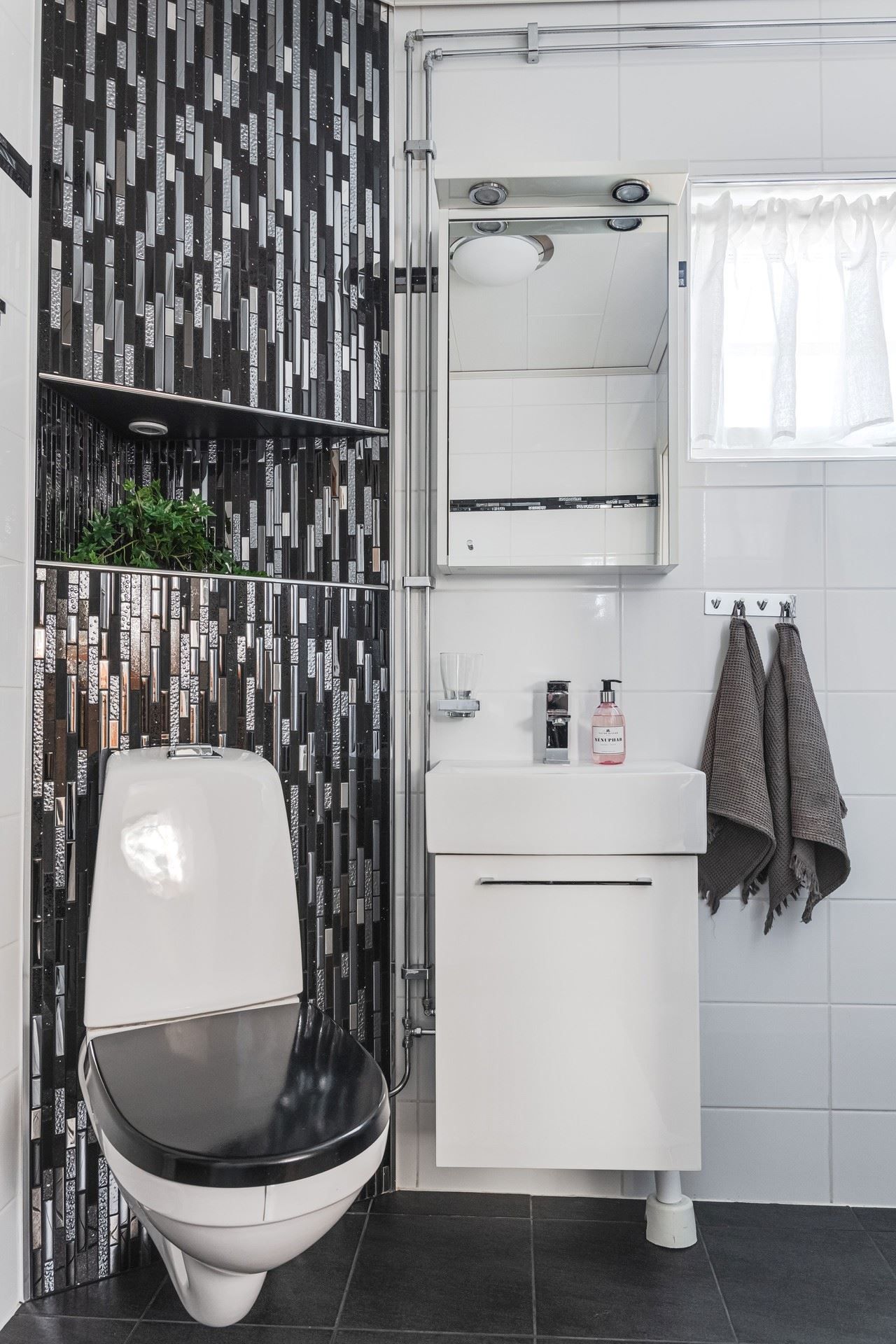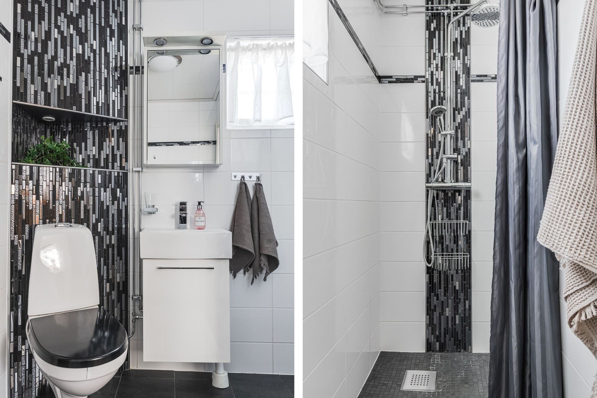 Badrummet med kombinerad tvättstuga är stilfullt inrett med kakel och klinker samt generösa ytor. I det fristående gästhuset intill entrén finns extra sovrum, gott om plats för hemmakontor, bastu med havsutsikt samt toalett med dusch.