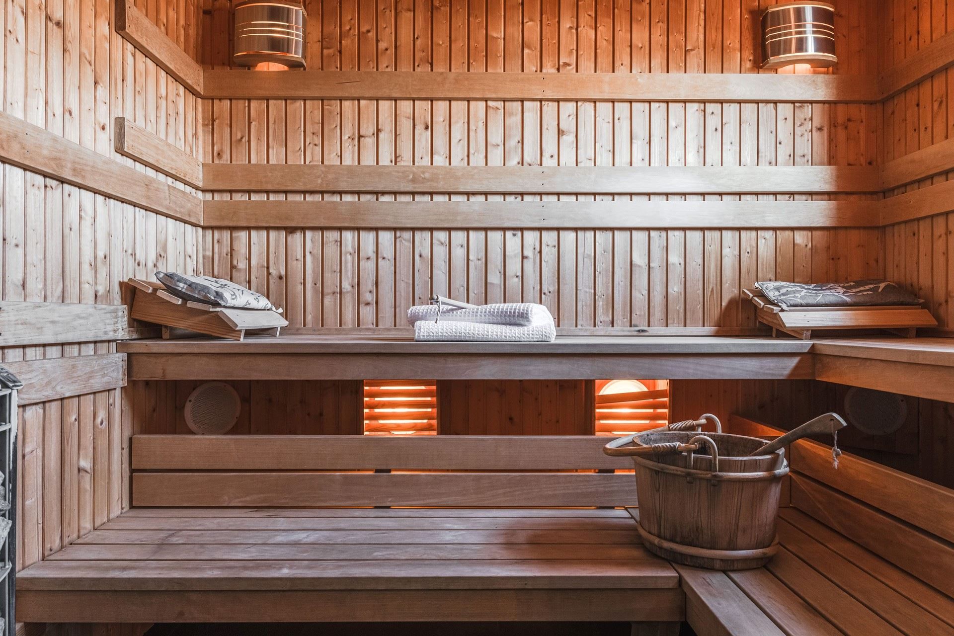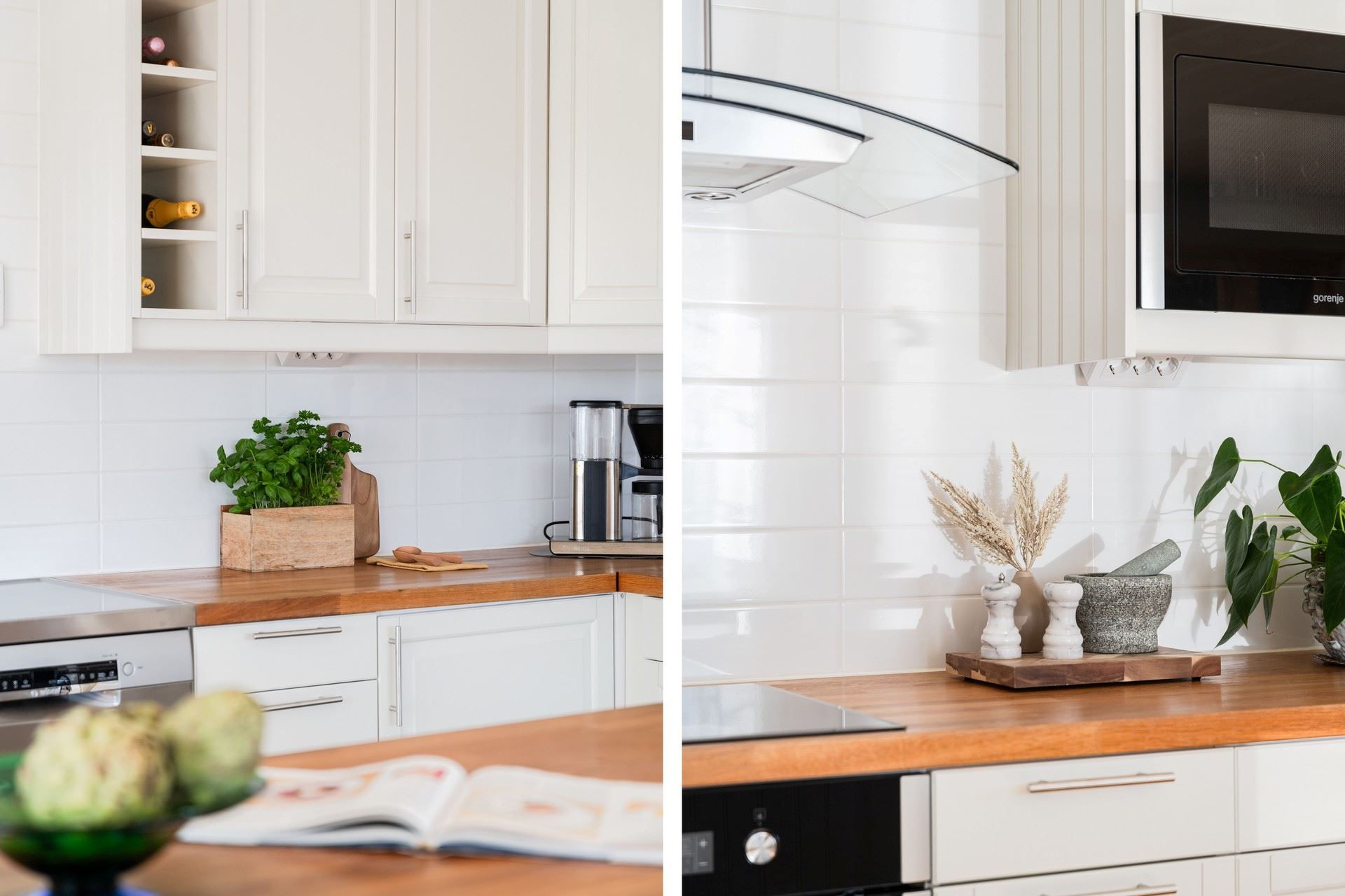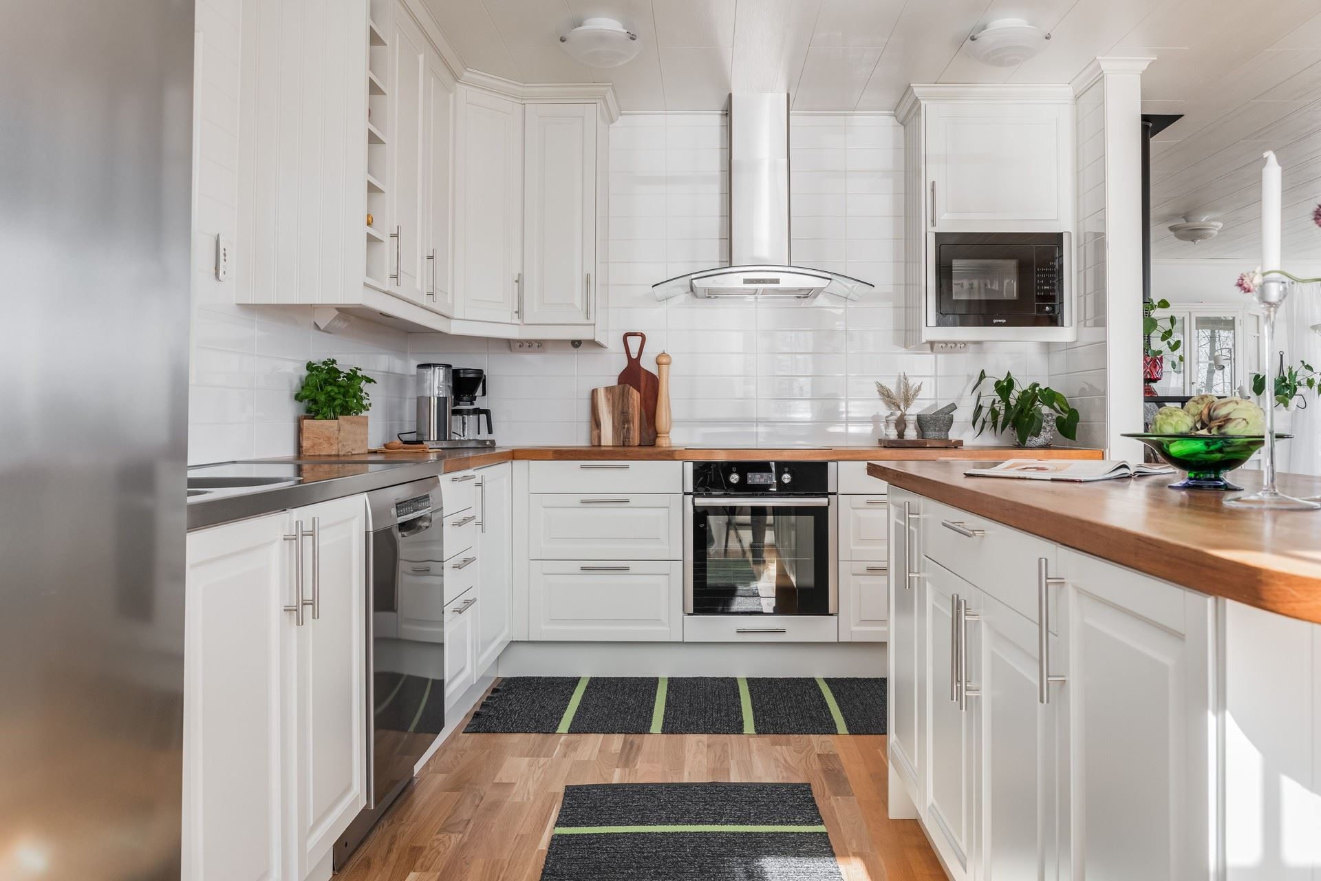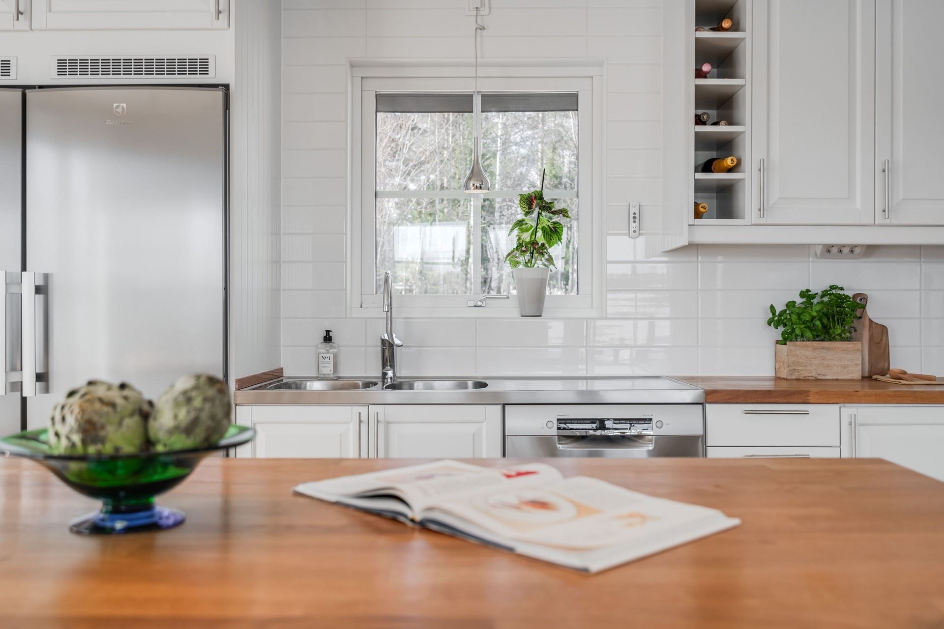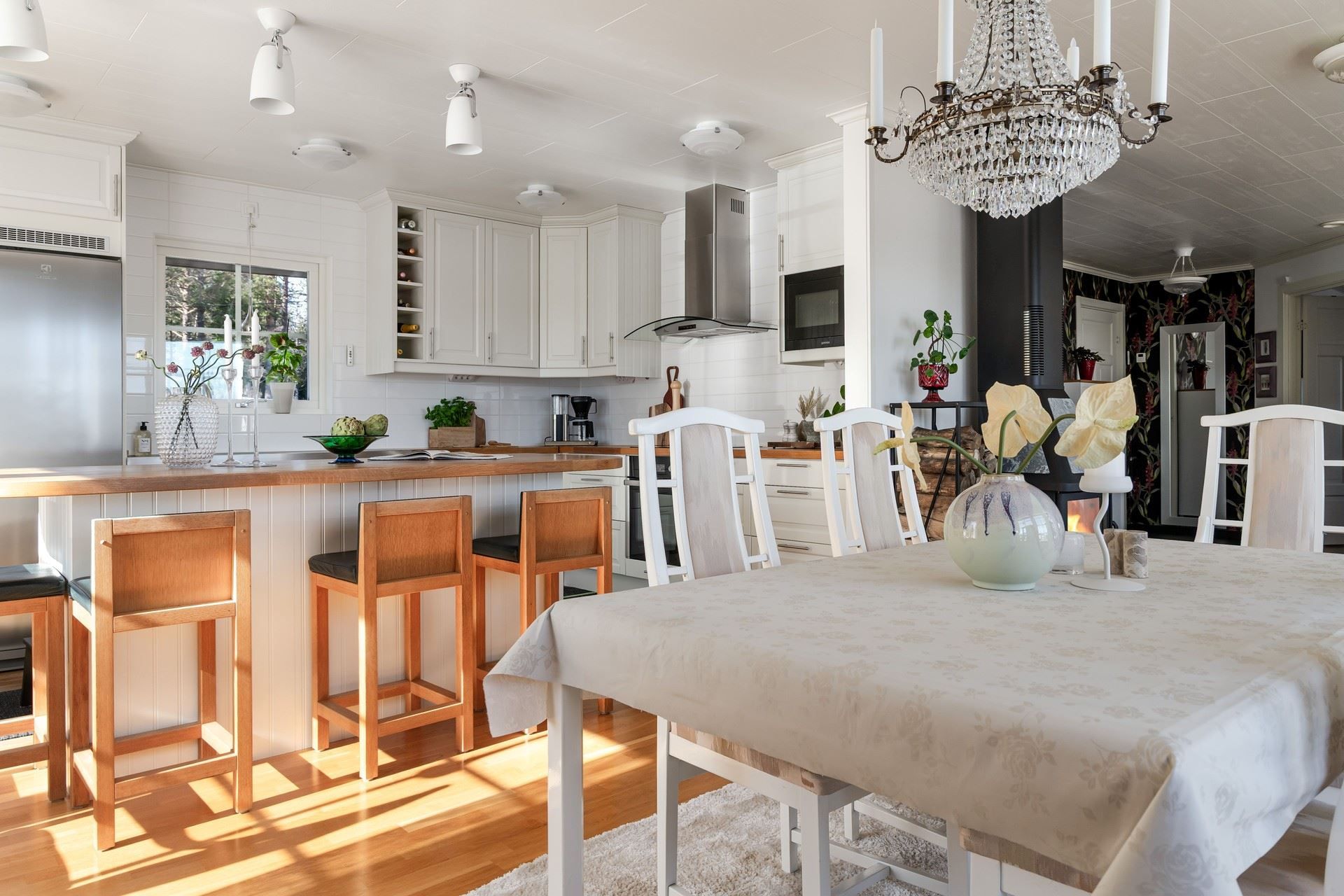 Det rymliga köket bjuder på gott om arbetsytor och en stor köksö där både matlagning och umgänge får ta plats. Två altandörrar leder ut till den enorma altanen som löper runt huset. Här väntar ett stort soldäck med en stor pool som värms upp av bergvärmen, bubbelbad och utomhus bastu – en privat spa-oas med utsikt över havet och den egna båten vid bryggan.