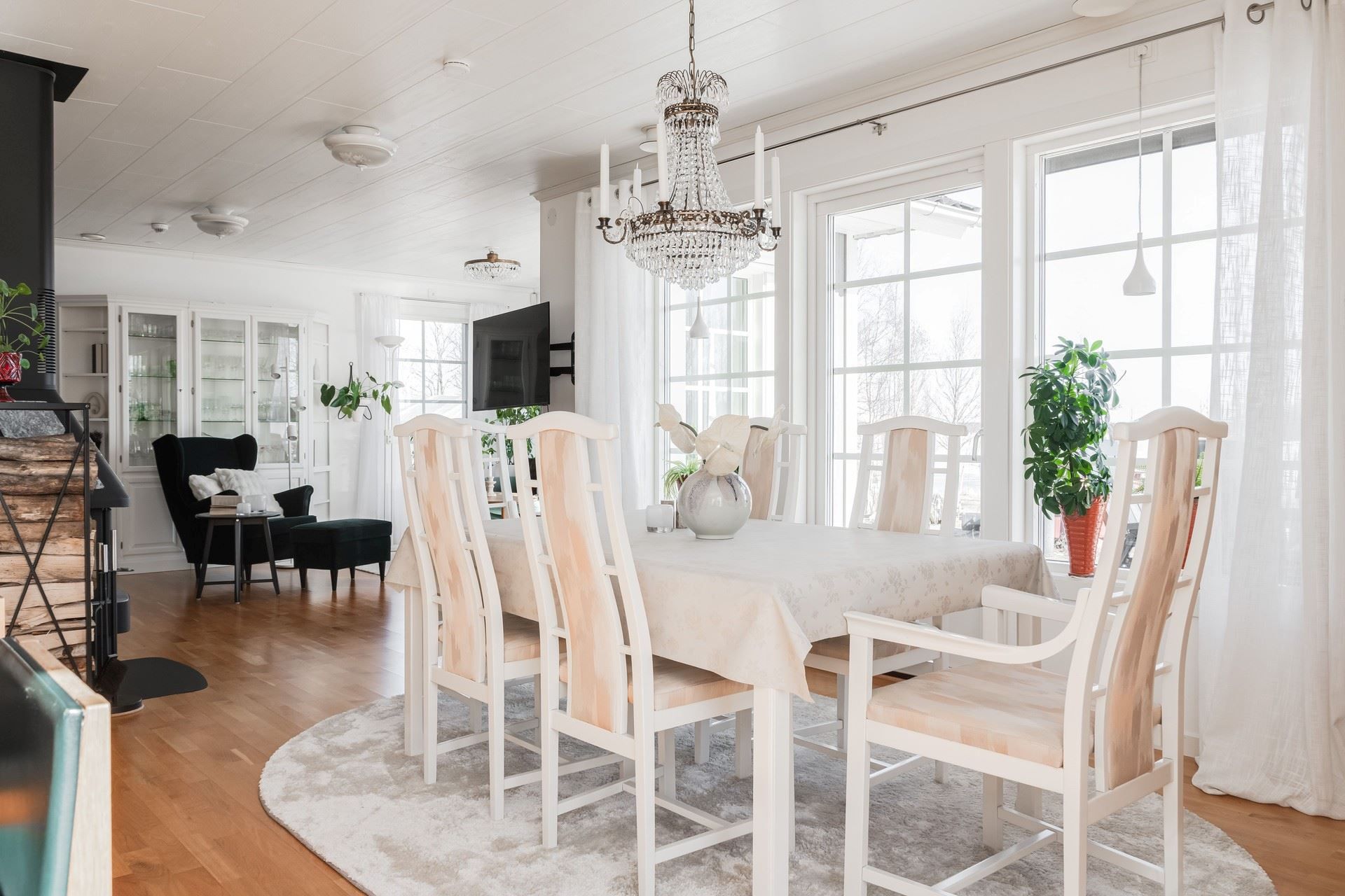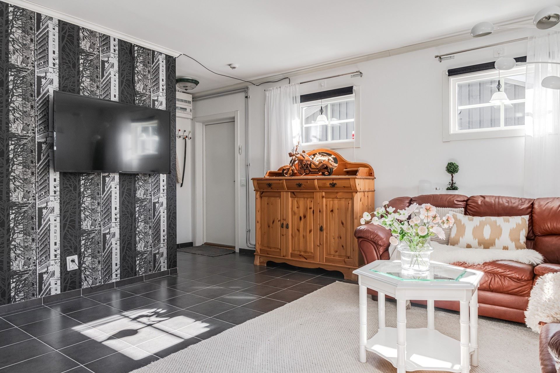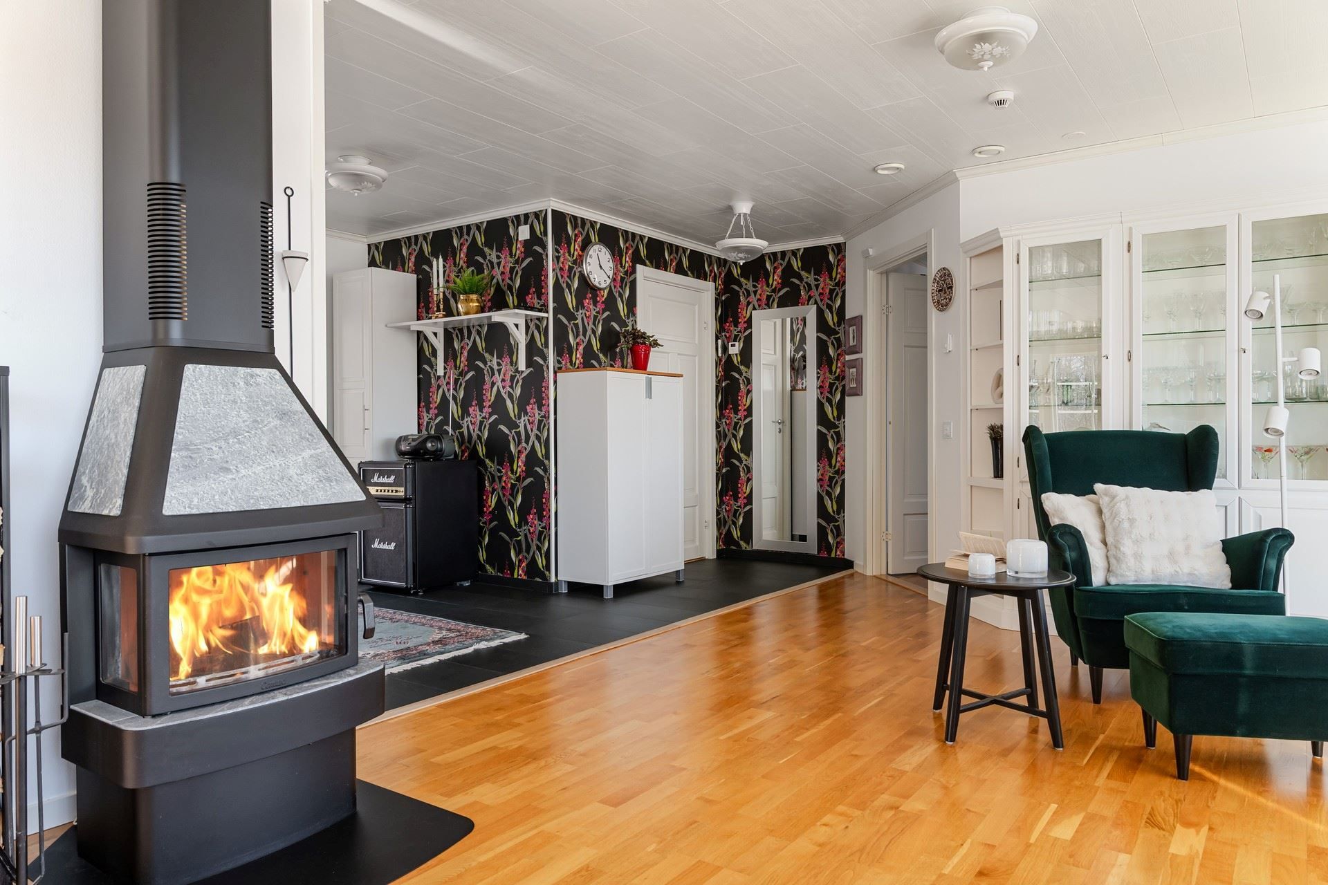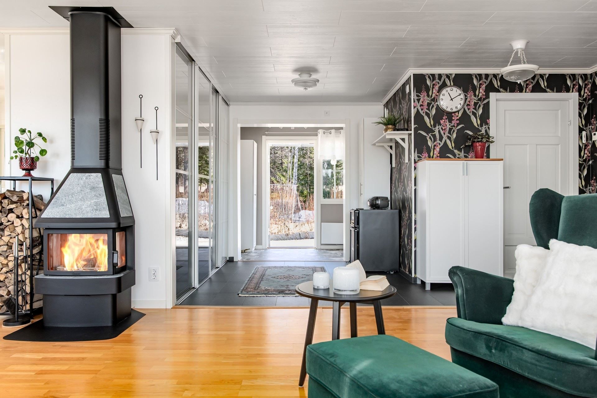 Vardagsrummet erbjuder en härlig social yta där kaminen sprider värme under årets kallare dagar. Här bor du bekvämt, representativt och havet som granne