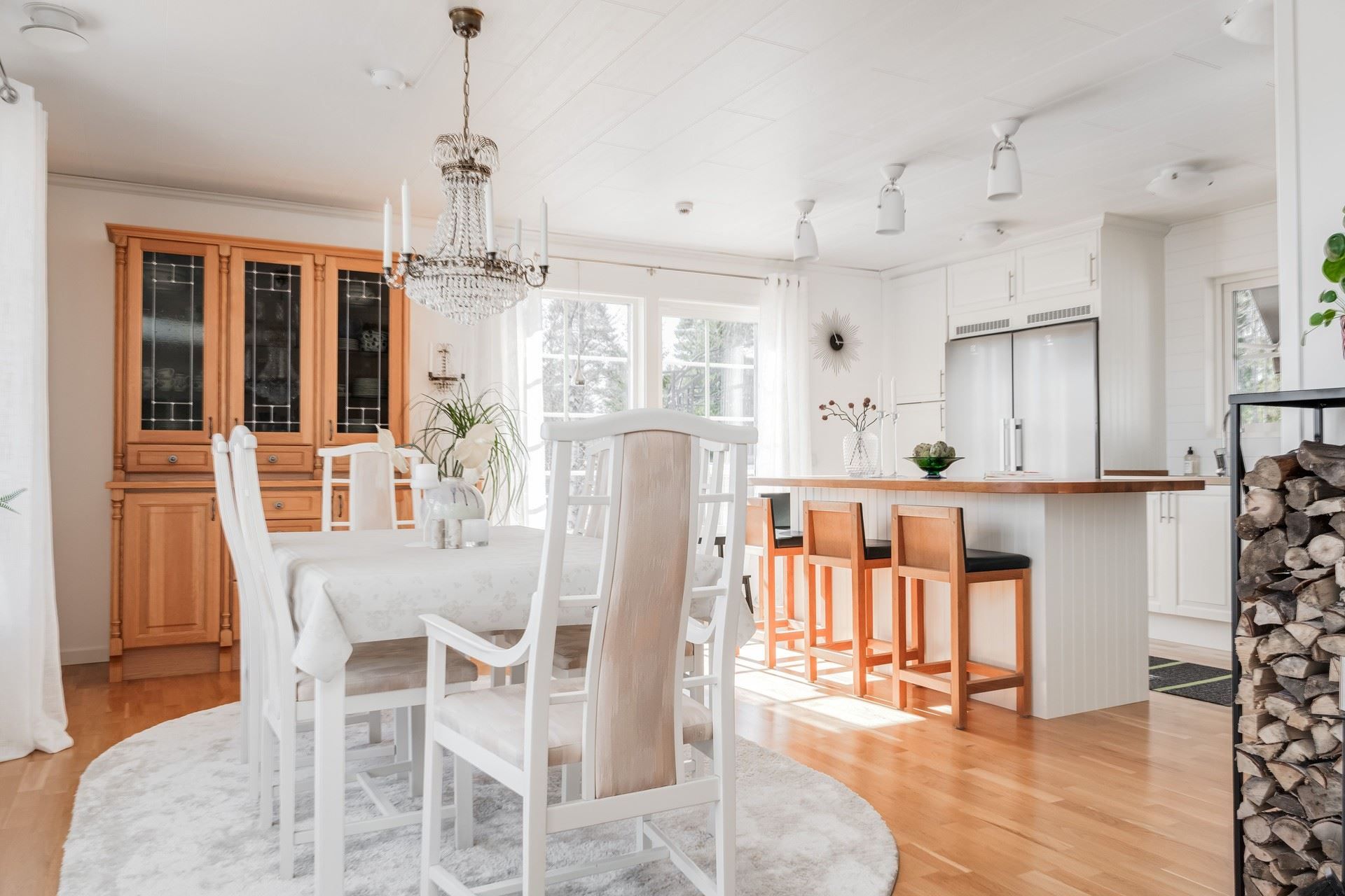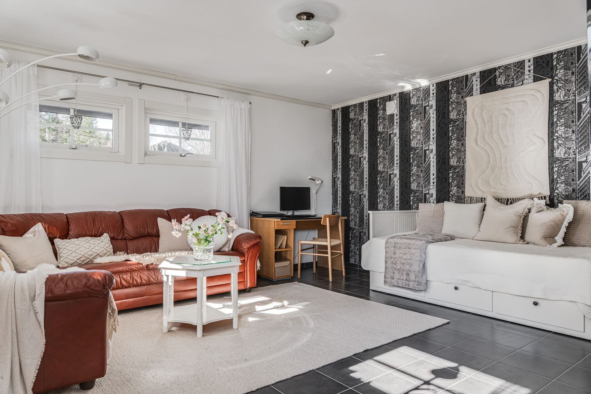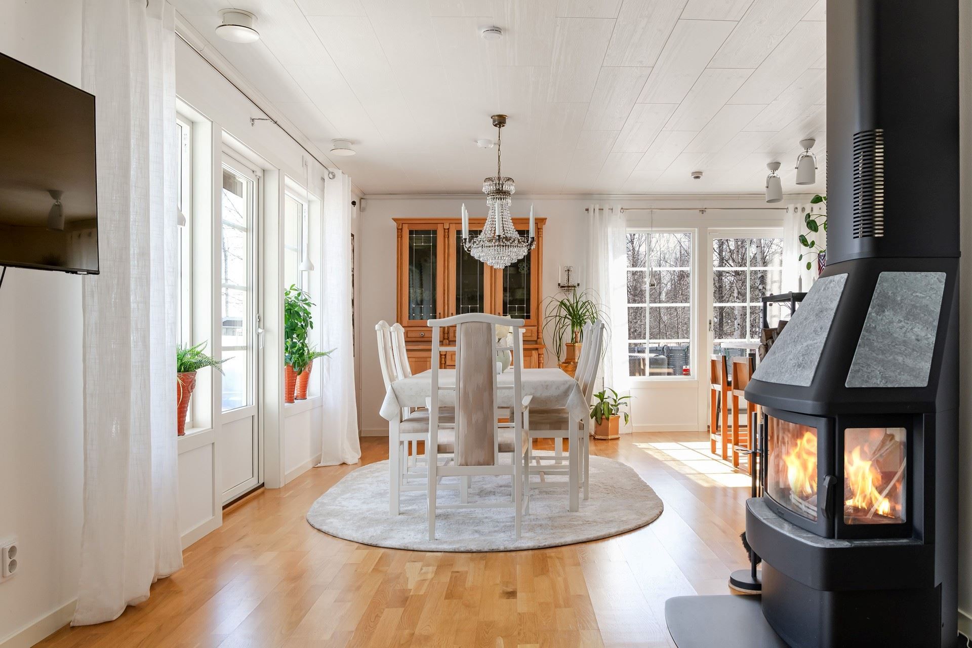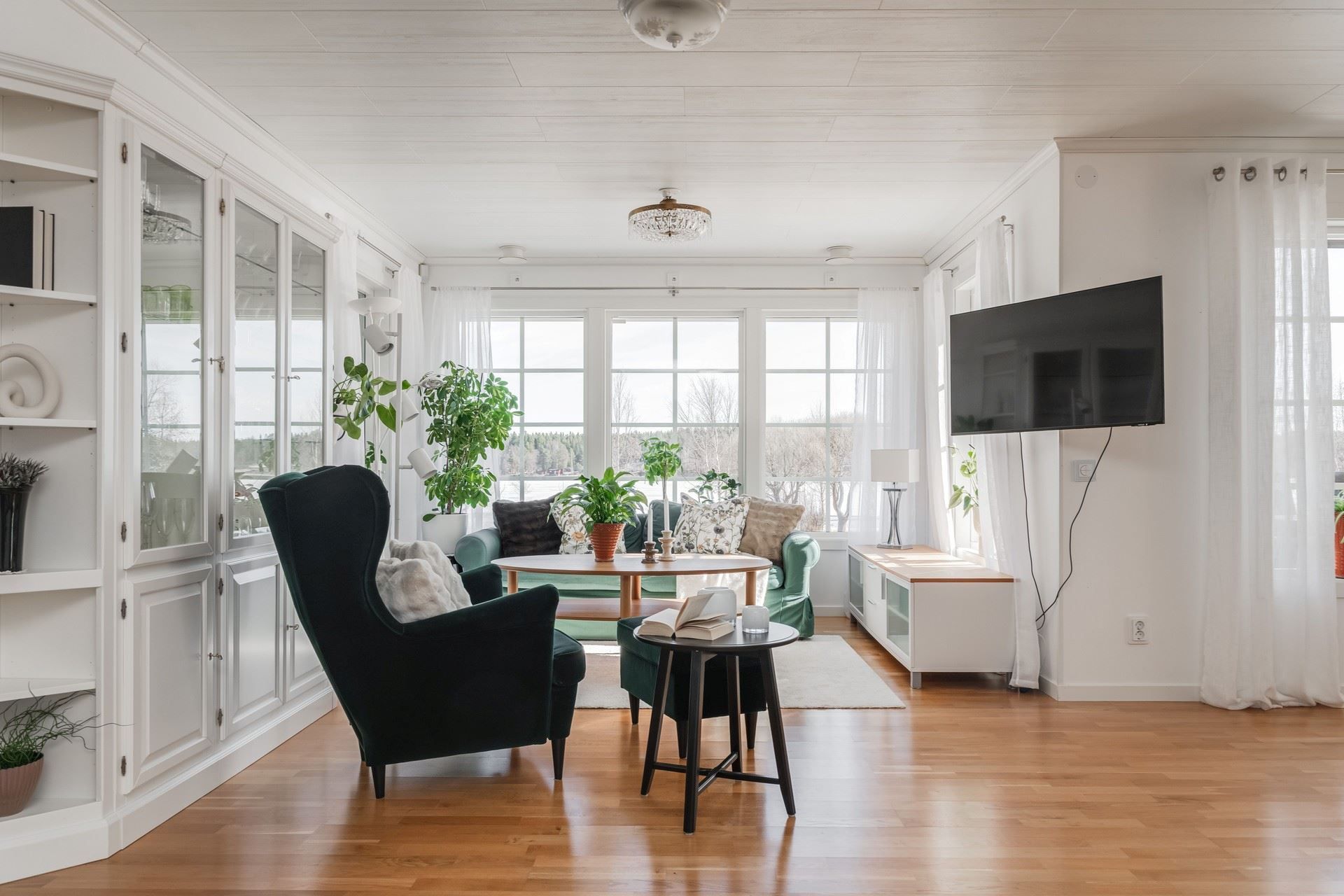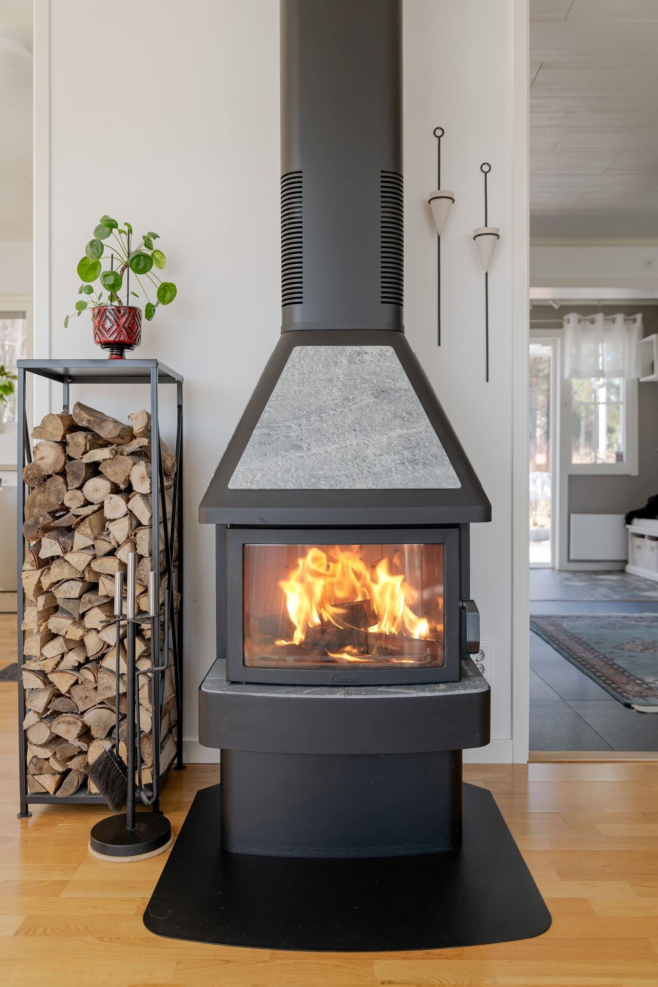 Vardagsrummet erbjuder en härlig social yta där kaminen sprider värme under årets kallare dagar. Här bor du bekvämt, representativt och havet som granne