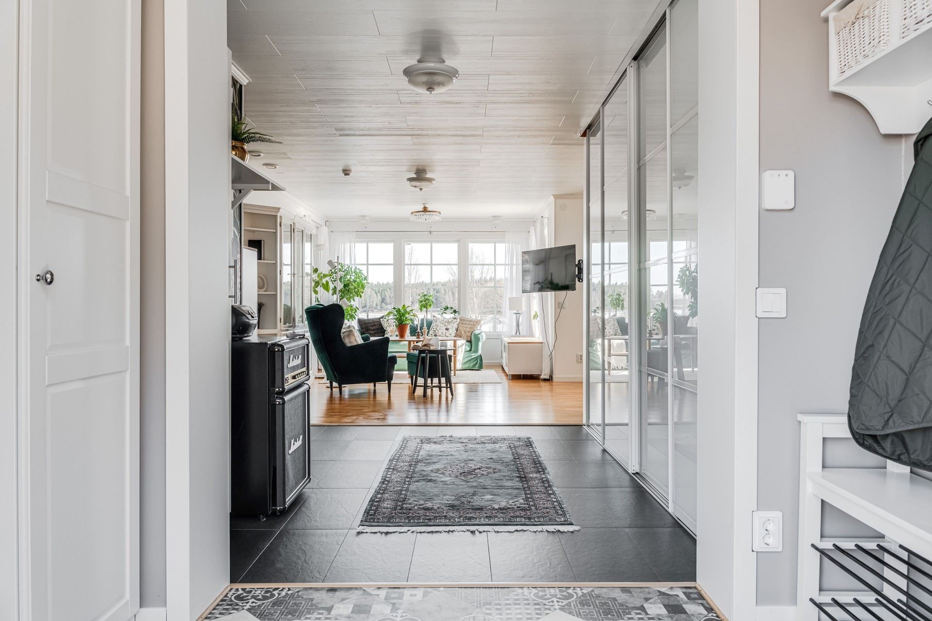 Missa inte chansen att bo vid havet med allt du kan önska för ett liv i vardagslyx. Redan i den stora, välkomnande hallen möts du av utsikten mot vattnet och generösa förvaringsmöjligheter. Den öppna planlösningen med stora fönster längs hela långsidan skapar ett fantastiskt ljusinsläpp och en rogivande atmosfär. Praktiska elektriska solskydd på samtliga fönster ger komfort året om.