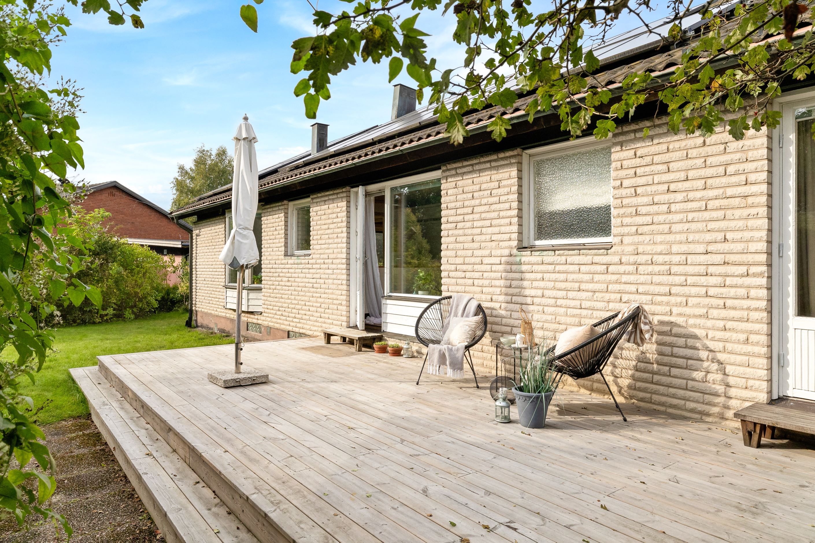 Från både kök, matplats och ett av sovrummen på entréplanet tar du dig smidigt ut till den insynsskyddade och lummiga uteplatsen med altan och plana gräsytor. Här finns även en stenlagd pergola – en perfekt plats för avkoppling och trädgårdsfester.