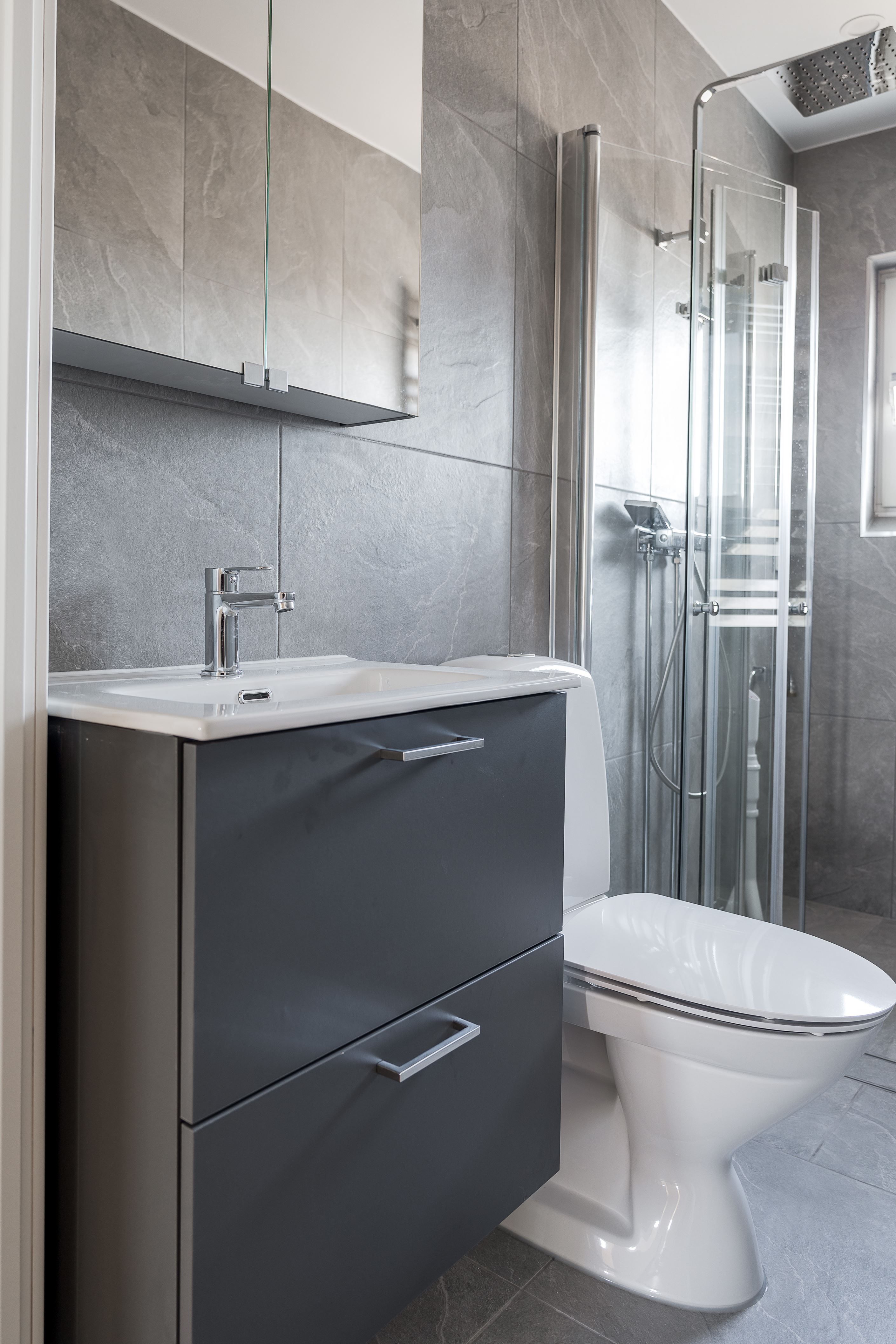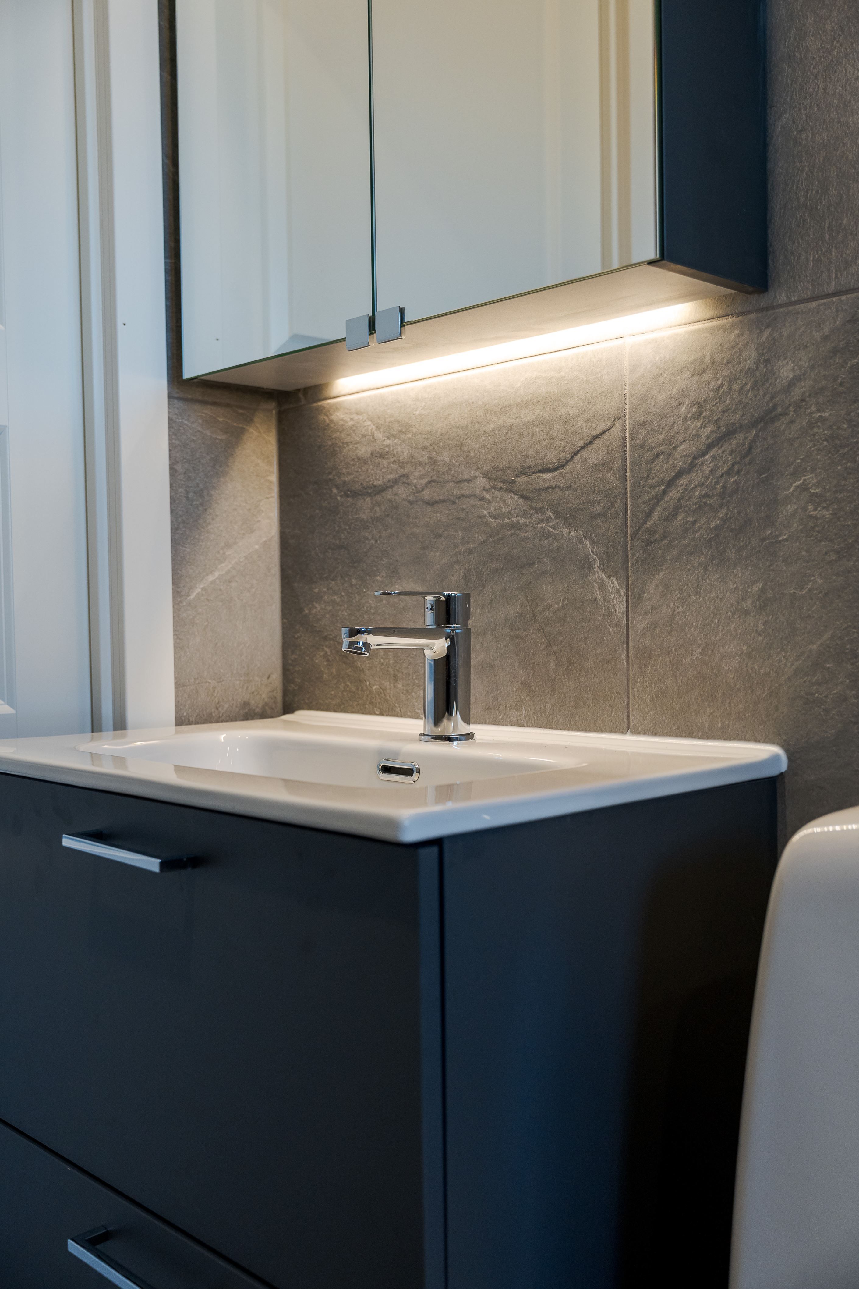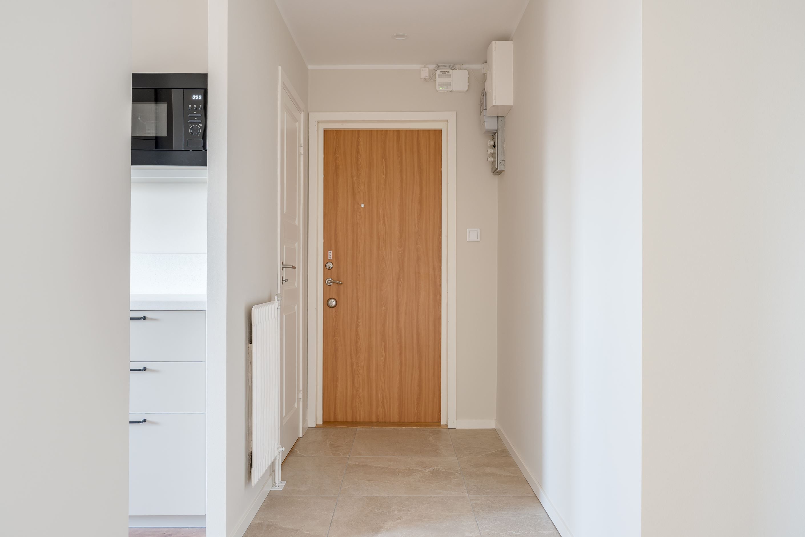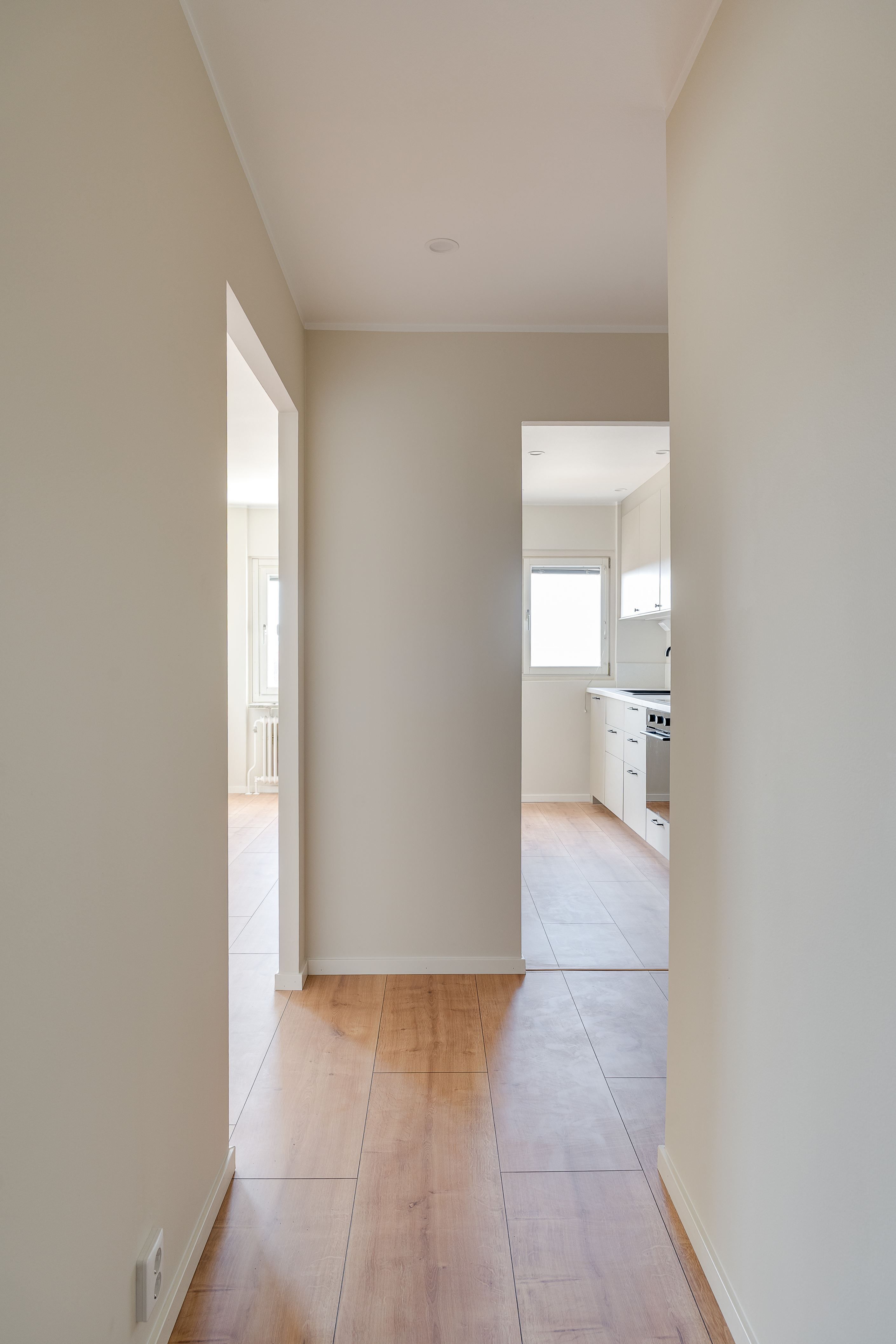 Köket är modernt och funktionellt med goda arbetsytor och stilrena materialval. Badrummet är helkaklat i moderna toner och erbjuder en fräsch och exklusiv känsla. Genomgående nya golv och ljusa väggar skapar ett ljust och enhetligt intryck i hela bostaden.