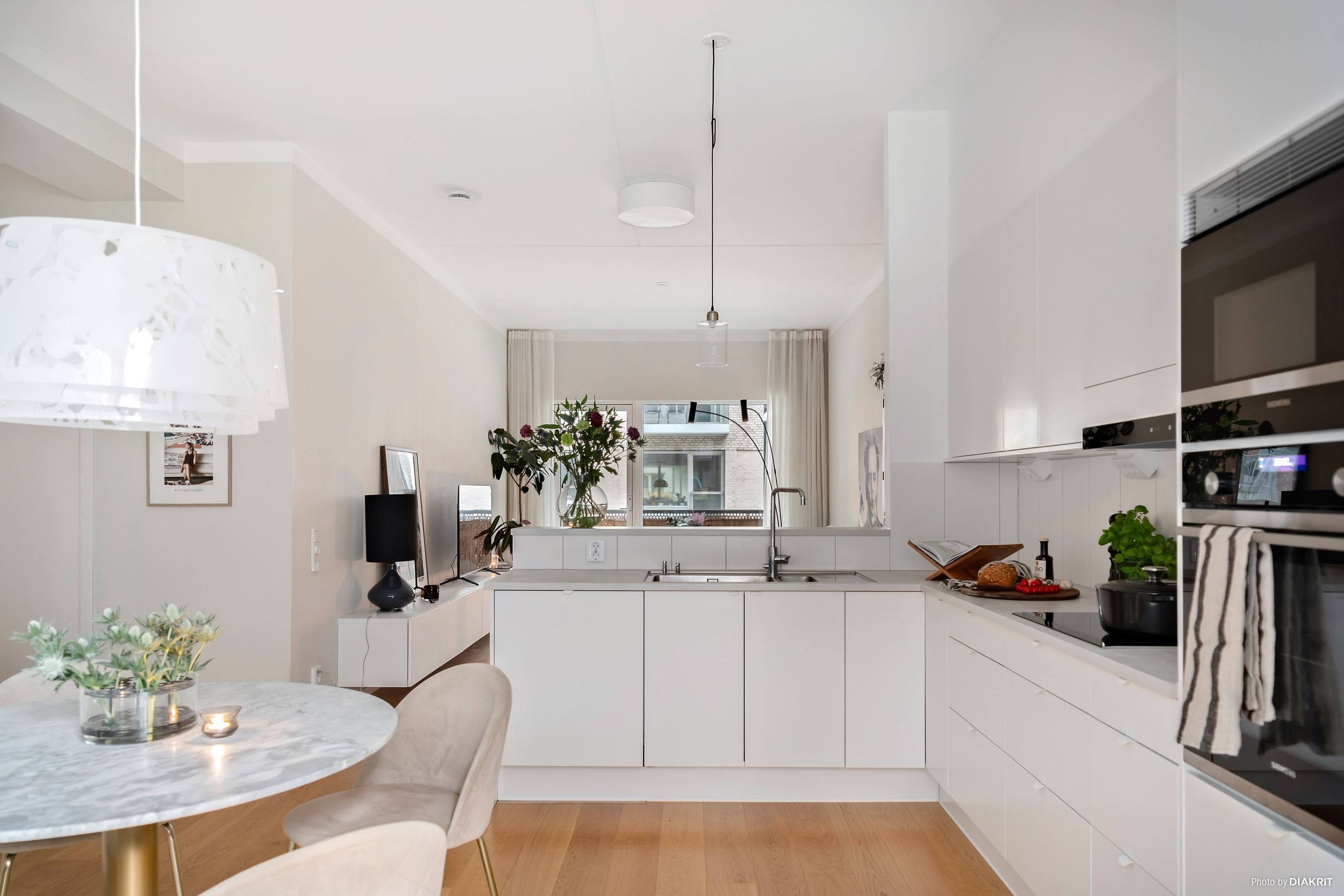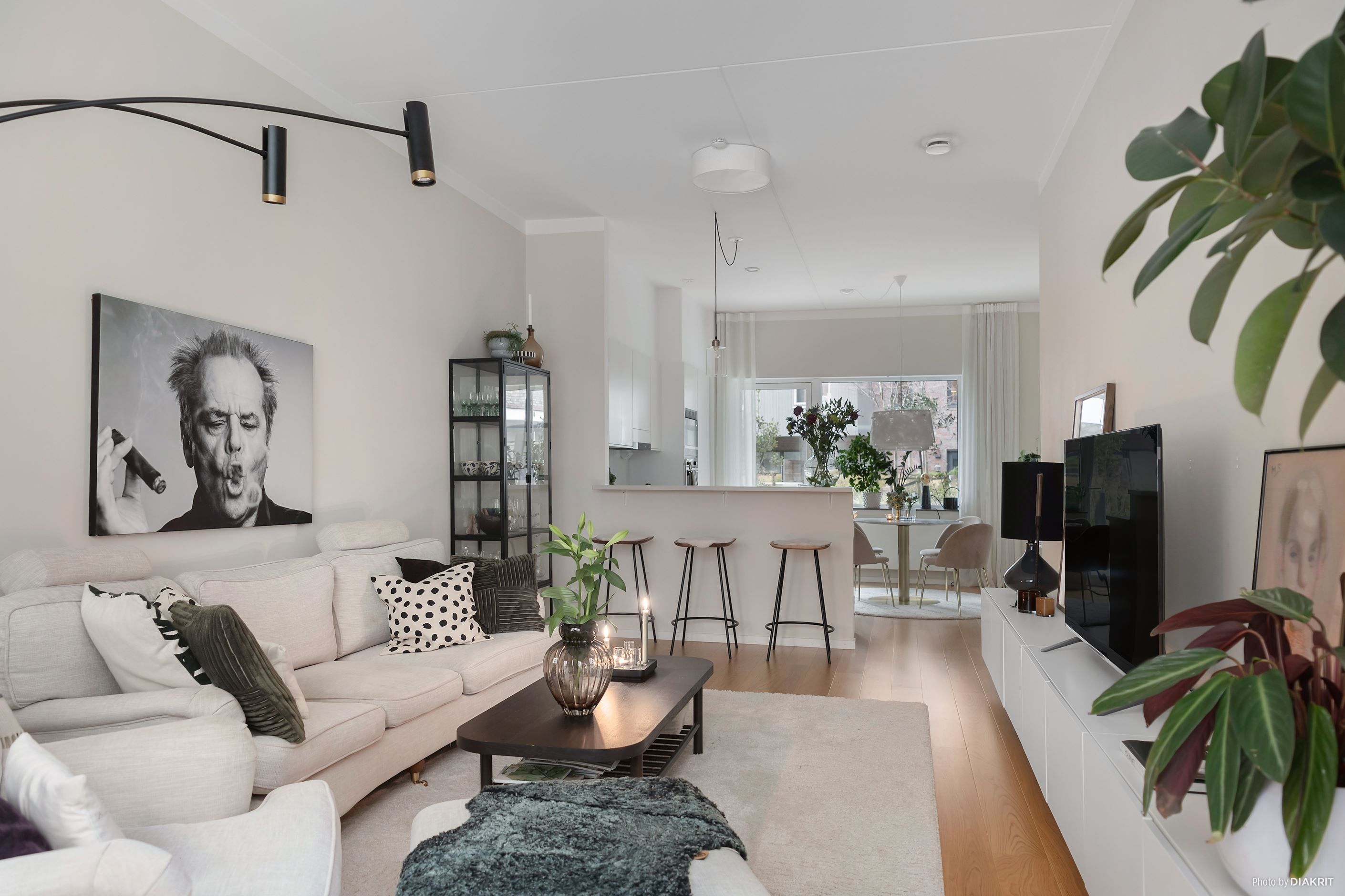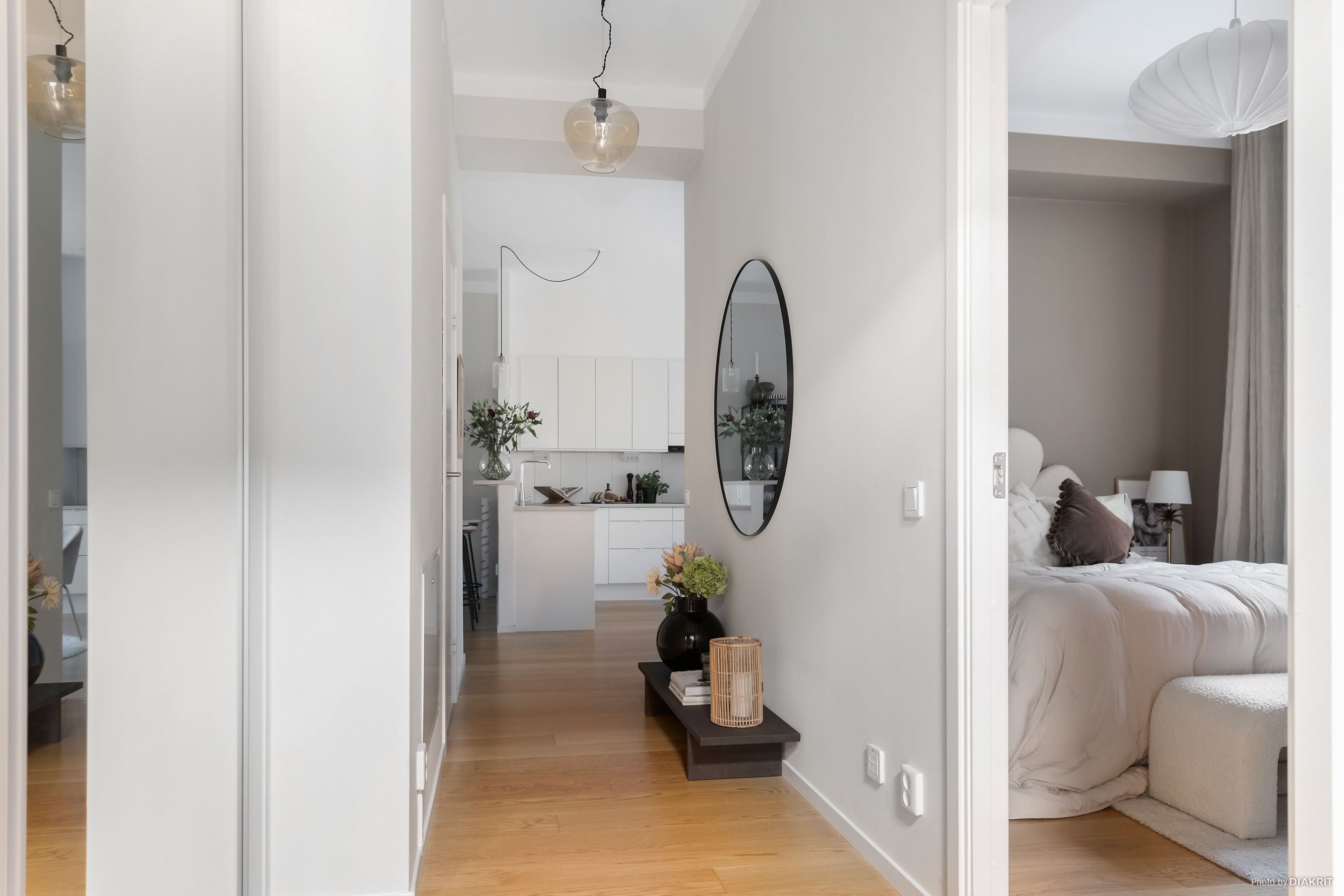 Lägenheten imponerar direkt med sin generösa takhöjd på 3 meter och en genomgående enhetlig golvbeläggning som skapar en harmonisk och rymlig känsla. Den öppna planlösningen mellan kök och vardagsrum gör detta till ett hem perfekt för både vardagsliv och sociala tillställningar.
