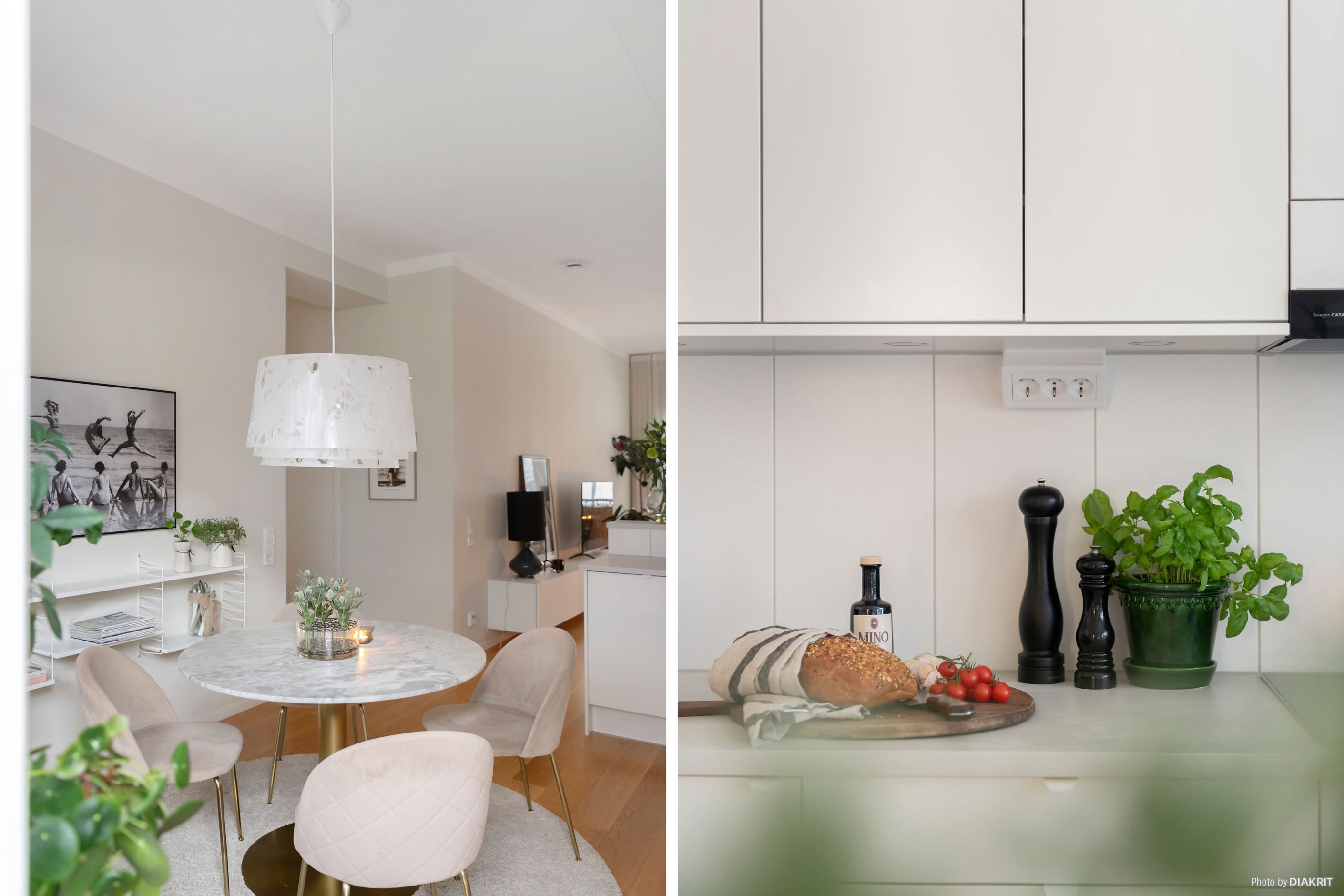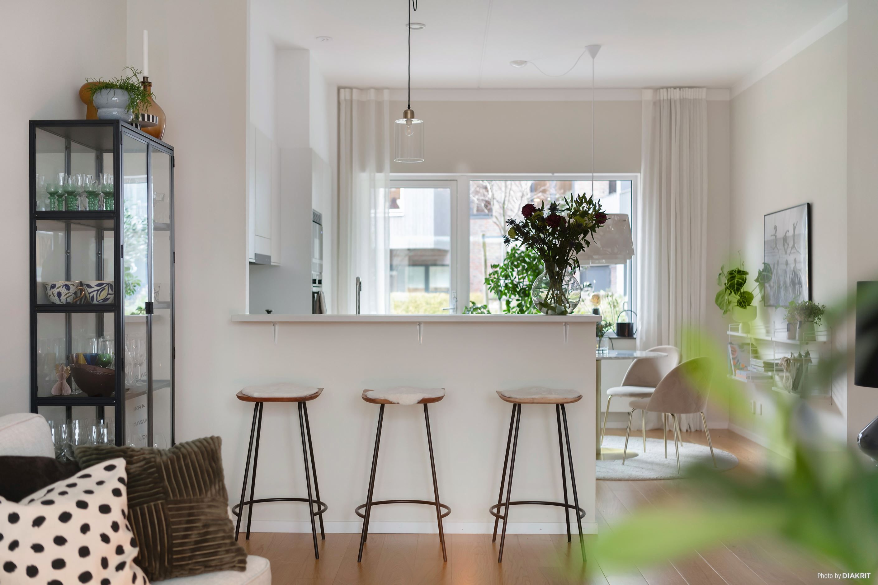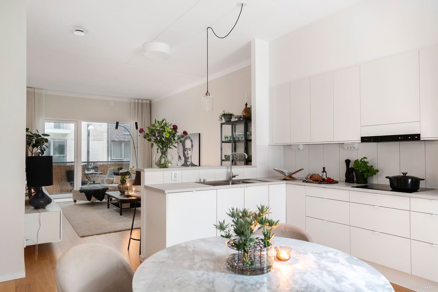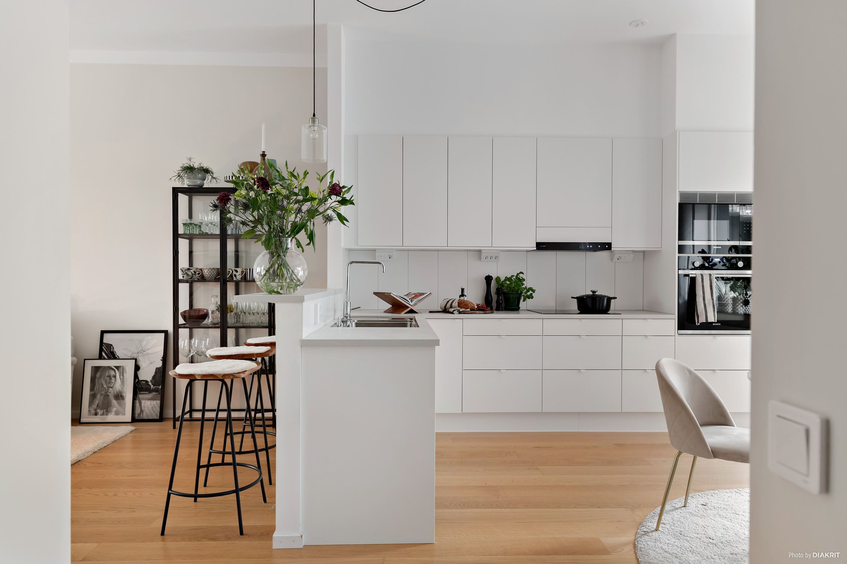 Lägenheten imponerar direkt med sin generösa takhöjd på 3 meter och en genomgående enhetlig golvbeläggning som skapar en harmonisk och rymlig känsla. Den öppna planlösningen mellan kök och vardagsrum gör detta till ett hem perfekt för både vardagsliv och sociala tillställningar.