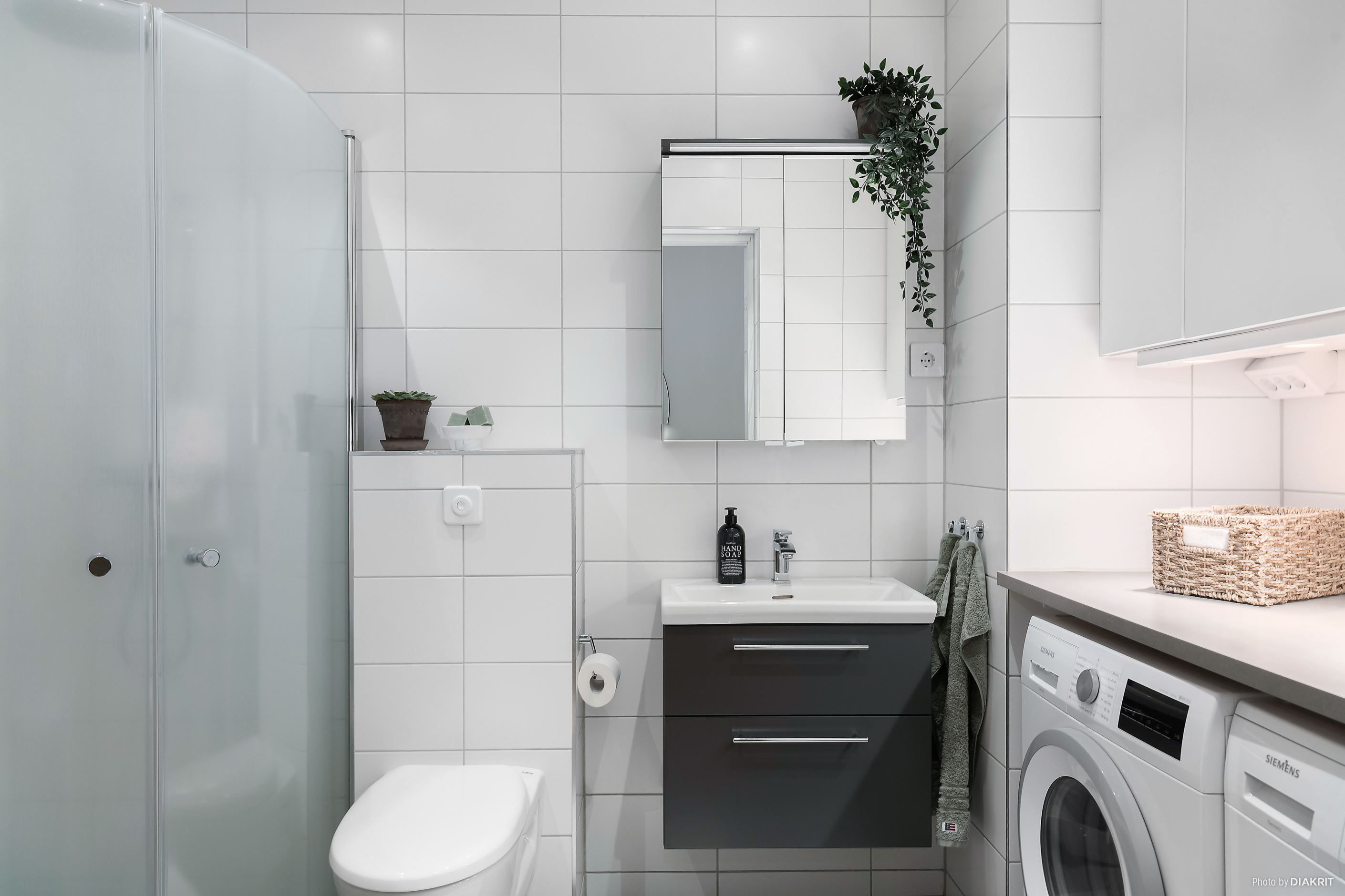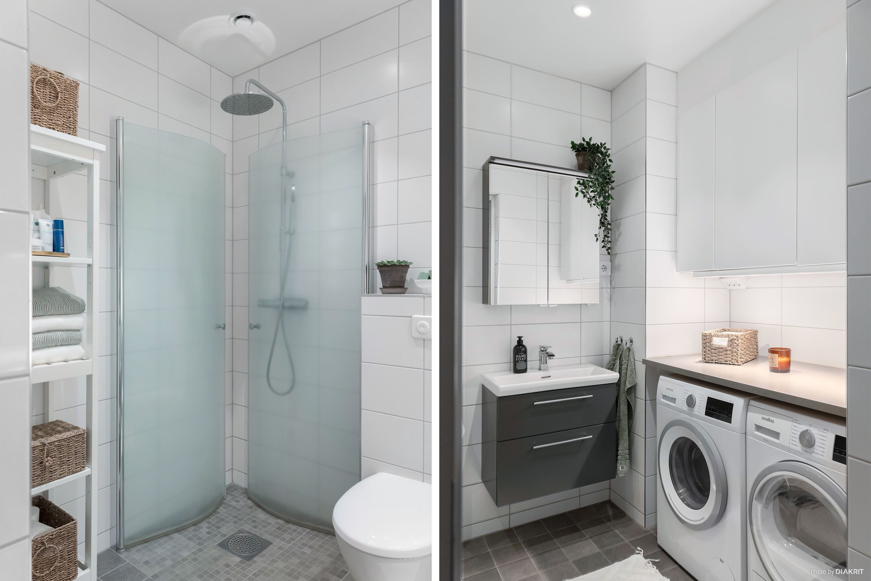 Det helkaklade badrummet är stilrent och funktionellt med både tvättmaskin och torktumlare, vilket gör vardagen smidigare.