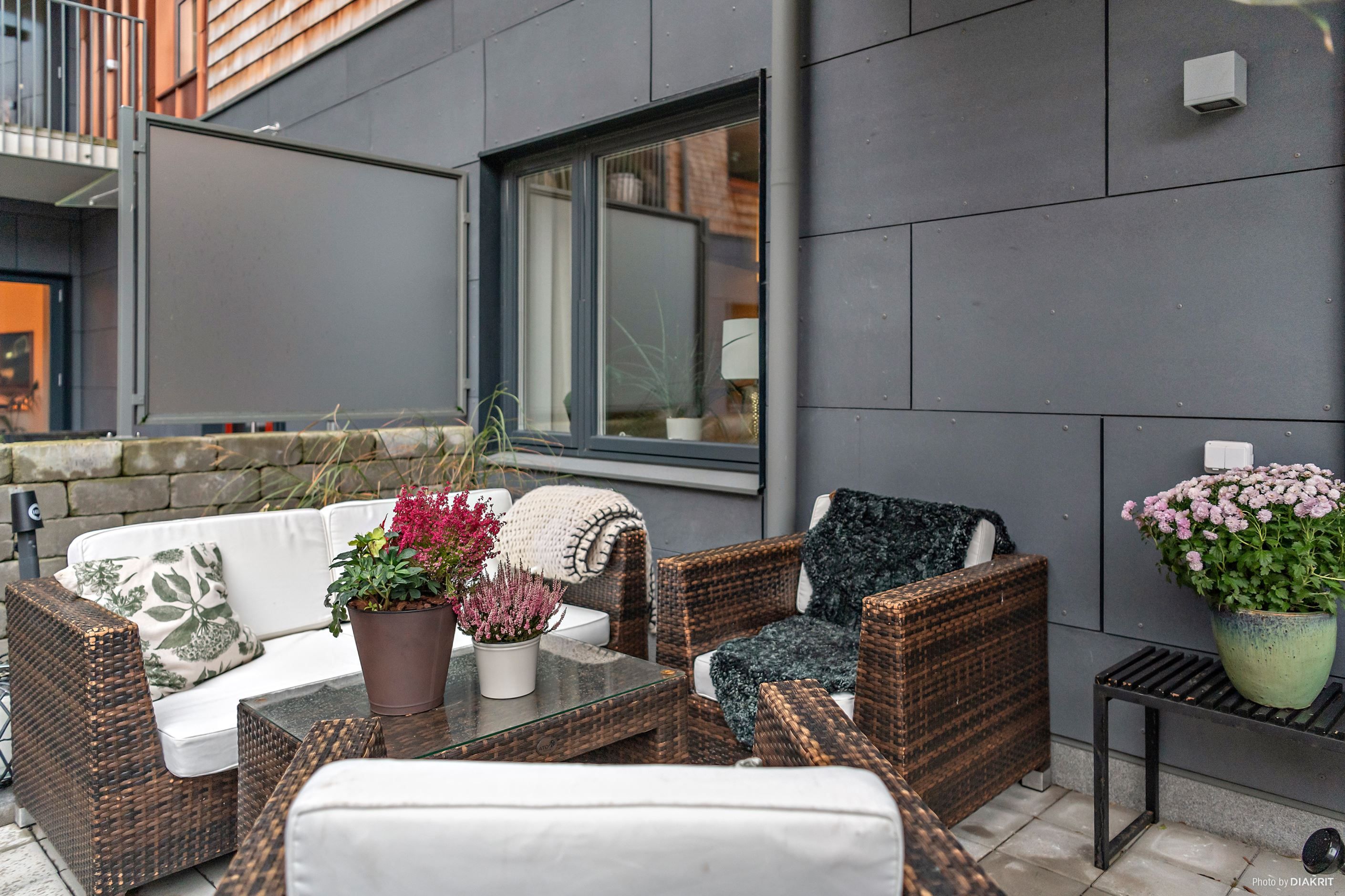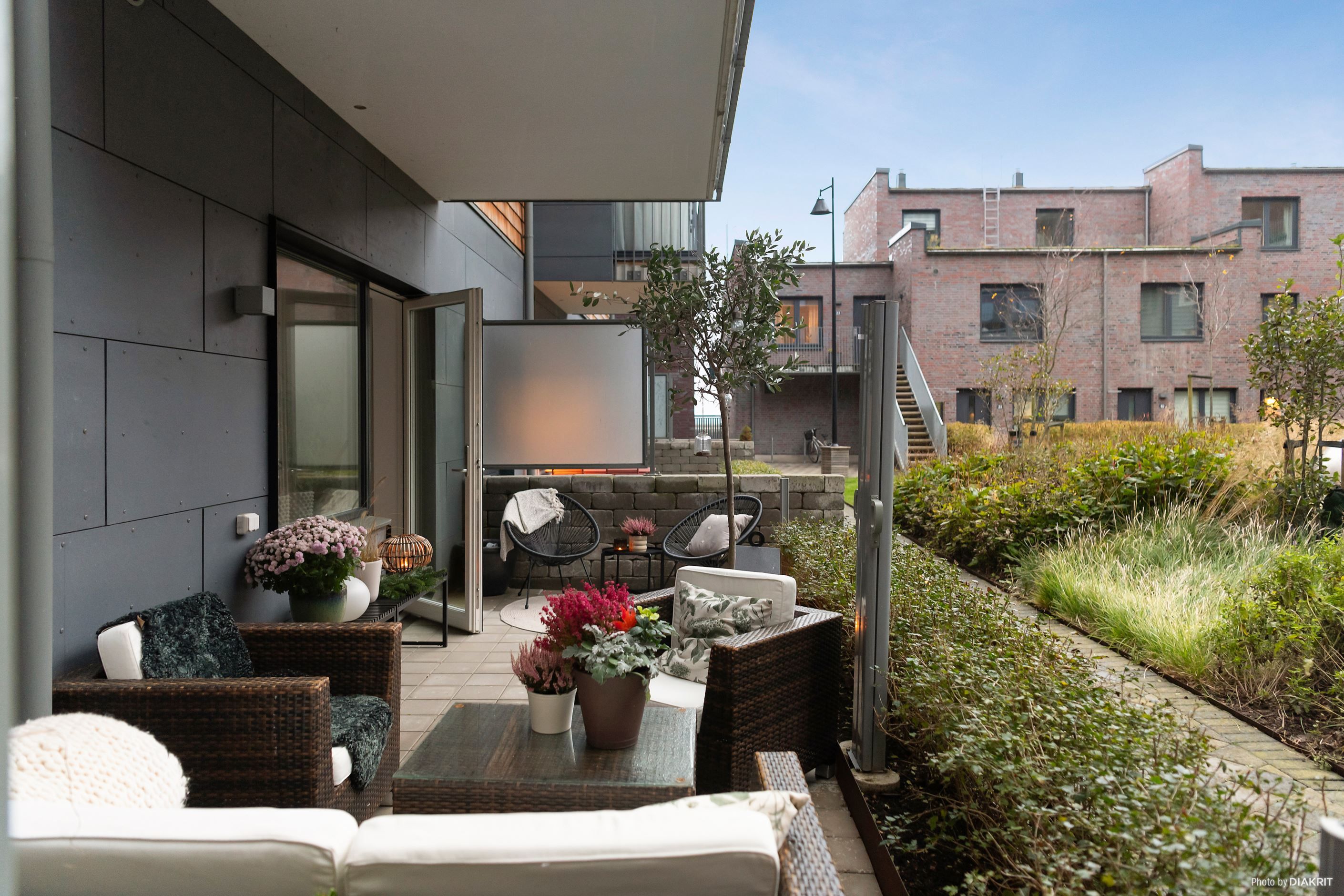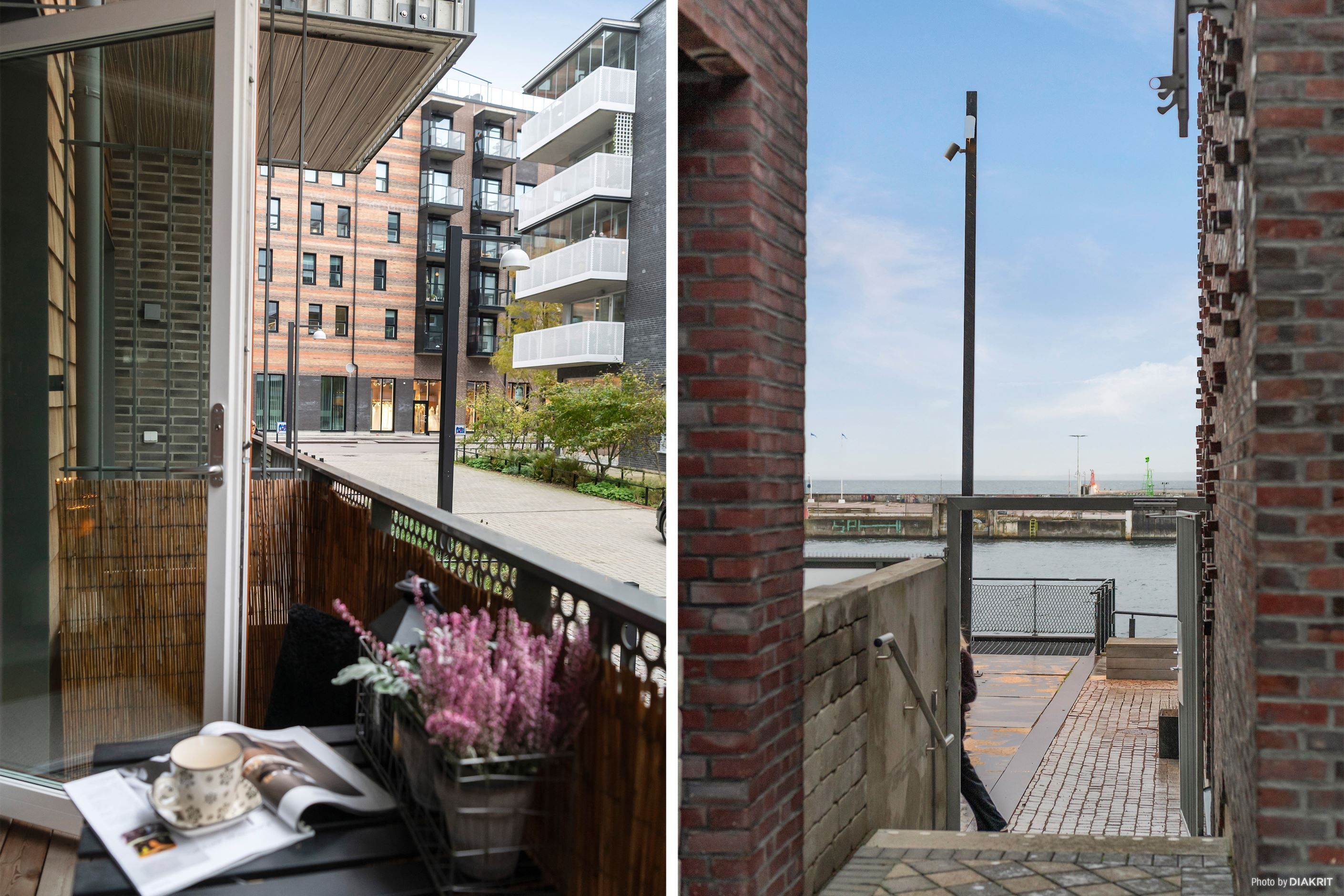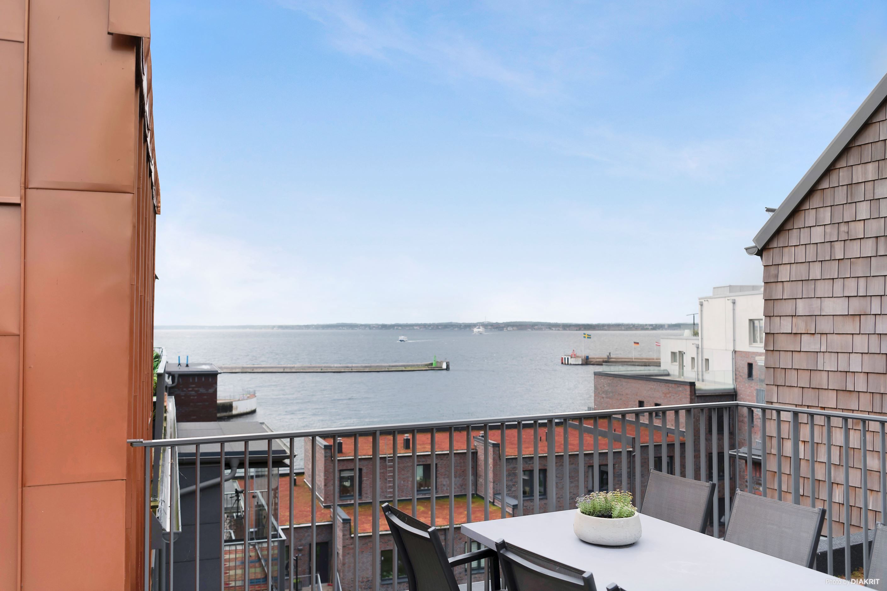 Det stora, smakfullt designade köket erbjuder gott om förvaring och arbetsytor – här kan du laga mat med stil! Från köket kliver du rakt ut på en rejäl stenlagd uteplats som bjuder in till sommarens grillkvällar och morgonkaffet i lugn och ro. Vardagsrummet har direkt access till en mysig balkong där du skymtar sundet.