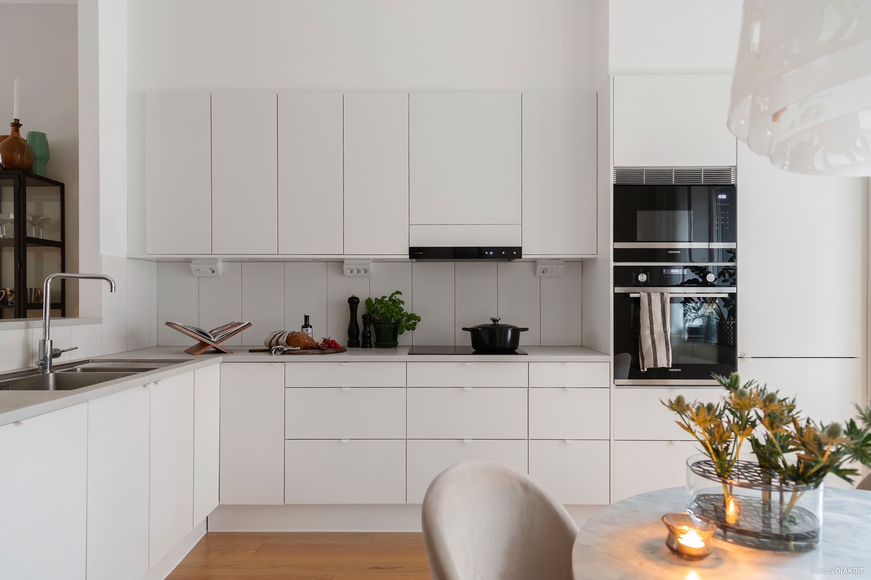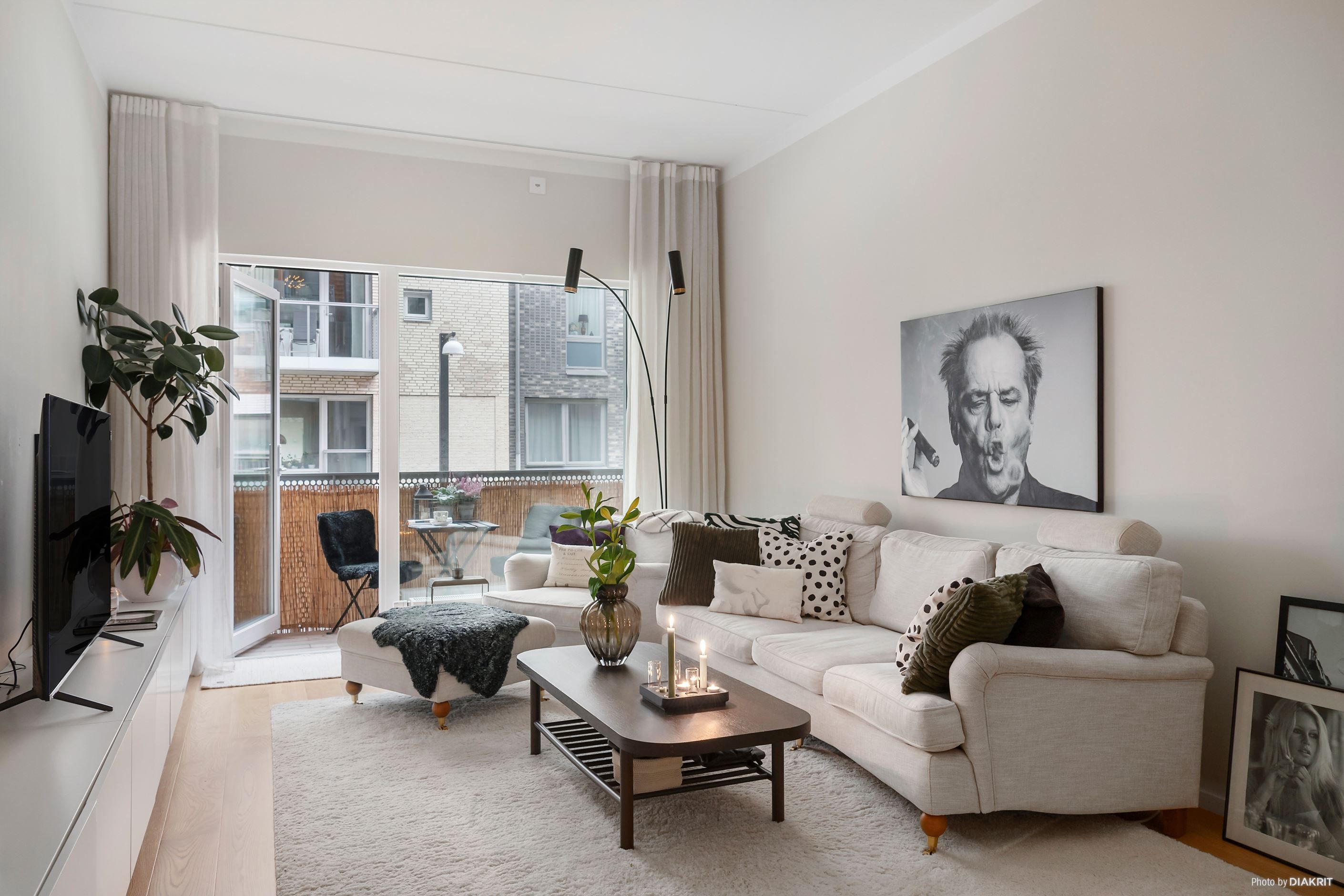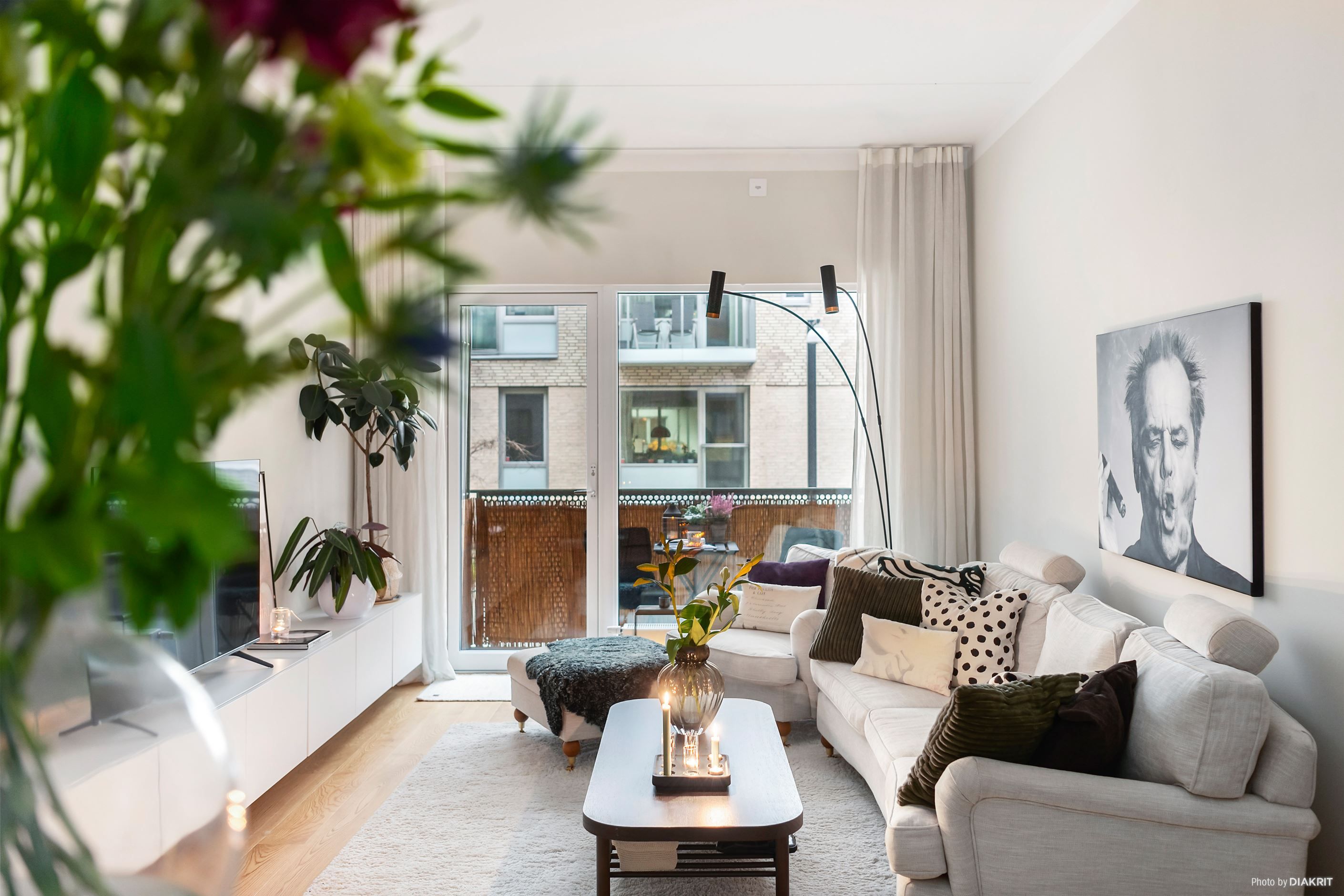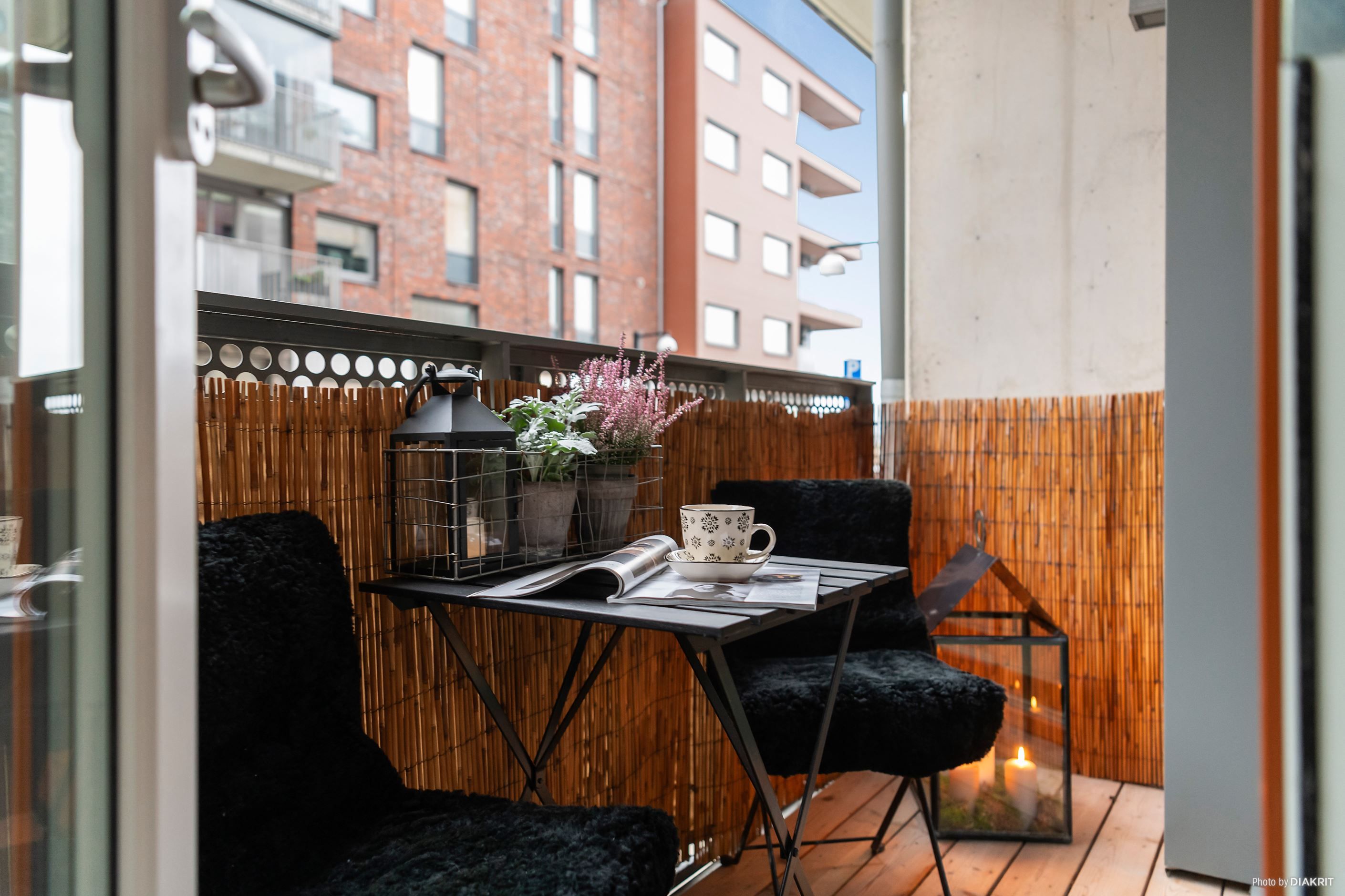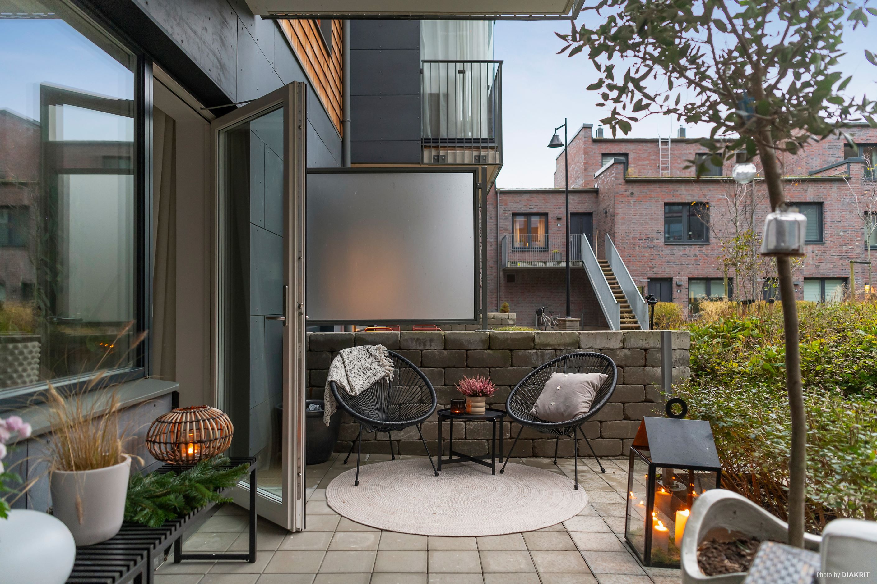 Det stora, smakfullt designade köket erbjuder gott om förvaring och arbetsytor – här kan du laga mat med stil! Från köket kliver du rakt ut på en rejäl stenlagd uteplats som bjuder in till sommarens grillkvällar och morgonkaffet i lugn och ro. Vardagsrummet har direkt access till en mysig balkong där du skymtar sundet.