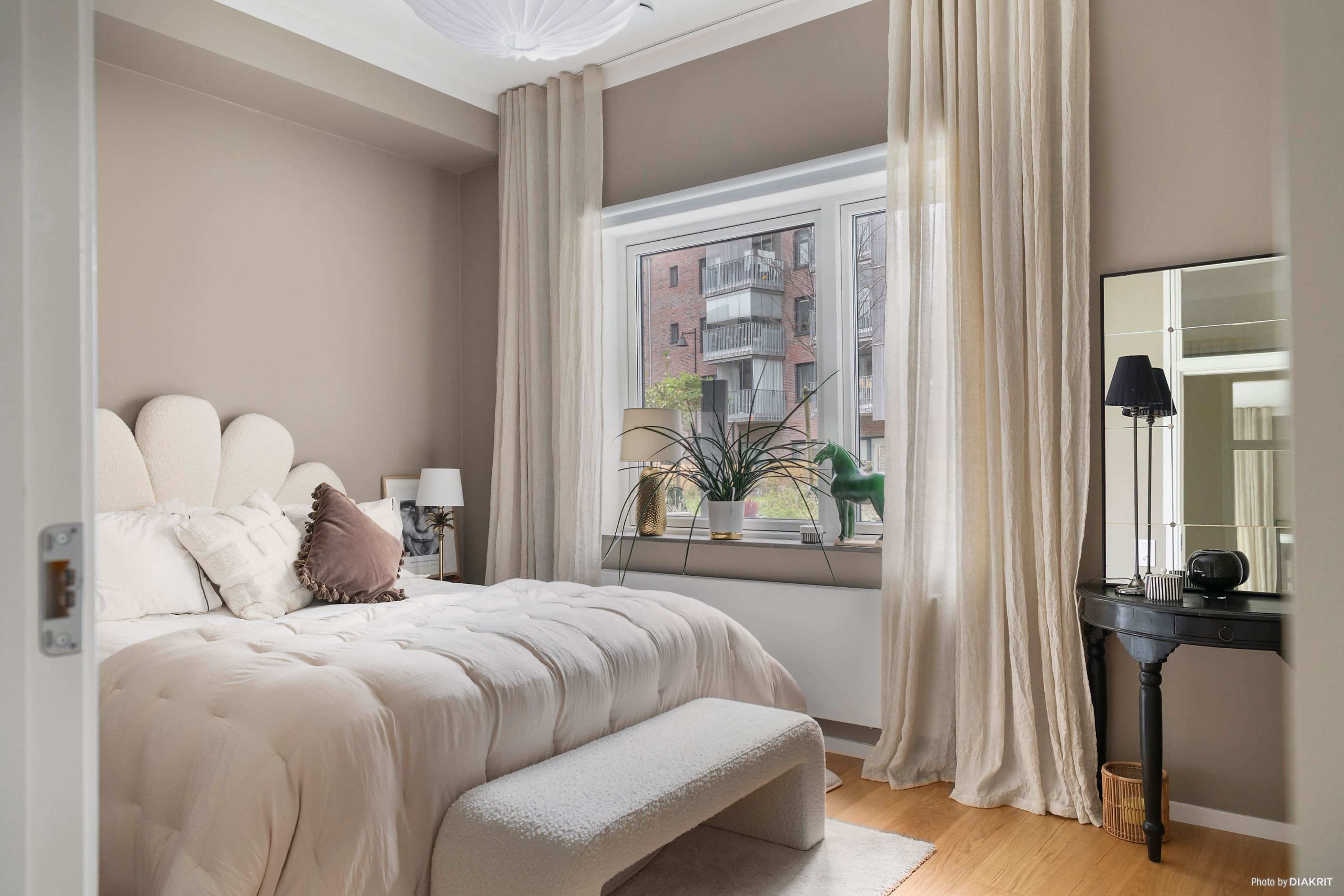 Det rogivande sovrummet rymmer både dubbelsäng och förvaring, tack vare en hel vägg med praktiska skjutdörrsgarderober. I hallen finns ytterligare garderobsförvaring i samma stil, vilket gör att du slipper kompromissa med ordningen.