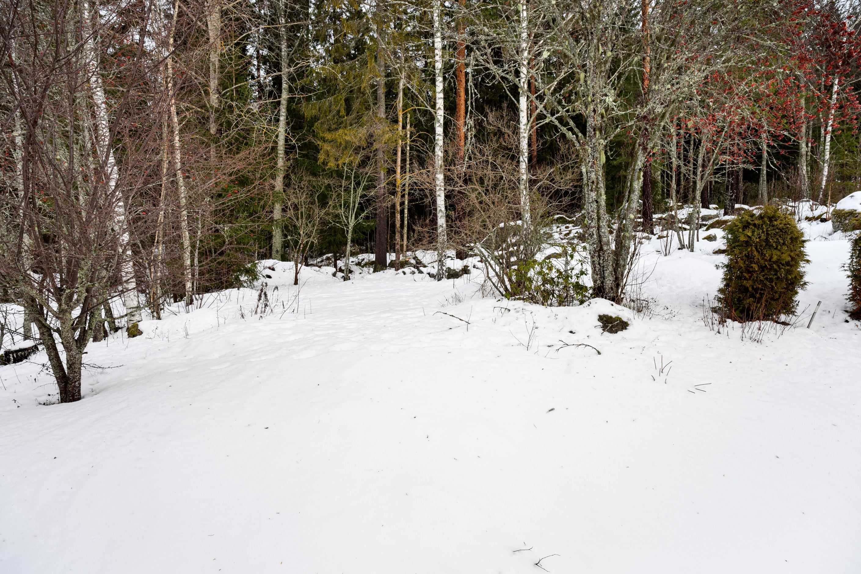 En trappa upp hittar du ytterligare två sovrum, ett ljust vardagsrum och ett kök med direkt utgång till uteplatsen. Här finns även ett badrum med dusch och WC. Tomten är rymlig och uppbyggd i etapper med flera ytor för både lek och avkoppling. Lekstuga och närheten till skogen gör att både barn och vuxna har gott om möjligheter att vara ute. Vinden rymmer extra förvaringsmöjligheter.