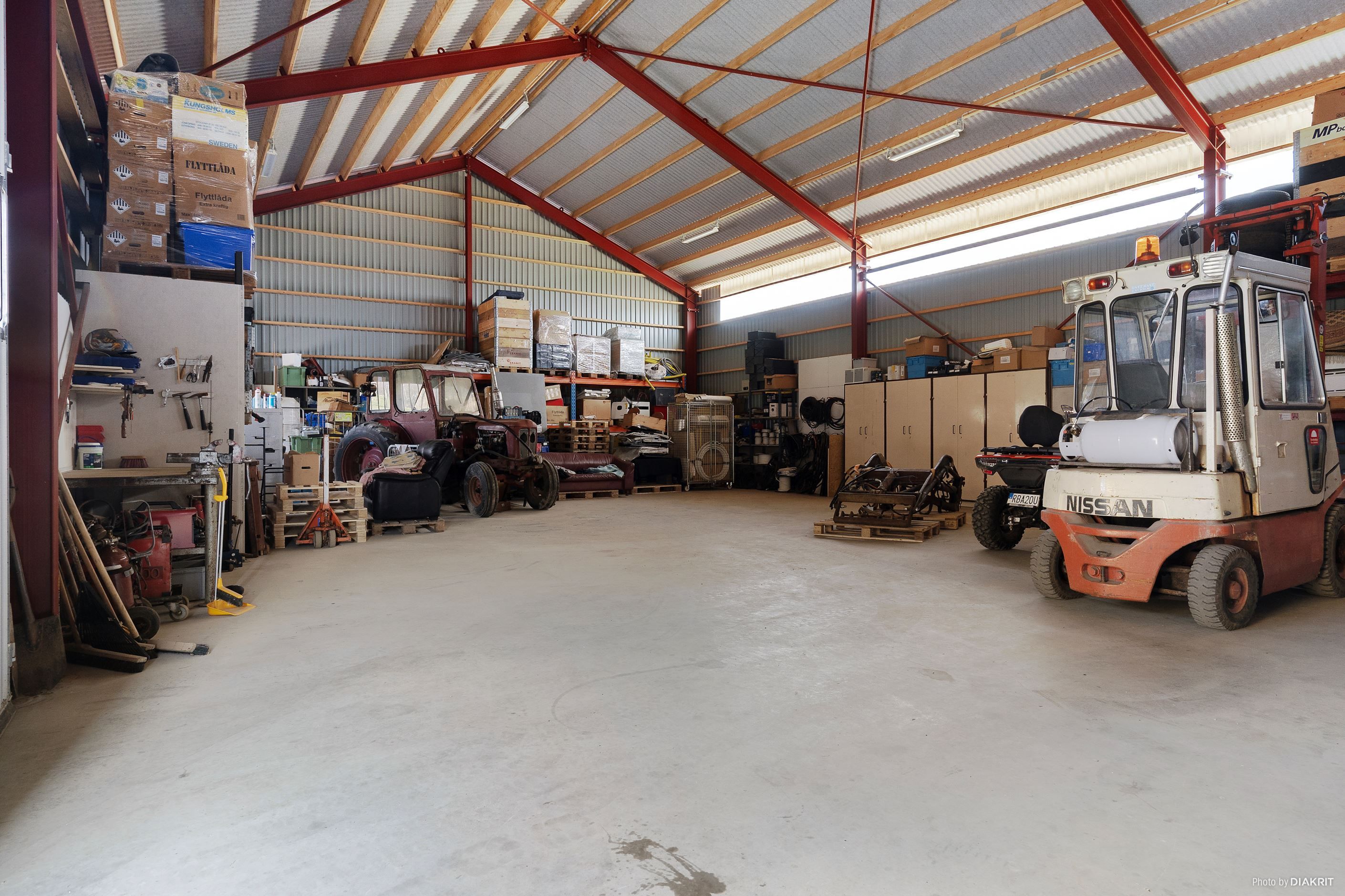 Logen erbjuder praktiska ytor med bland annat spolspilta, kylrum och goda förvaringsmöjligheter. Den rymliga maskinhallen om ca 215 kvm, uppförd 2022, är utrustad med två höga portar och lämpar sig väl för både maskiner och annan verksamhet.