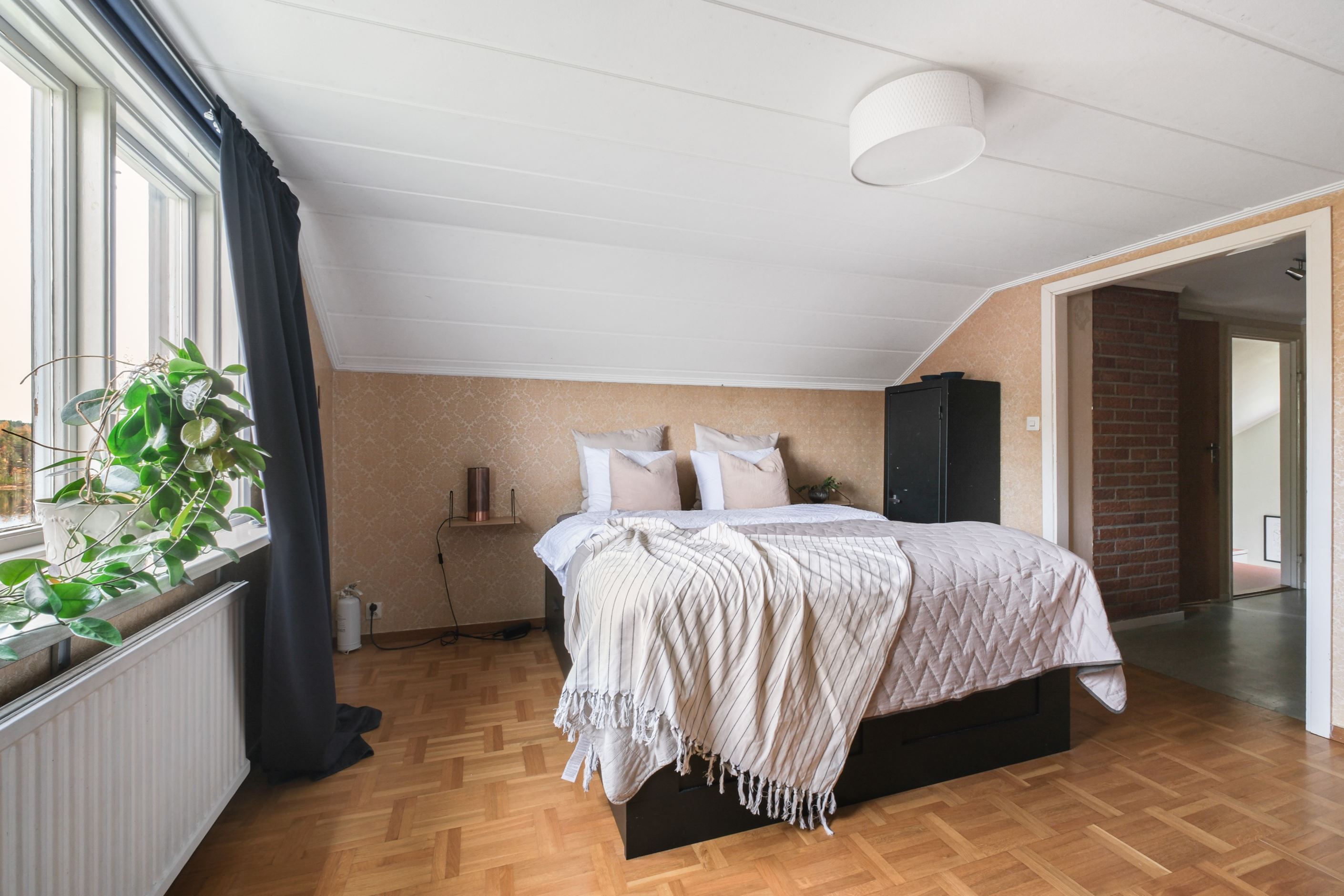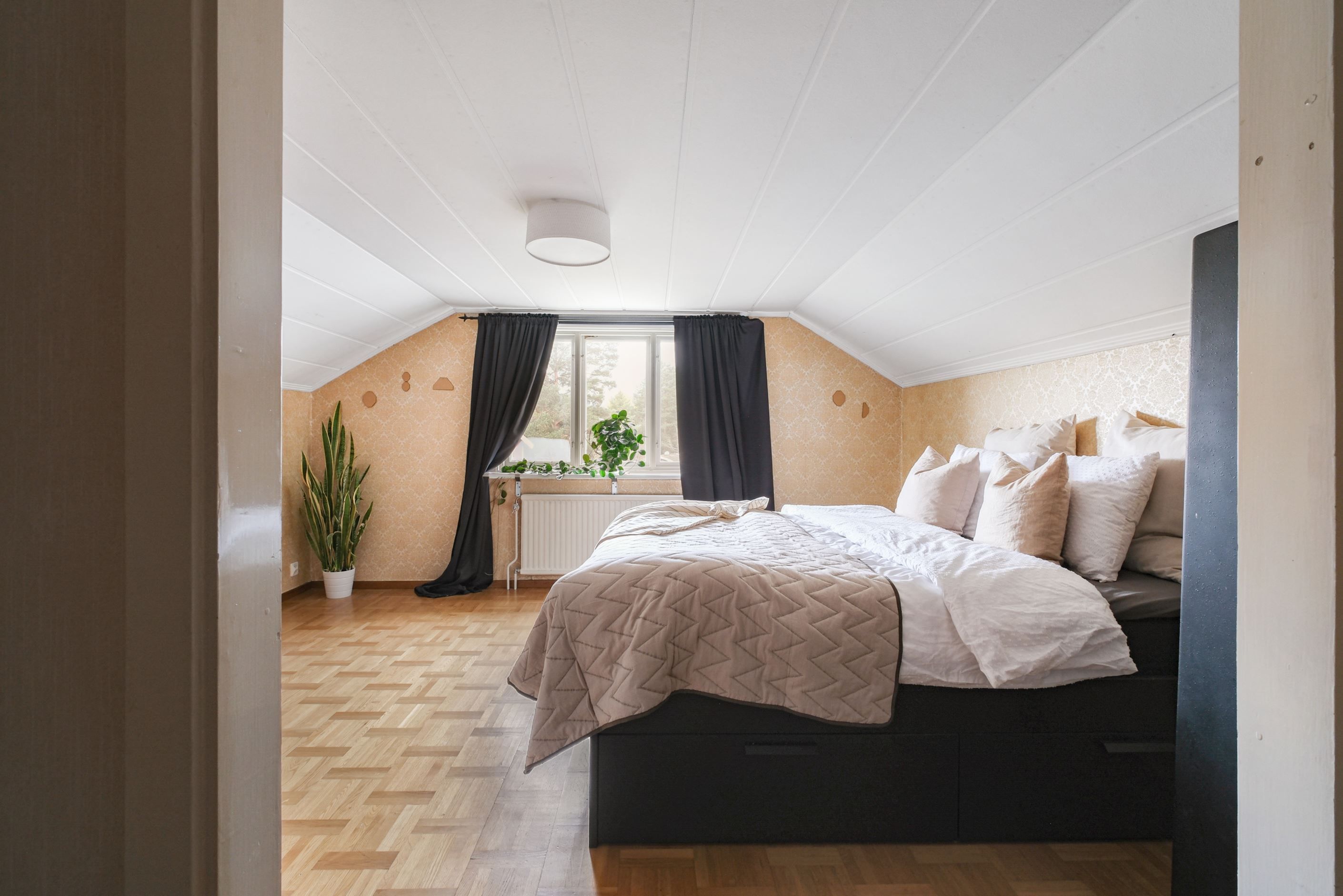 En trappa upp finns tre sovrum i varierande storlek, varav ett master bedroom. Från ett av rummen når du en balkong med fin vy över tomten. Här finns också ett badrum med wc och kommod samt plats för dusch eller badkar.