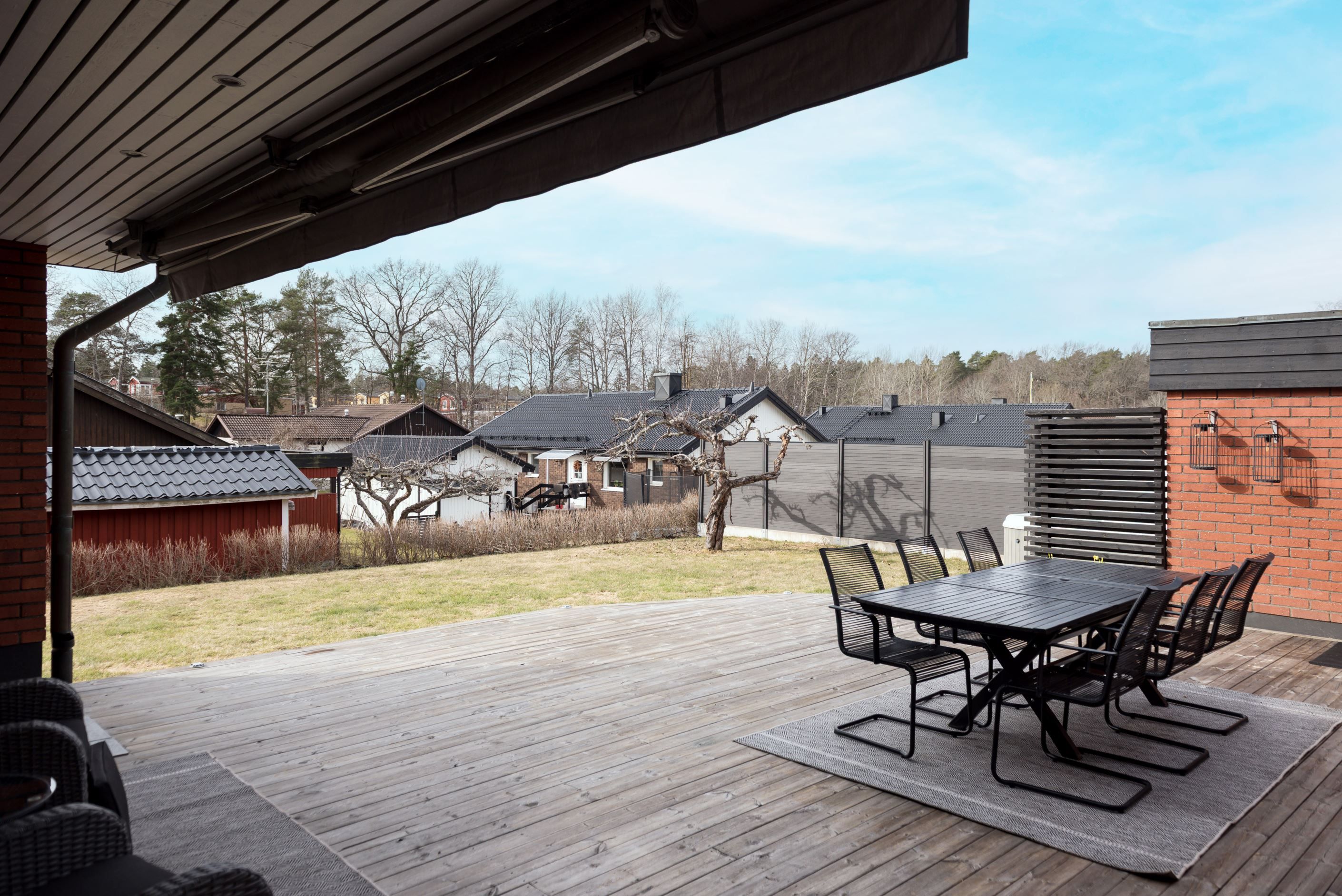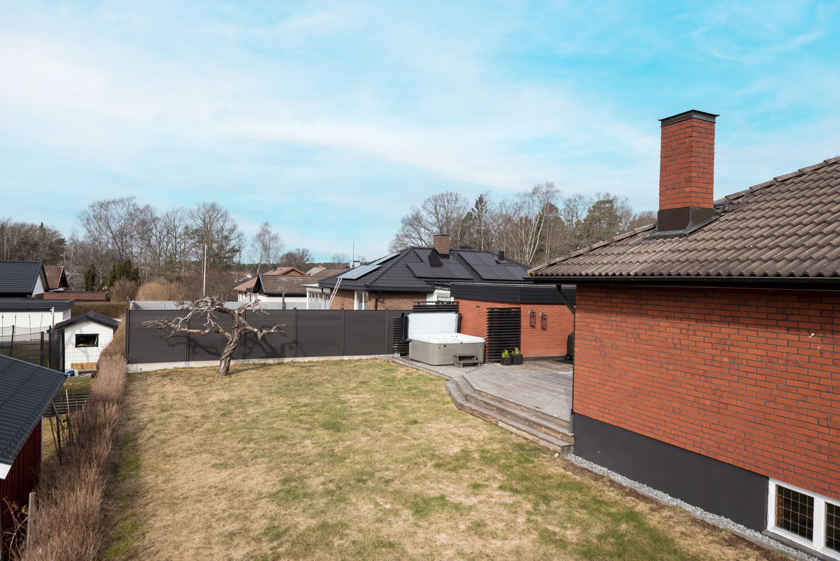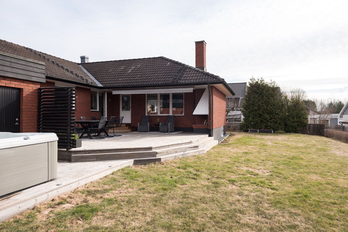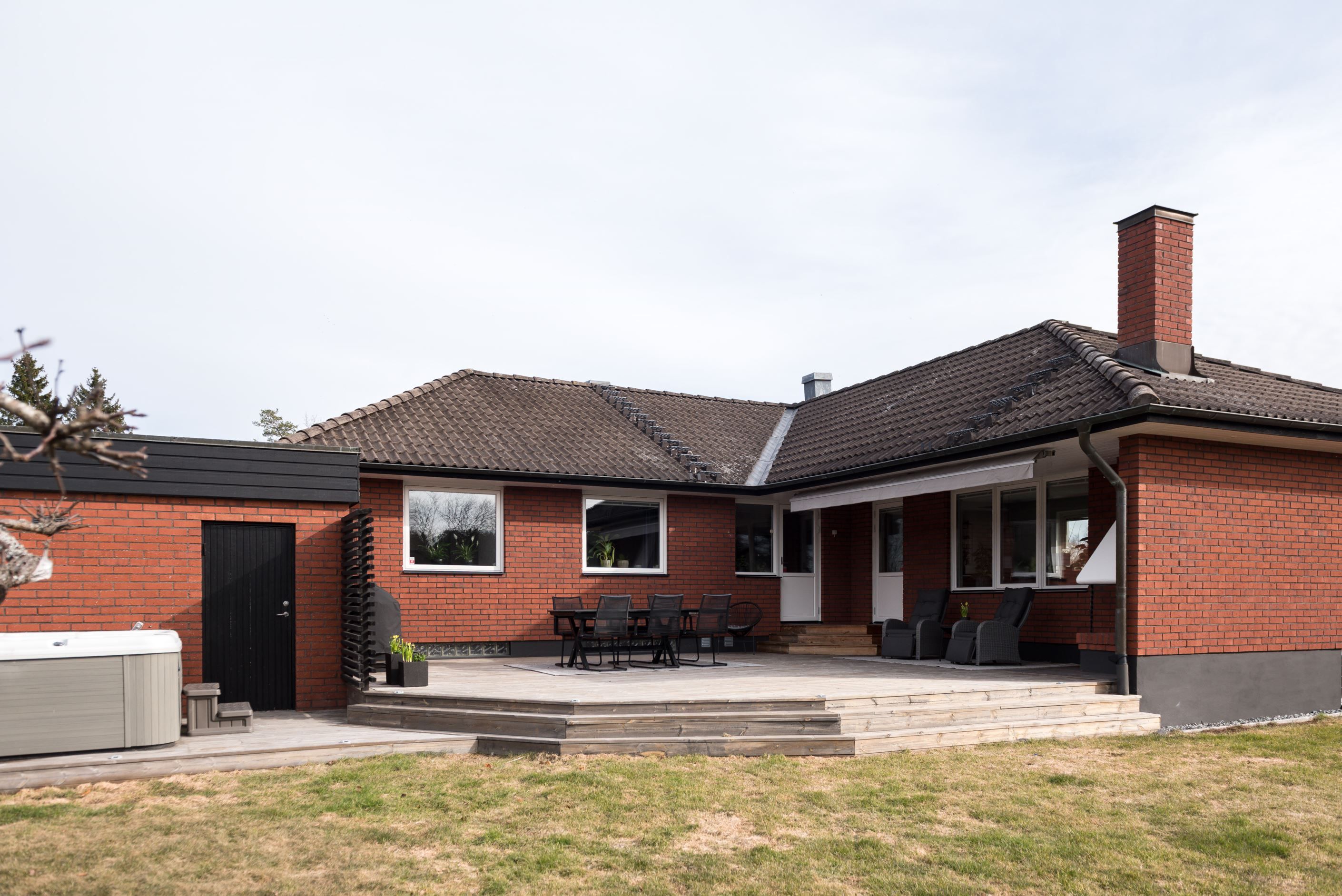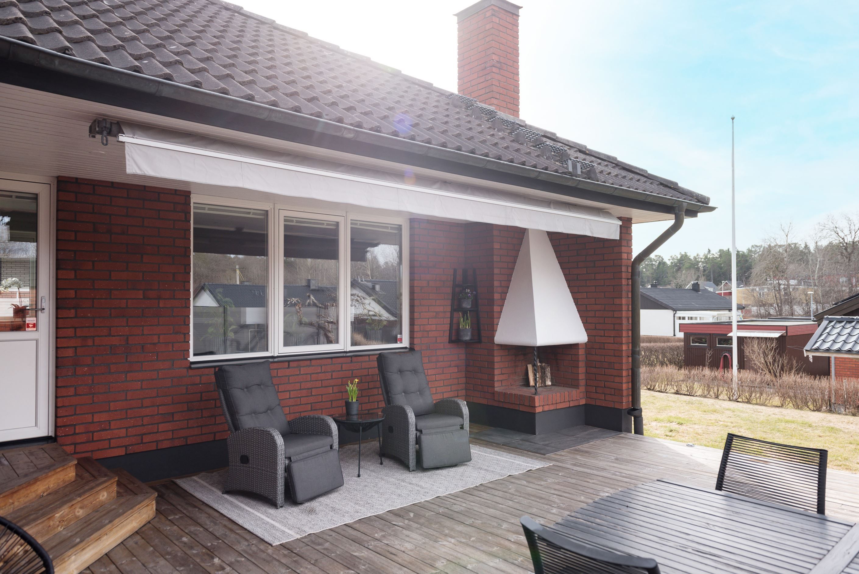 Köket är praktiskt utformat med goda arbetsytor och förvaring, vilket gör det till en självklar plats för både matlagning och socialt umgänge. Vardagsrummet upplevs rymligt och lättmöblerat, med plats för både soffgrupp och matsalsdel. Från bostaden nås även uteplatsen/altanen med eldstad och spabad, som blir en naturlig förlängning av hemmet under årets varmare månader – perfekt för morgonkaffet, middagar eller avkoppling i solen.