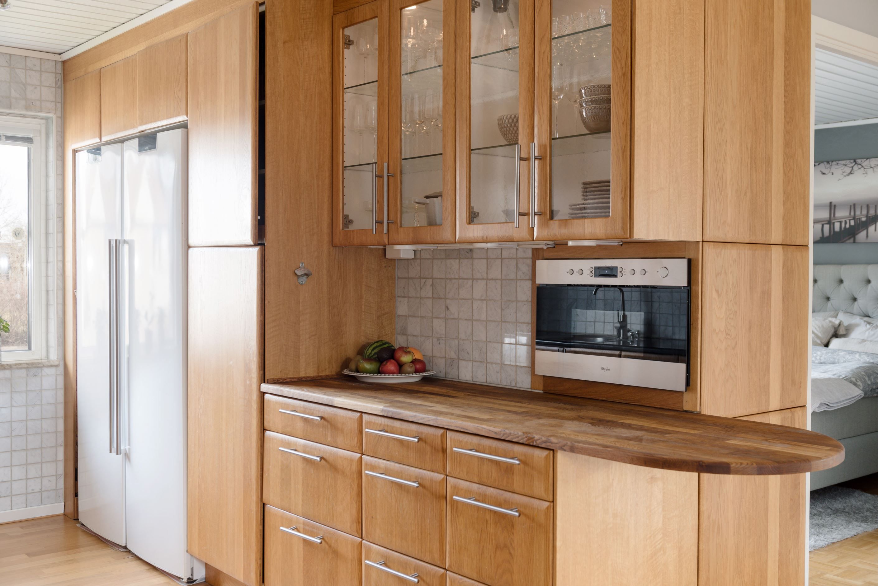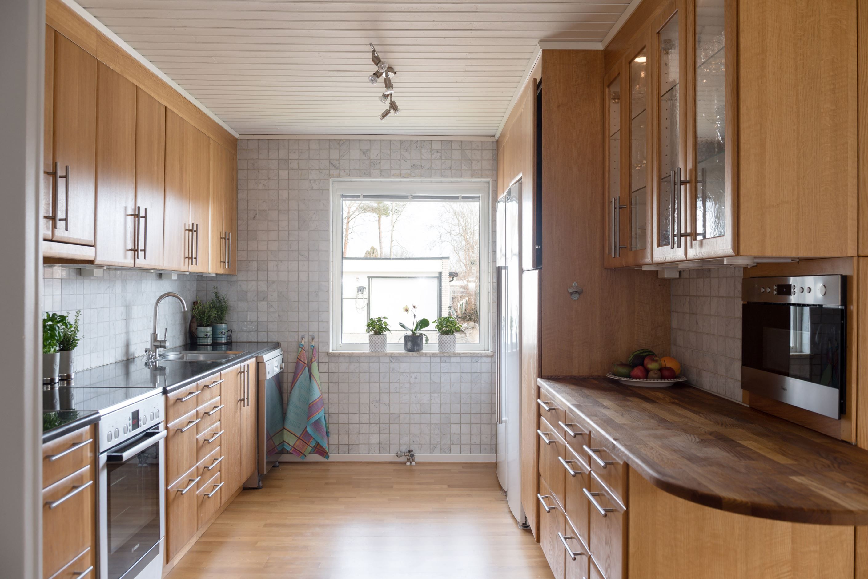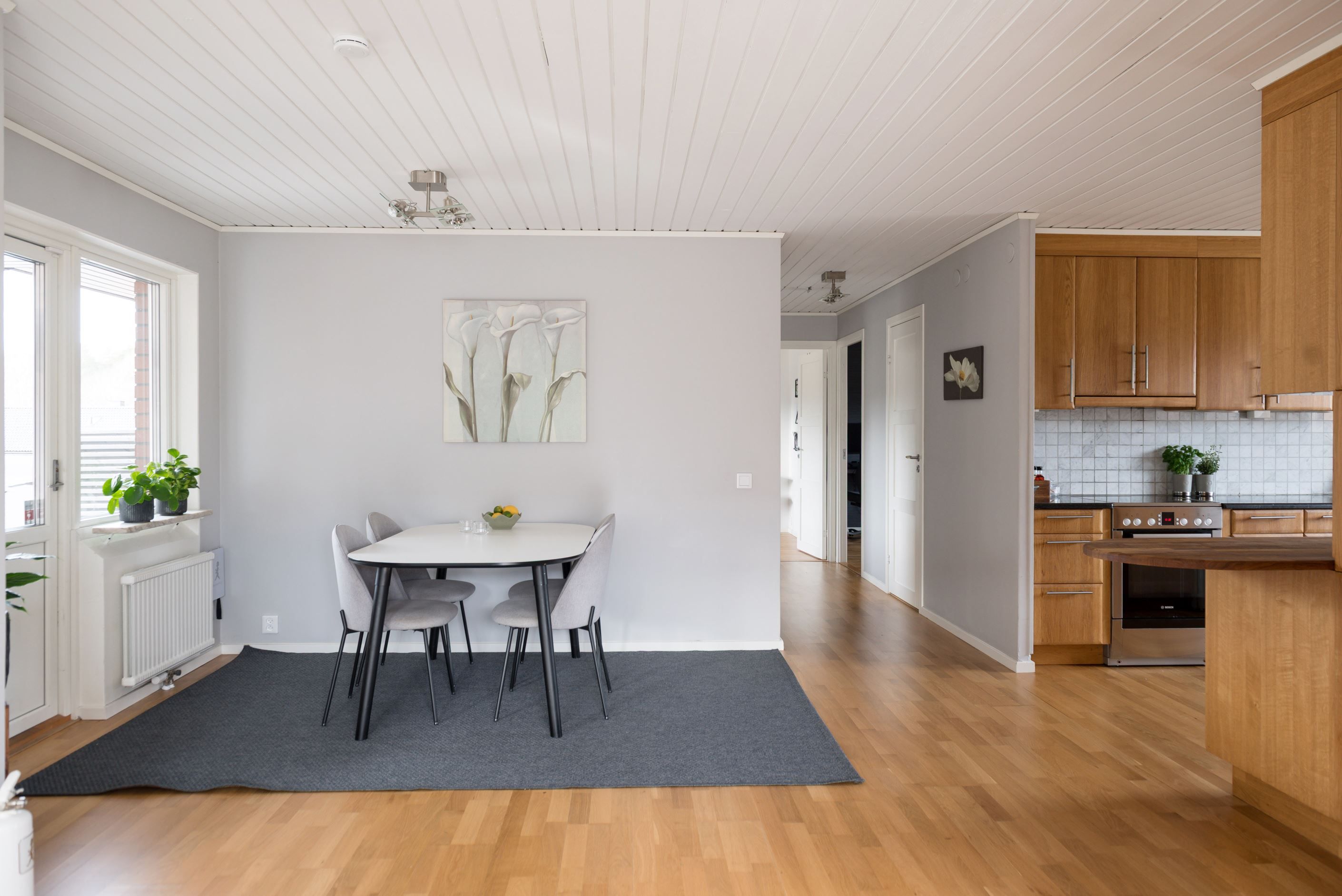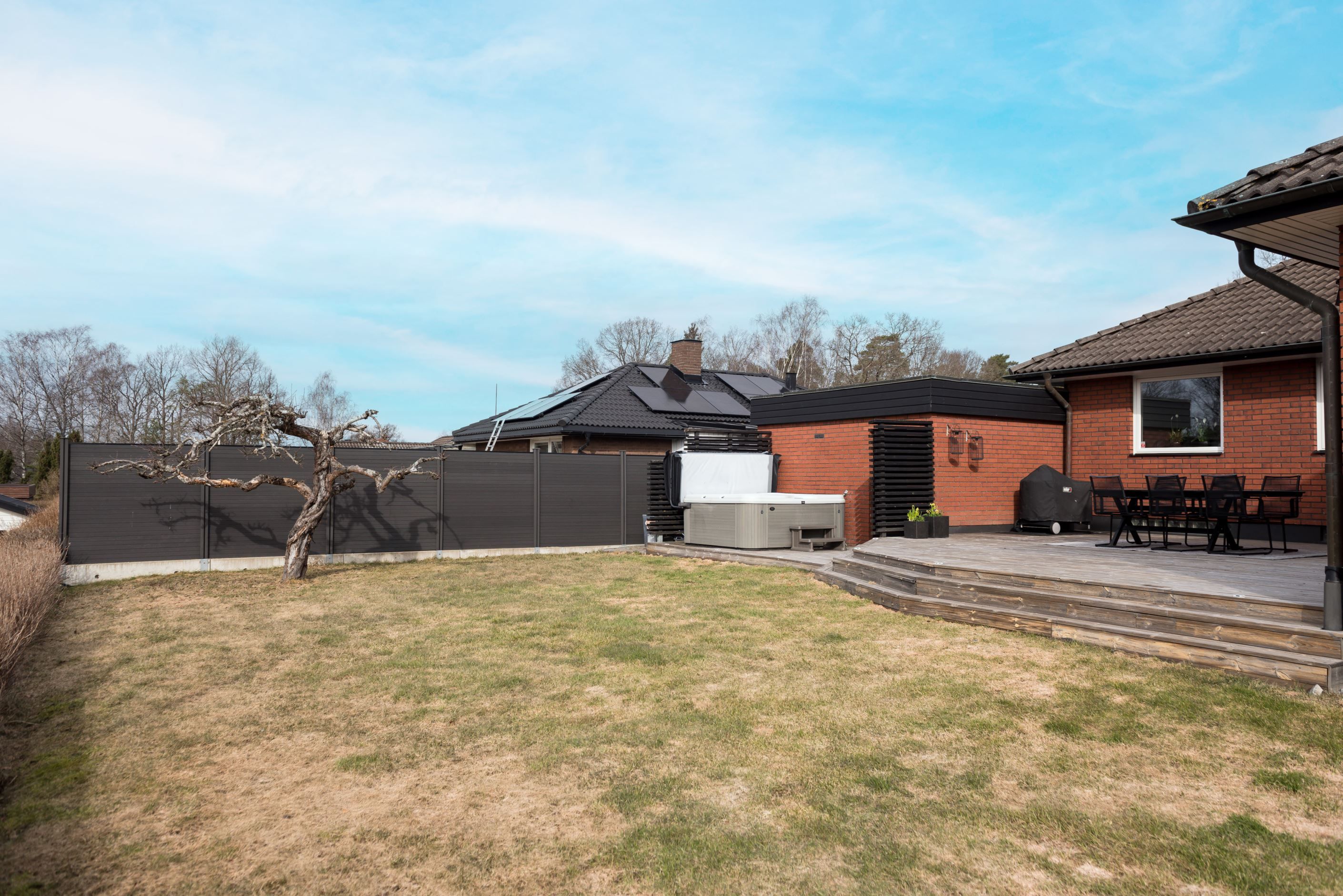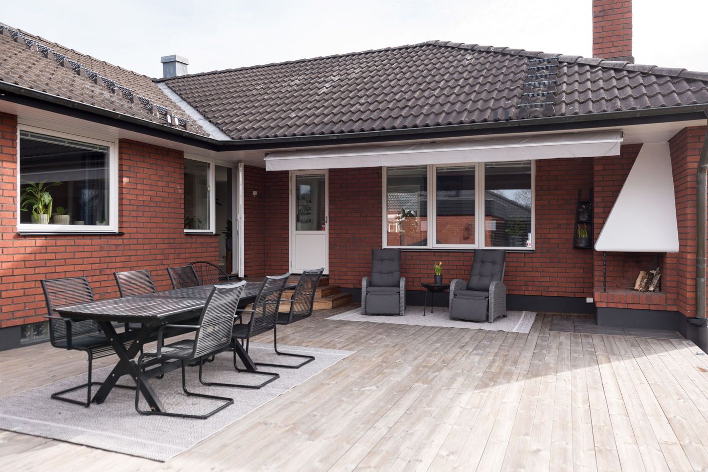 Köket är praktiskt utformat med goda arbetsytor och förvaring, vilket gör det till en självklar plats för både matlagning och socialt umgänge. Vardagsrummet upplevs rymligt och lättmöblerat, med plats för både soffgrupp och matsalsdel. Från bostaden nås även uteplatsen/altanen med eldstad och spabad, som blir en naturlig förlängning av hemmet under årets varmare månader – perfekt för morgonkaffet, middagar eller avkoppling i solen.