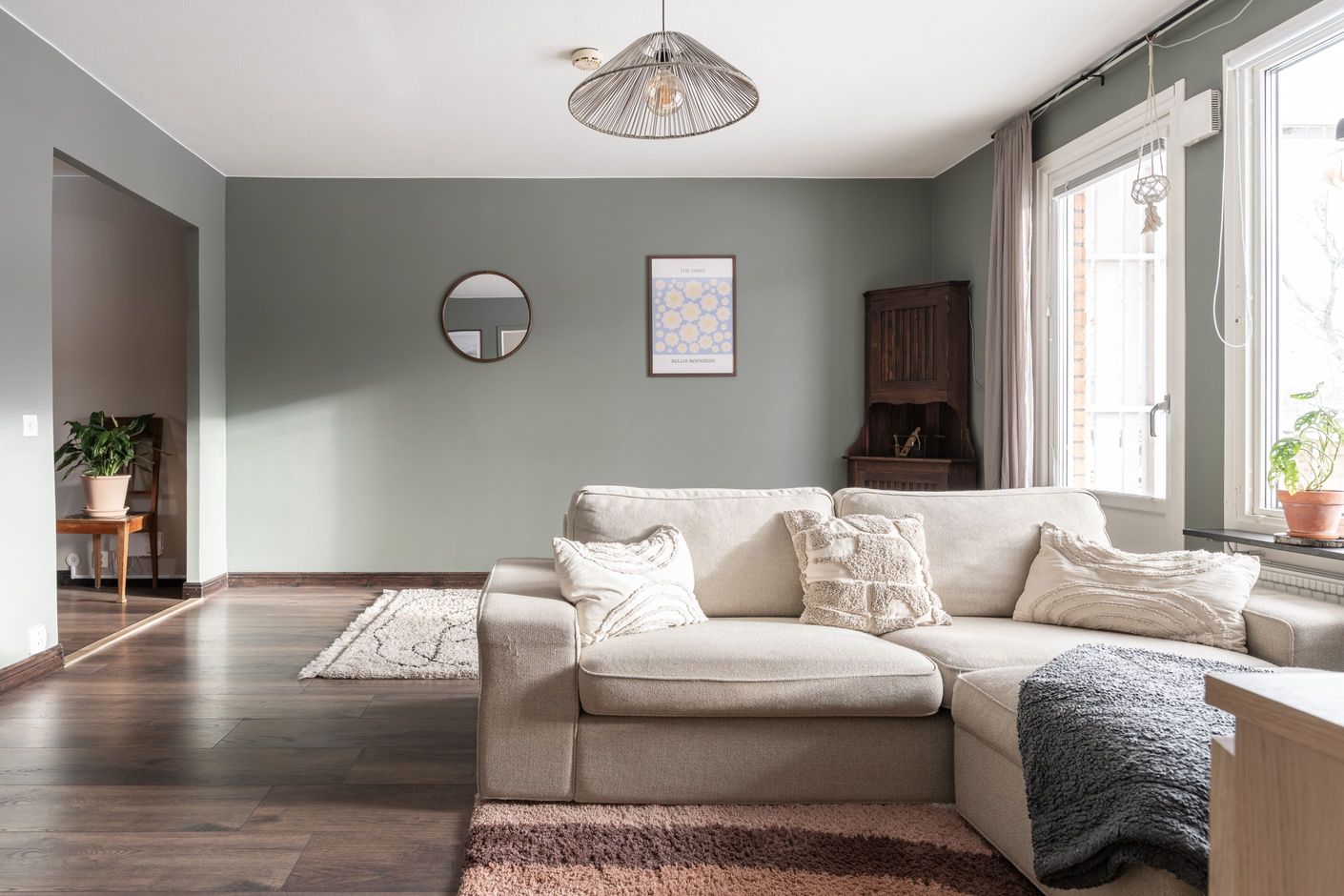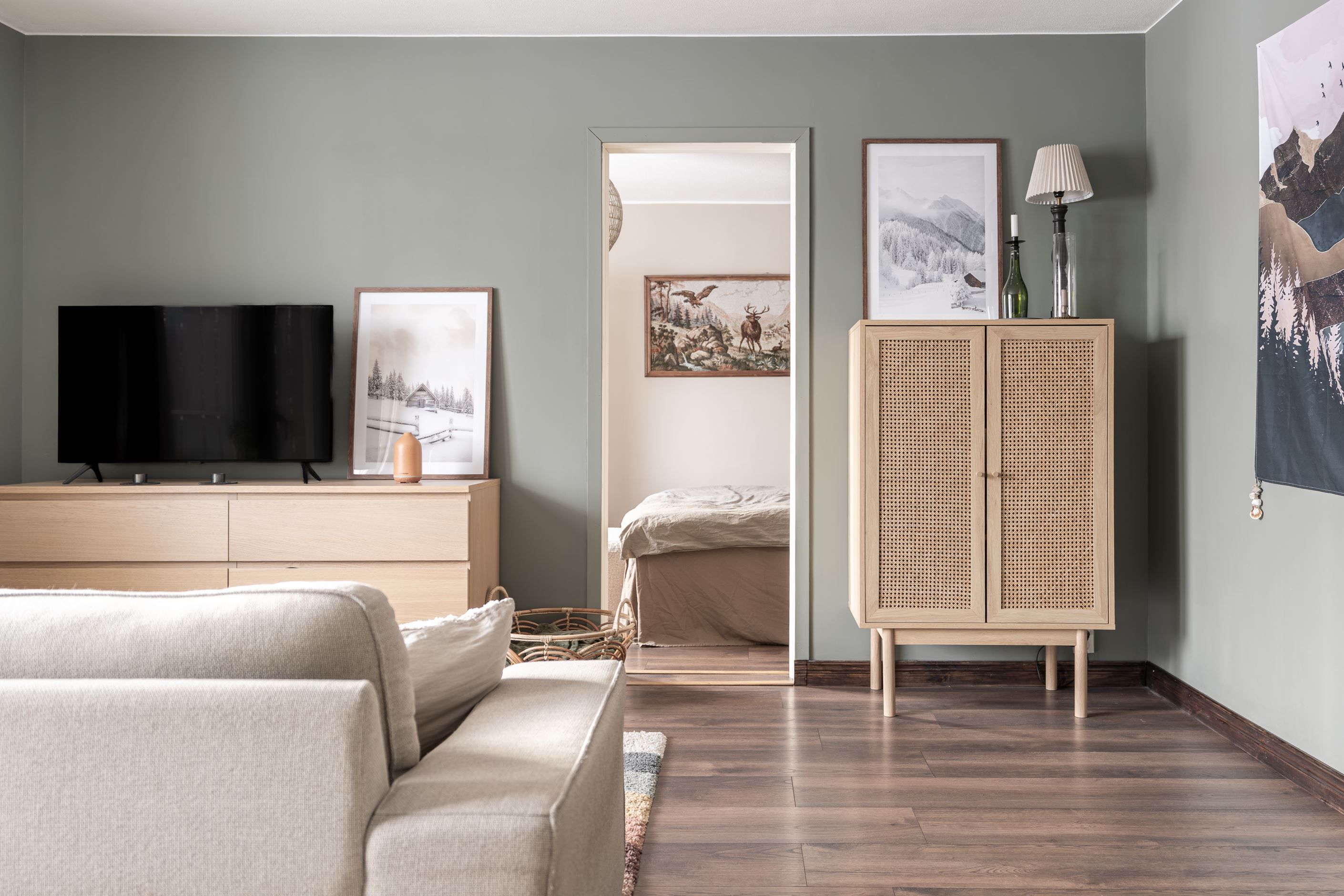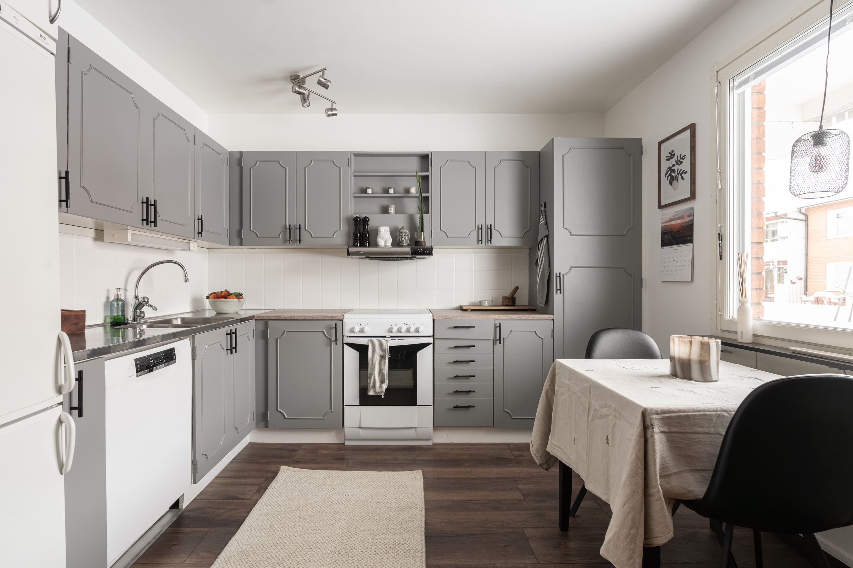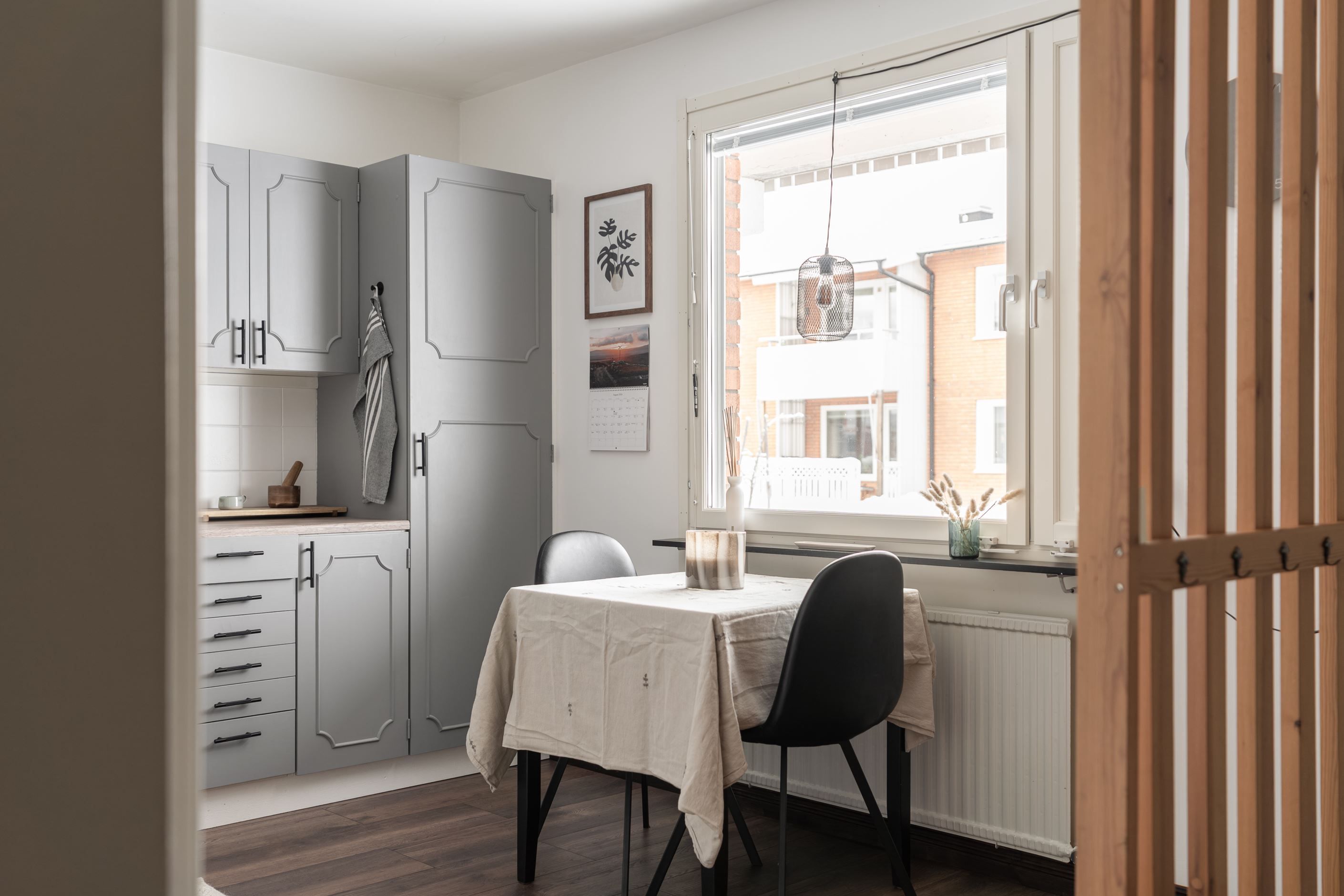 Det moderniserade köket är inrett i sobra toner med stilrena grå skåpluckor med gott om förvaring, fullstor kyl och frys och diskmaskin – perfekt för såväl vardagsmatlagning som middagsbjudningar.
