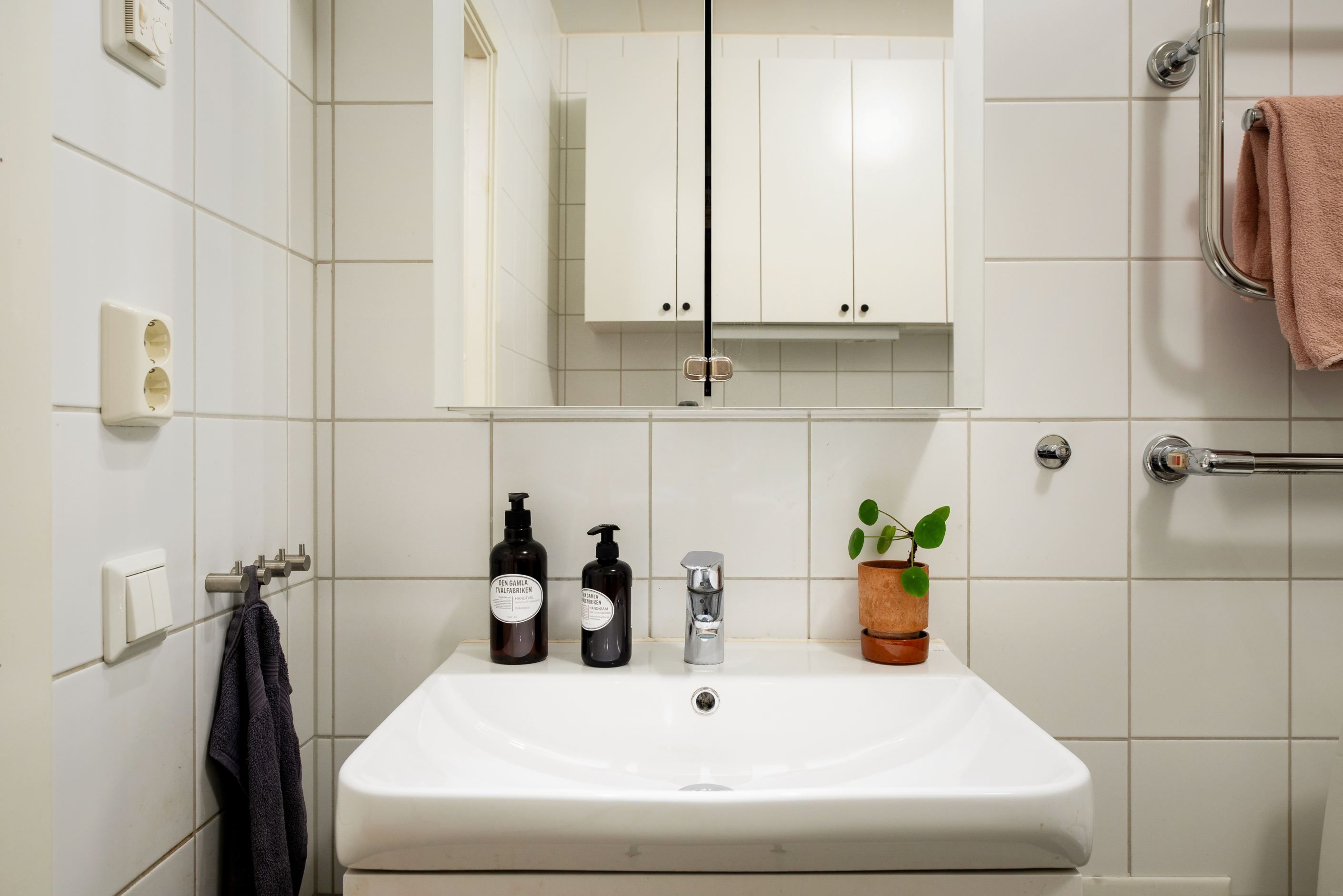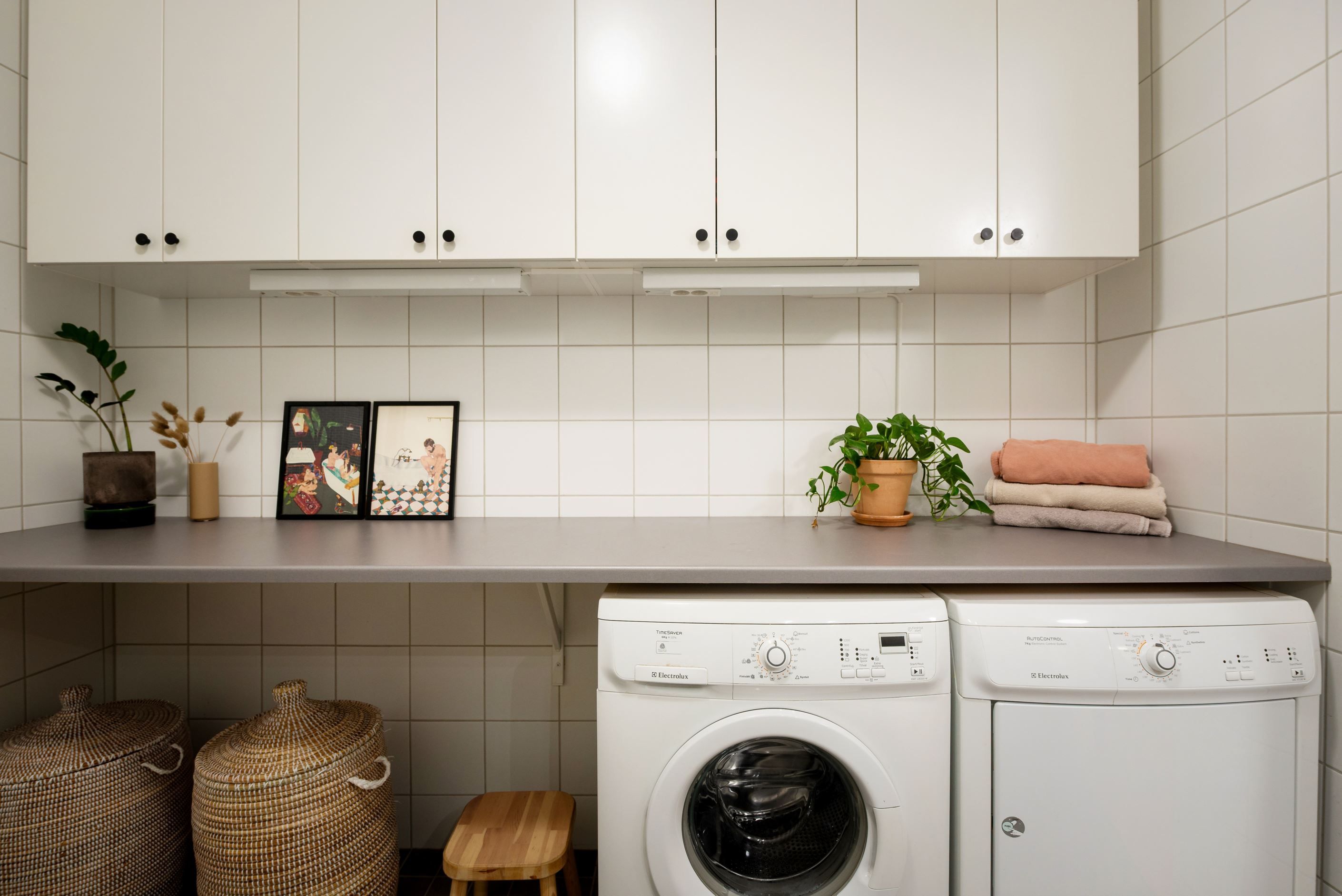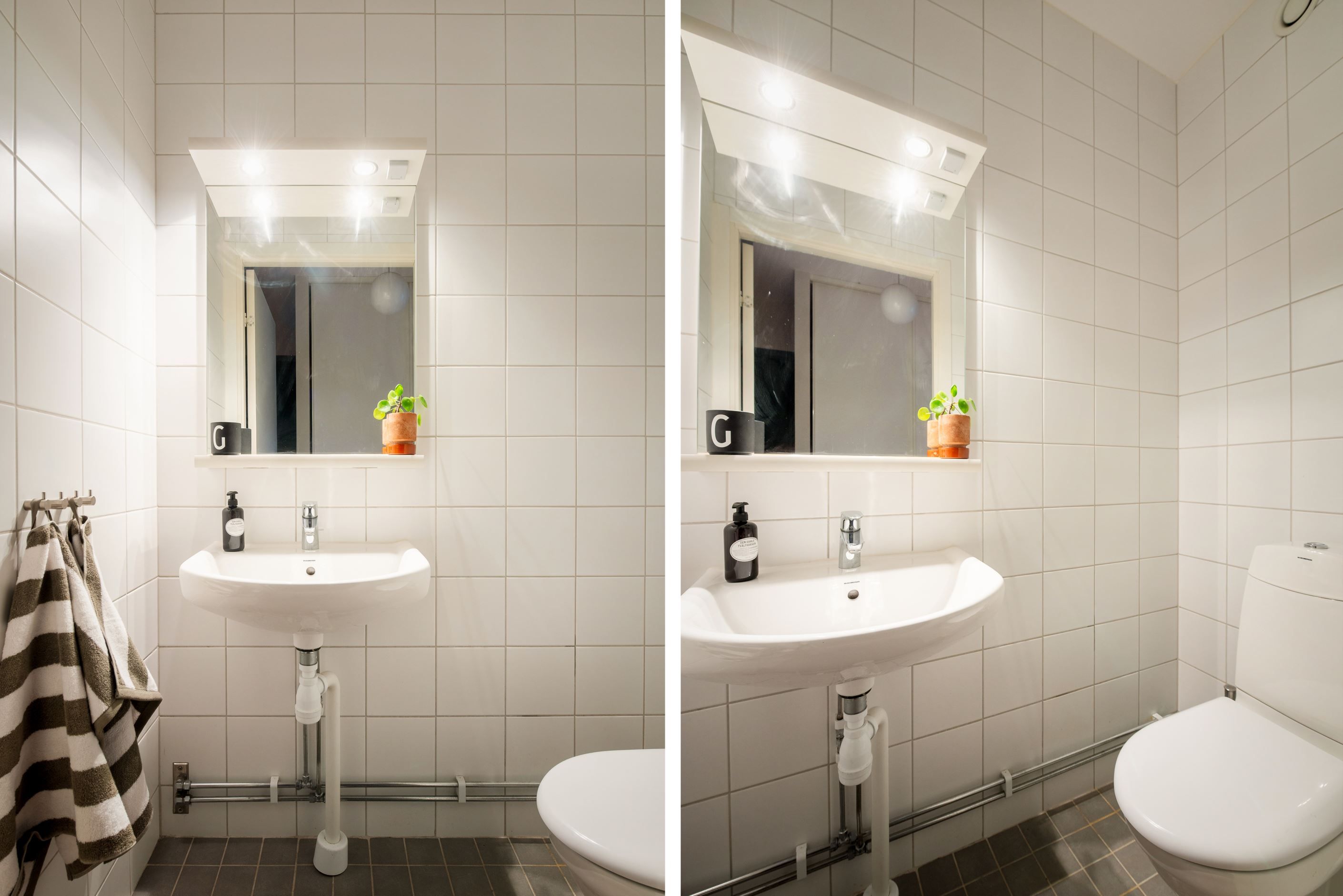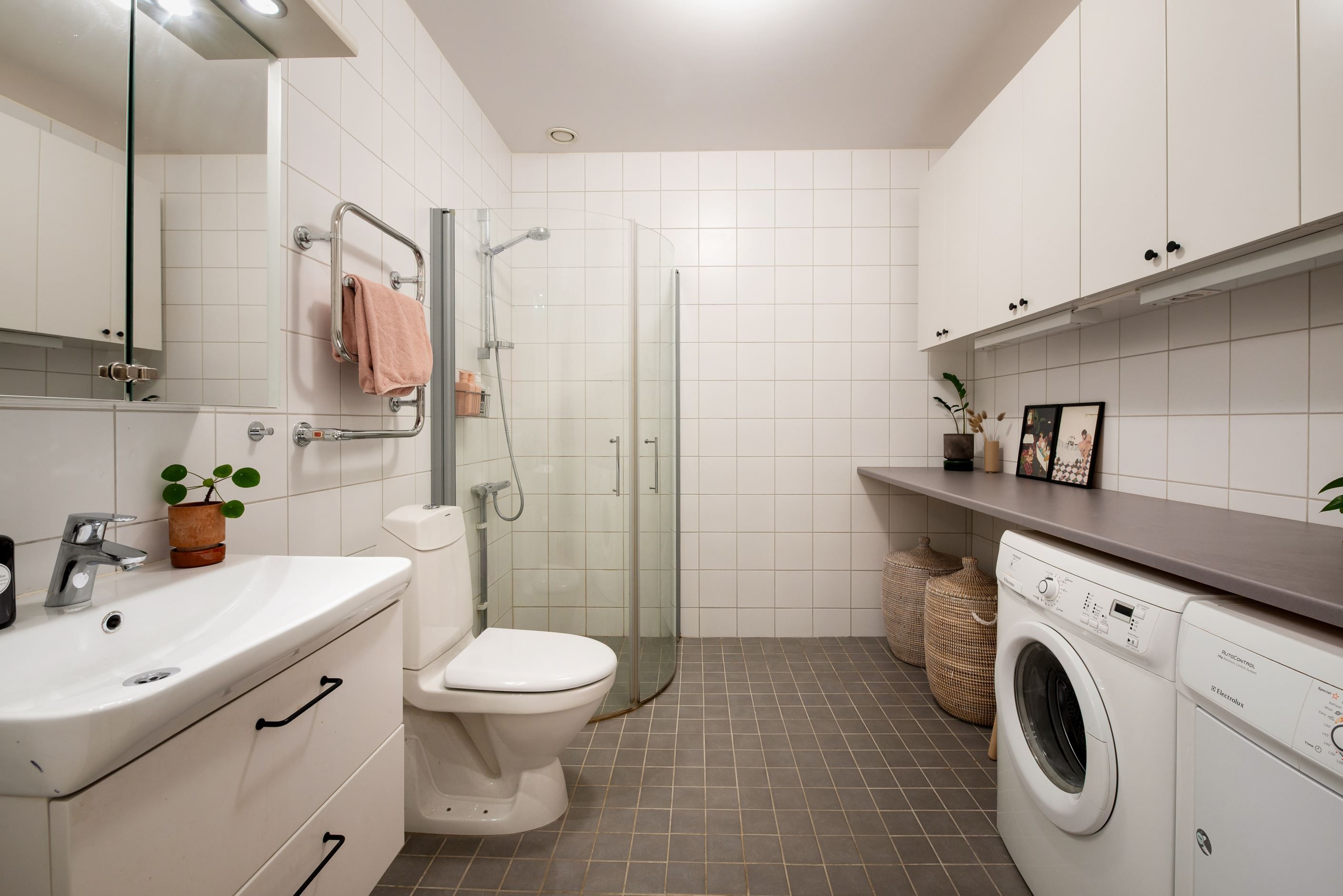 Badrummet är både rymligt och helkaklat med plats för tvättmaskin, torktumlare och ytterligare badrumsinredning - gott om förvaring i flera skåp. I hallen finns även en separat toalett. För den som behöver ett till sovrum kan köket delas av och öppnas upp mot vardagsrummet, se alternativ planlösning.