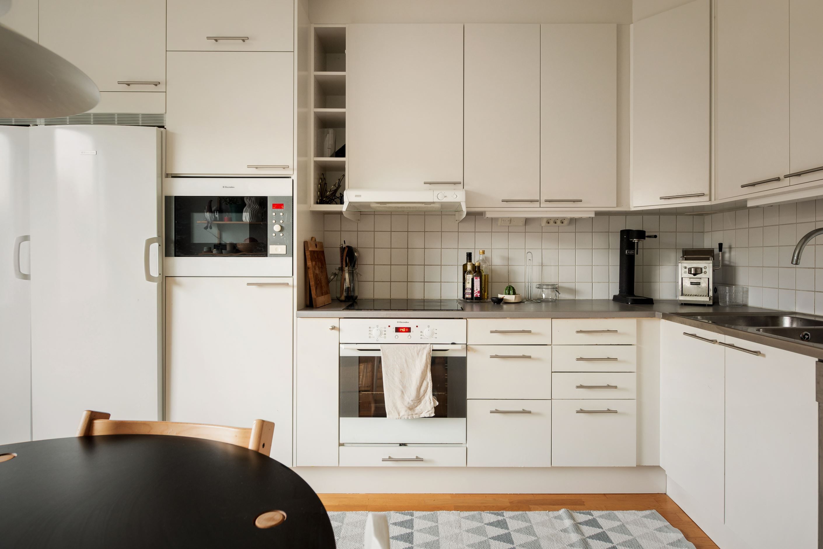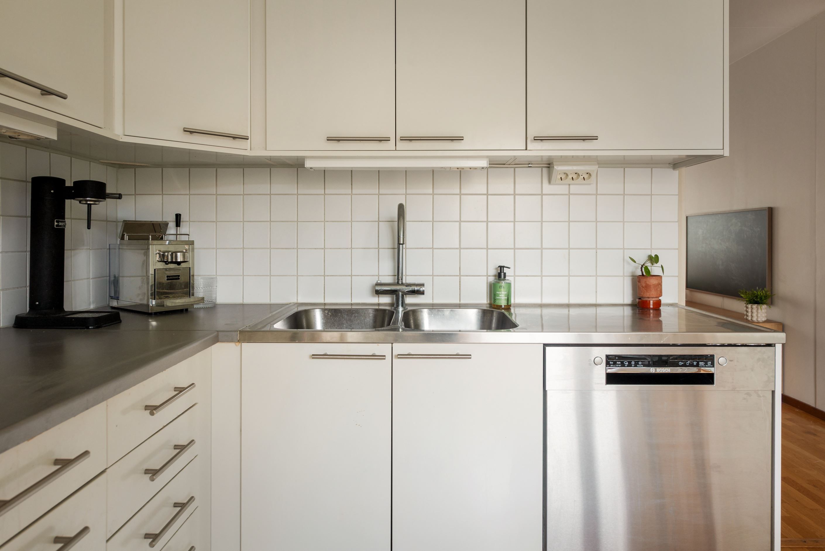 Köket är komplett utrustat och och erbjuder gott om både arbets- och förvaringsutrymmen i flera rejäla skåp. Maskinellt finner ni en fullstor kyl, fullstor frys, diskmaskin, indiktionshäll, spis samt inbyggd mikro.