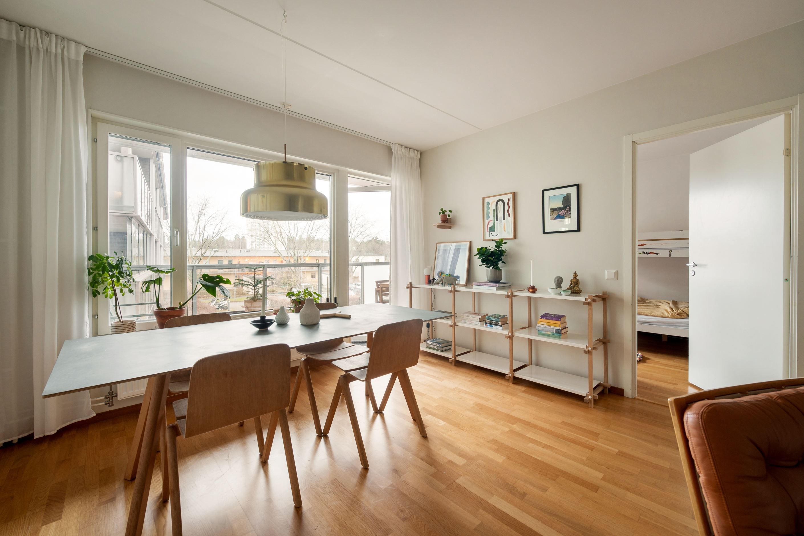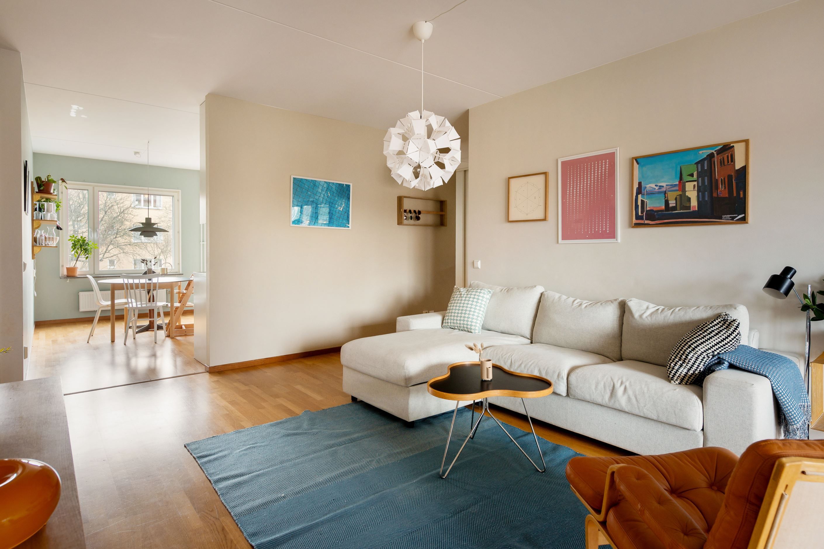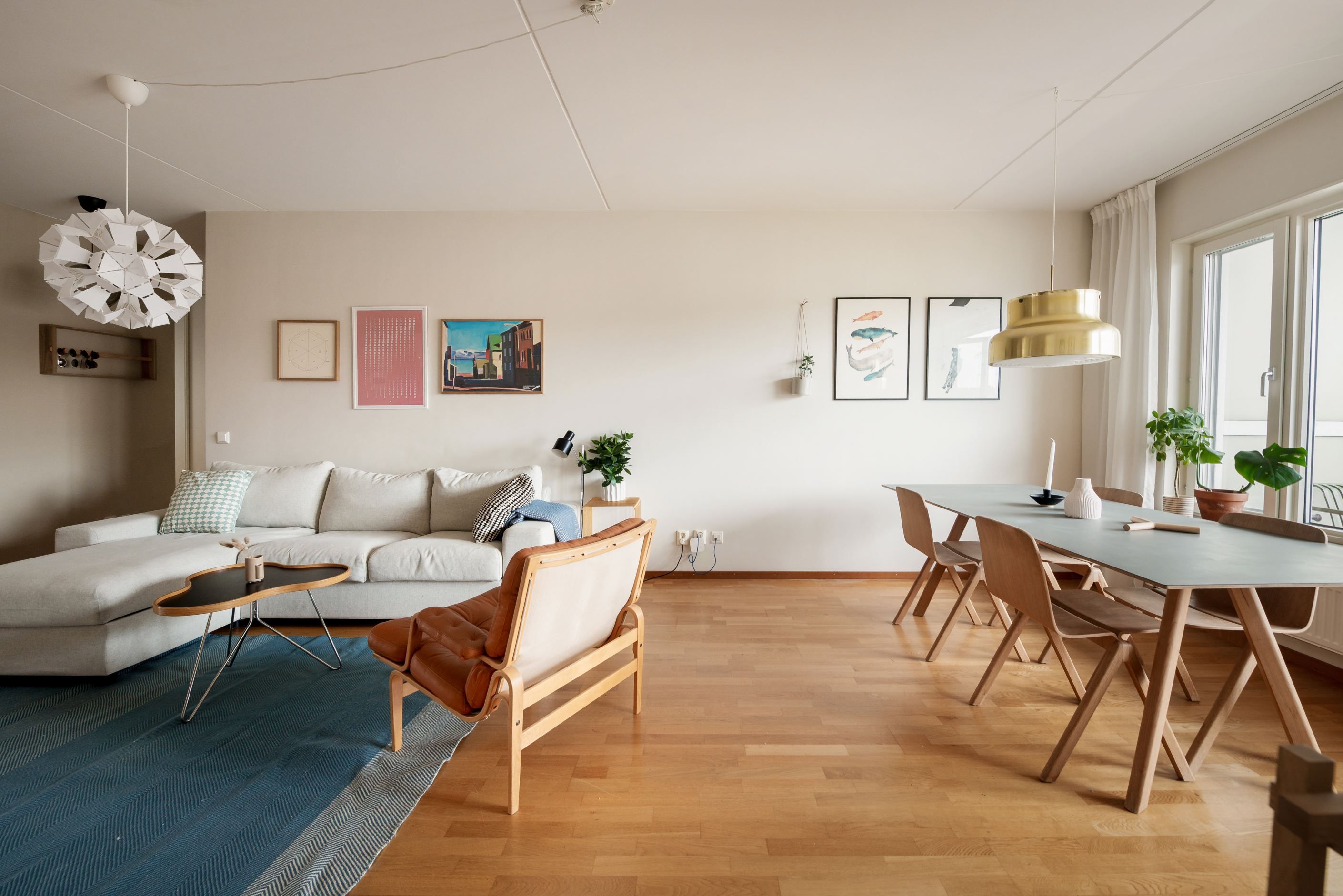 Vardagsrummet är mycket generöst i storlek och har plats för både en rejäl soffgrupp och ett större matbord, lugnt beläget med stor balkong mot föreningens innergård.