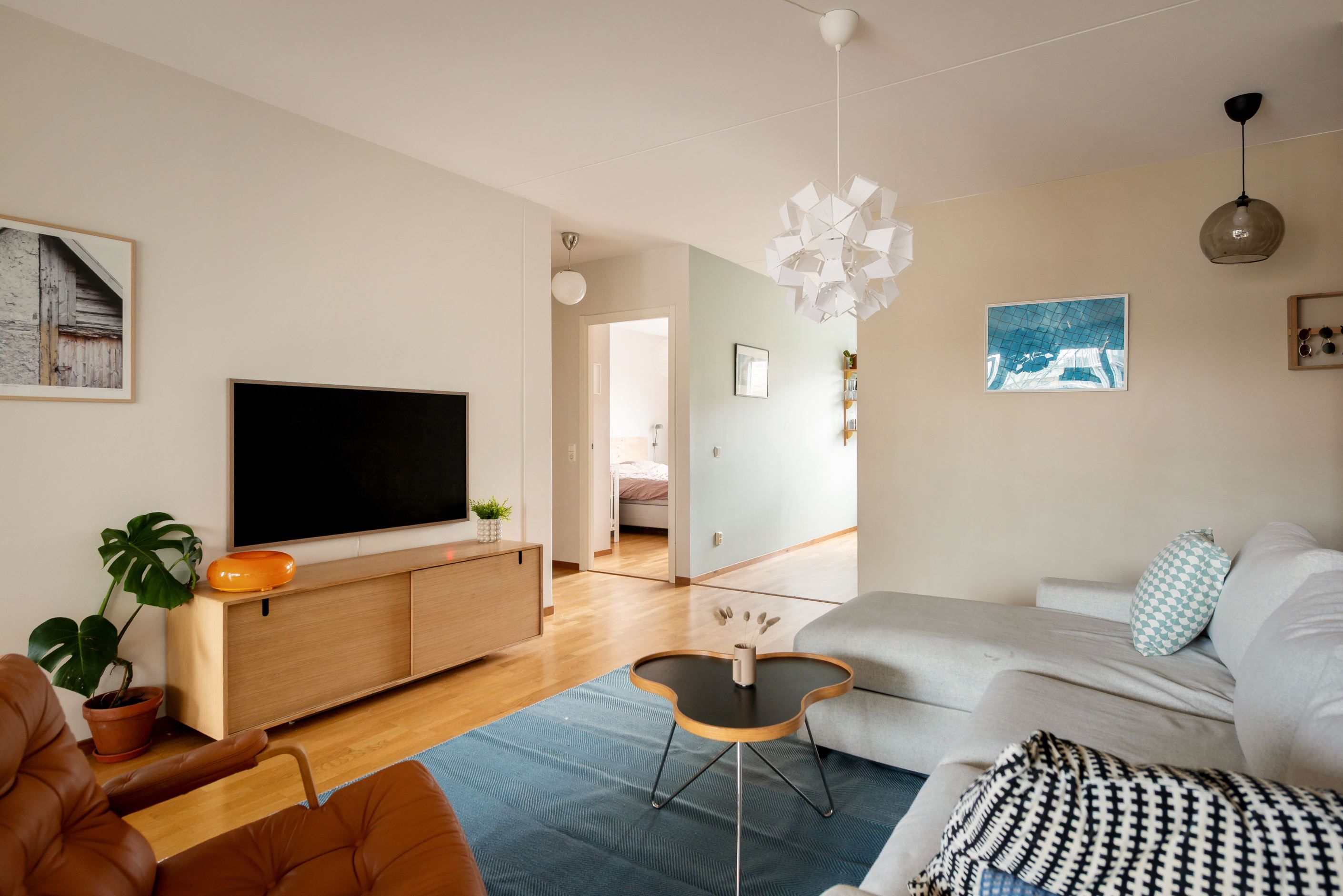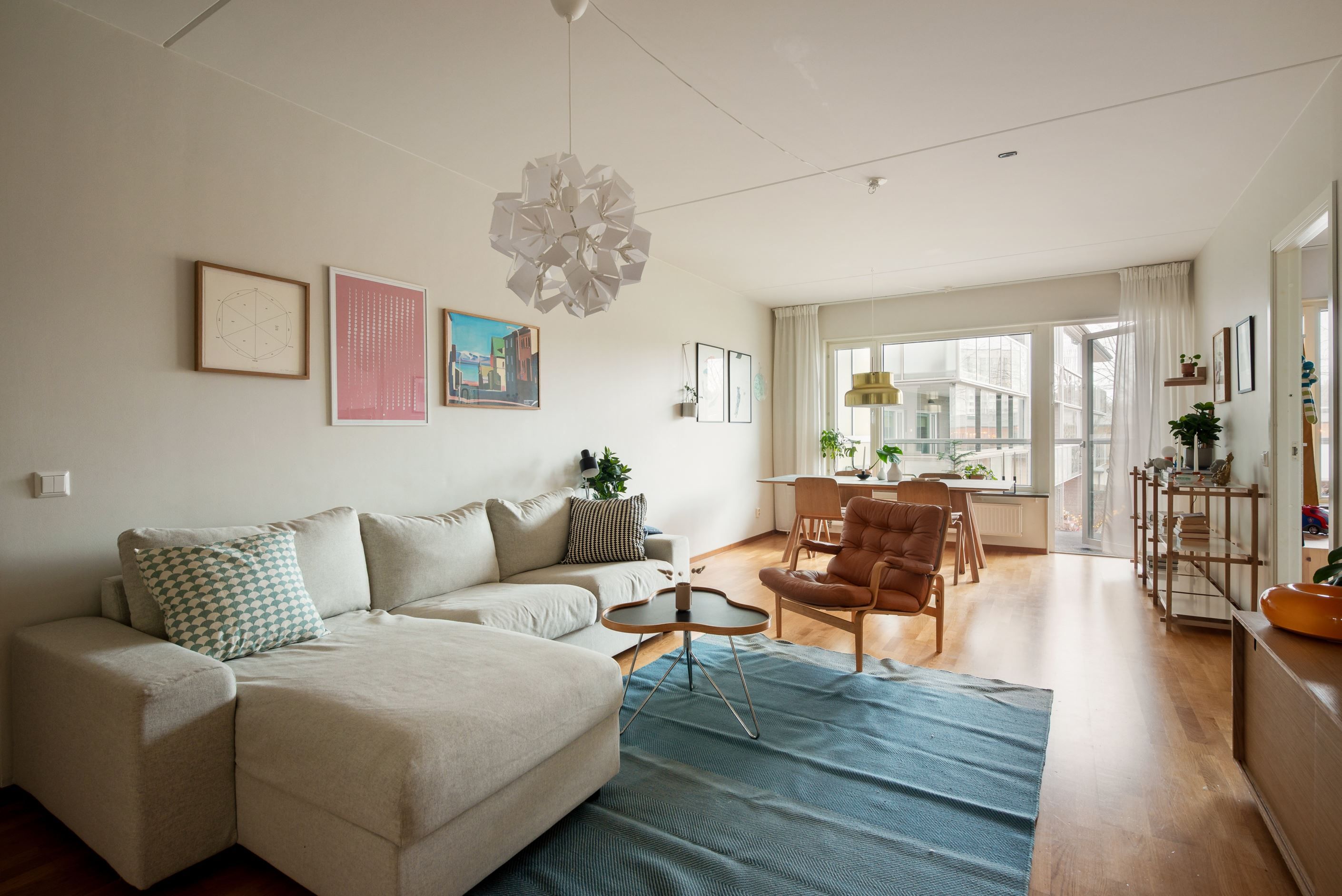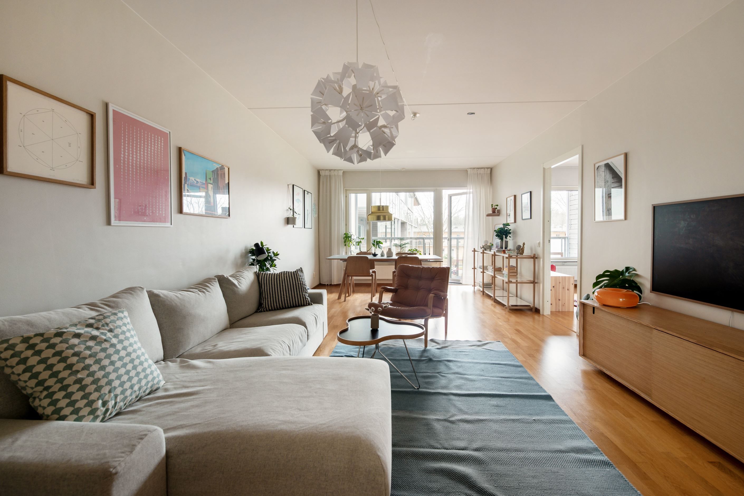 Vardagsrummet är mycket generöst i storlek och har plats för både en rejäl soffgrupp och ett större matbord, lugnt beläget med stor balkong mot föreningens innergård.