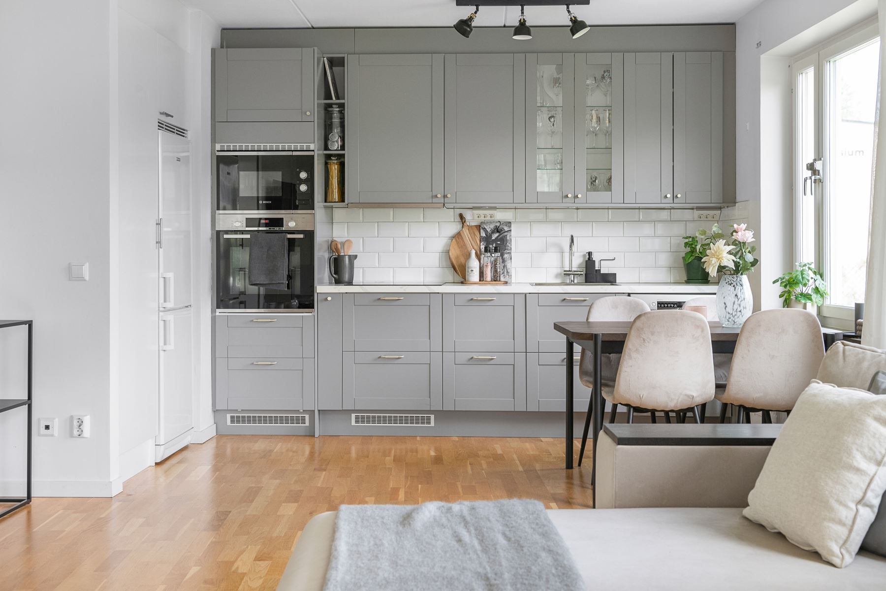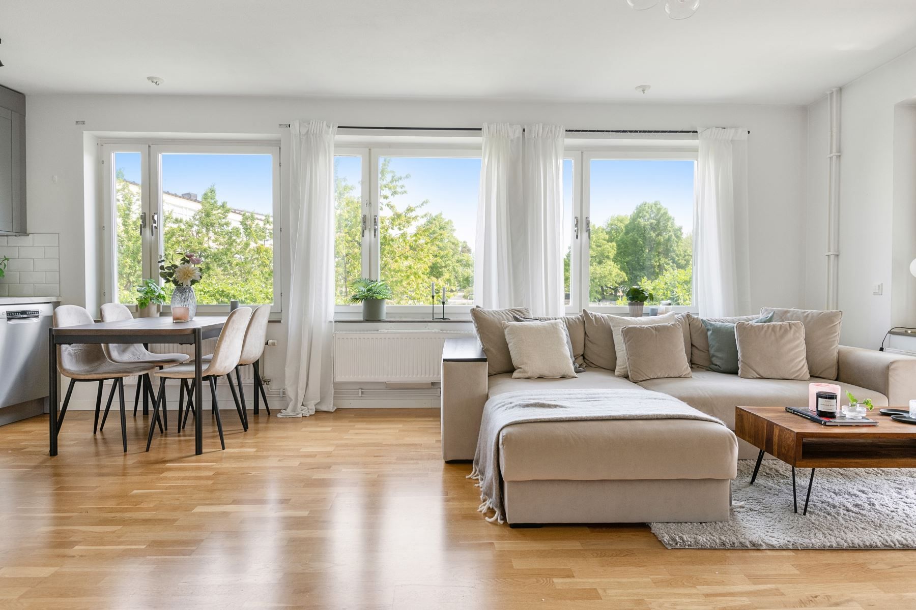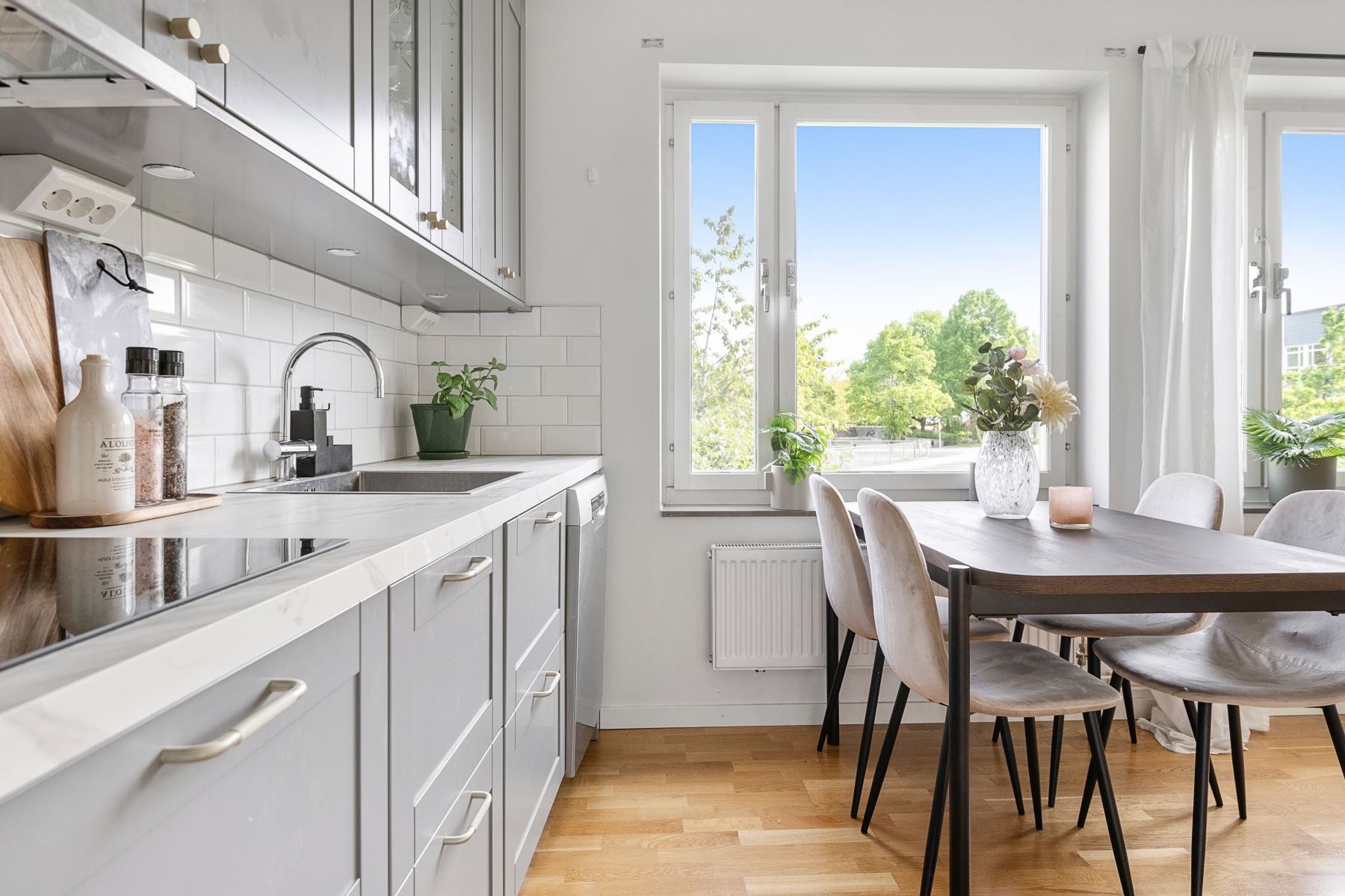 Väl inne i lägenheten når du en öppen hall i angränsning till den öppna planlösning mellan kök och vardagsrum. Du nås direkt av ett rikligt ljusinsläpp från tre stora fönsterpartier i fil ut mot gården. Goda avhängningsytor och förvaringsutrymme från golv till tak bakom spegelklädda skjutdörrar. Vidare in når du vardagsrum och kök med en tilltalande planlösning som bjuder in till de sociala stunderna med vänner och familj. Stilfullt kök i grå ton och kaklade väggar ovan arbetsbänk. Här råder det gott om möbleringsmöjligheter och du får enkelt plats med större matbord, soffa med tillhörande soffbord samt övrigt passande möblemang. Rofyllt sovrummet beläget med fönster ut mot gården och här finns plats för fullstor säng med tillhörande sängbord. Härifrån når du en rymlig klädkammare/walk-in-closet. Helkaklat badrum med mörk klinker samt vit kakel på väggar. Här finner du vidare bl.a inglasad dusch, tvättmaskin, golvvärme, handdukstork samt god förvaring i överskåp.