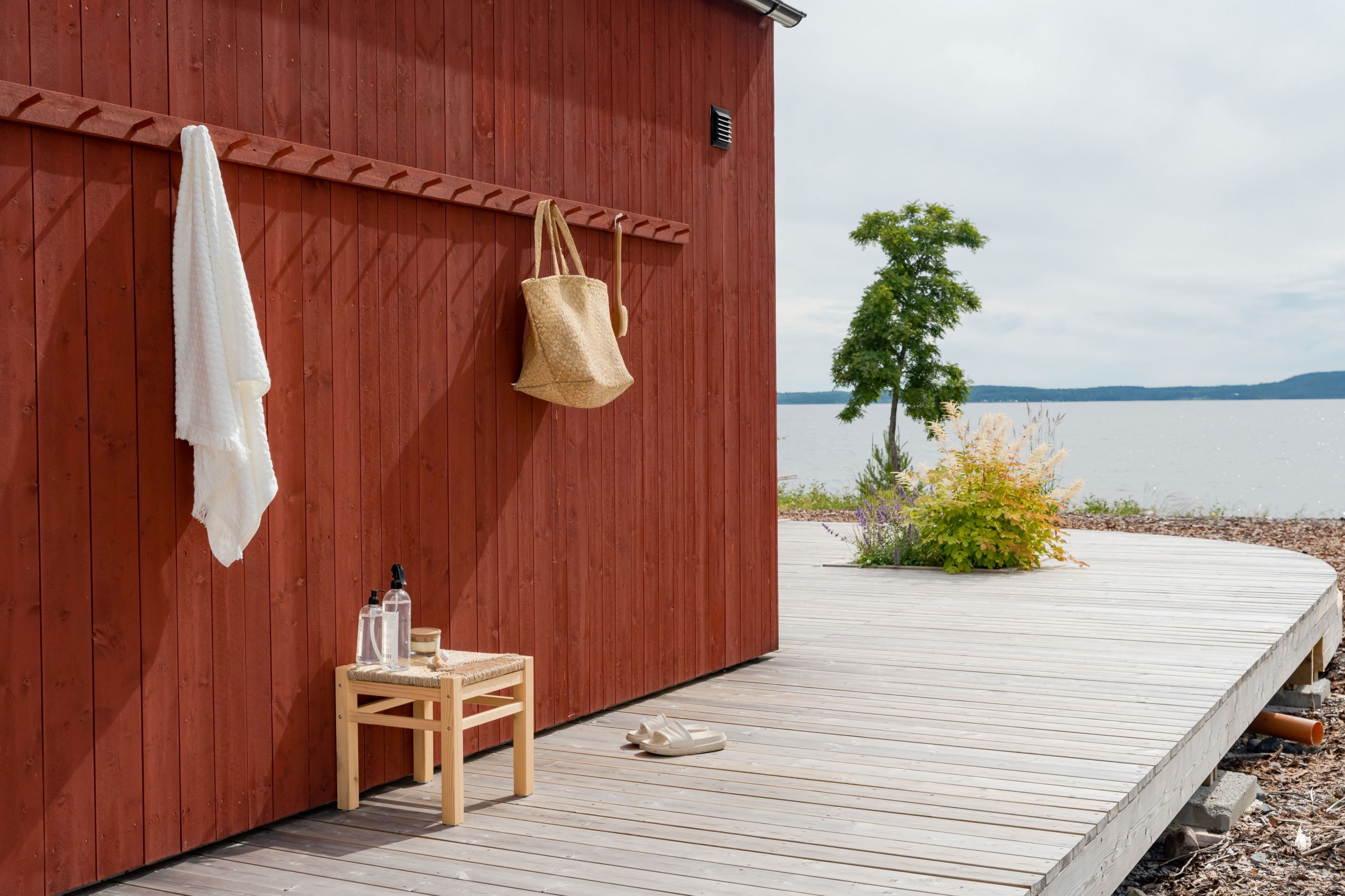 Med korslimmade skivor i gran skapas här en härlig rymd och atmosfär och ett skönt inomhusklimat oberoende av årstid. De listfria övergångarna mellan tak och vägg ger ett elegant och minimalistiskt intryck och den ytbehandling som både väggar och tak genomgått bevarar träets ljusa karaktär.
