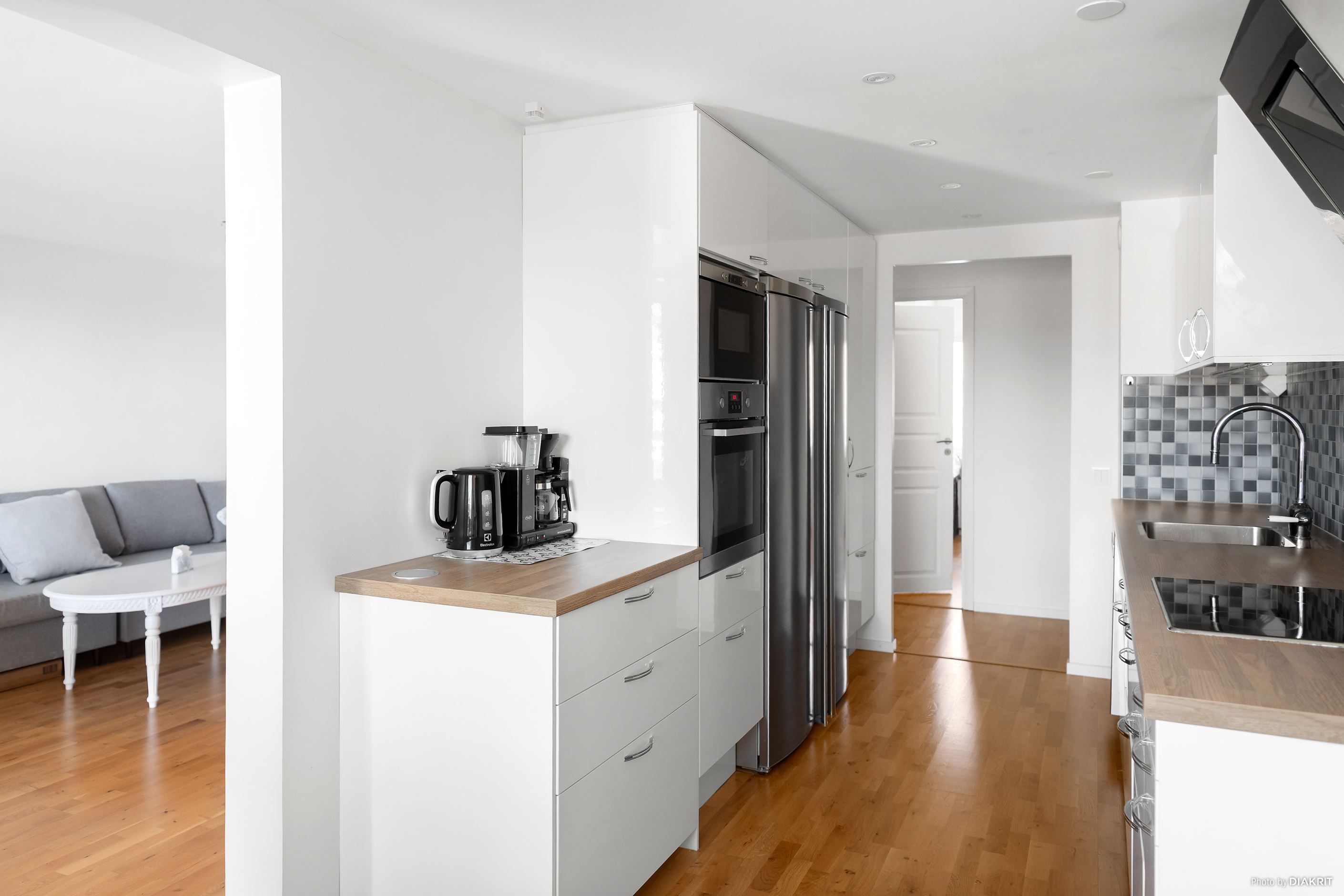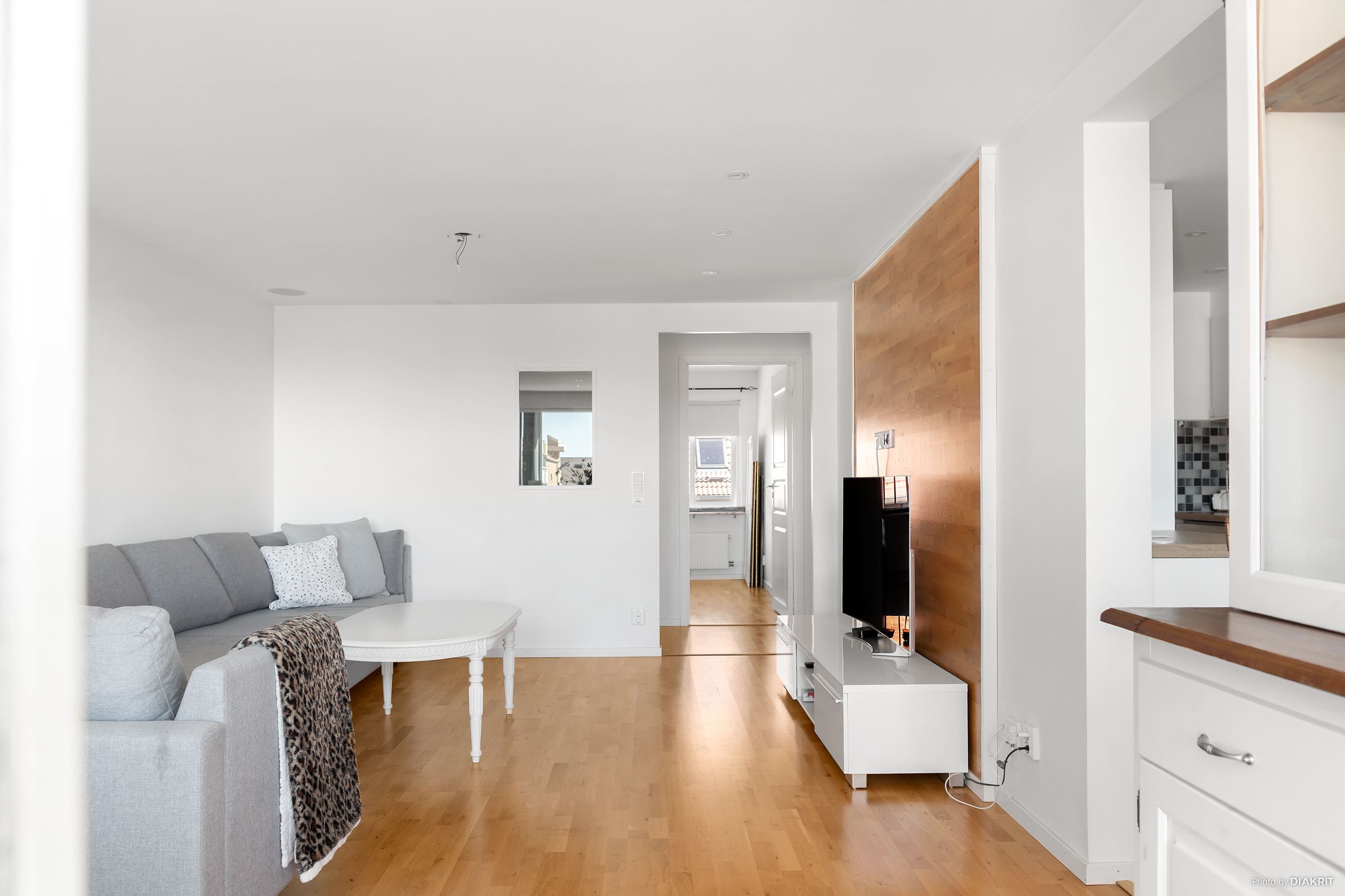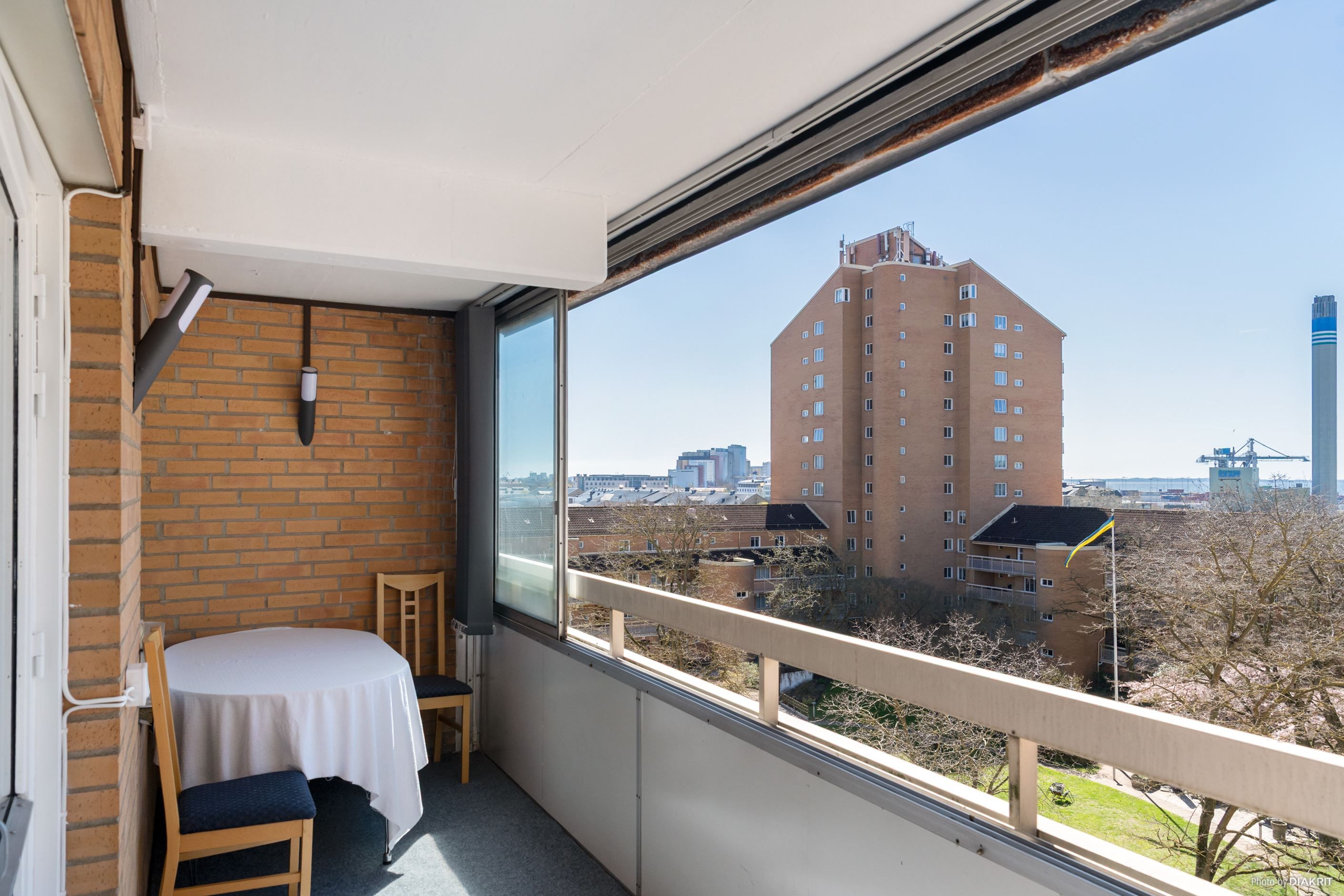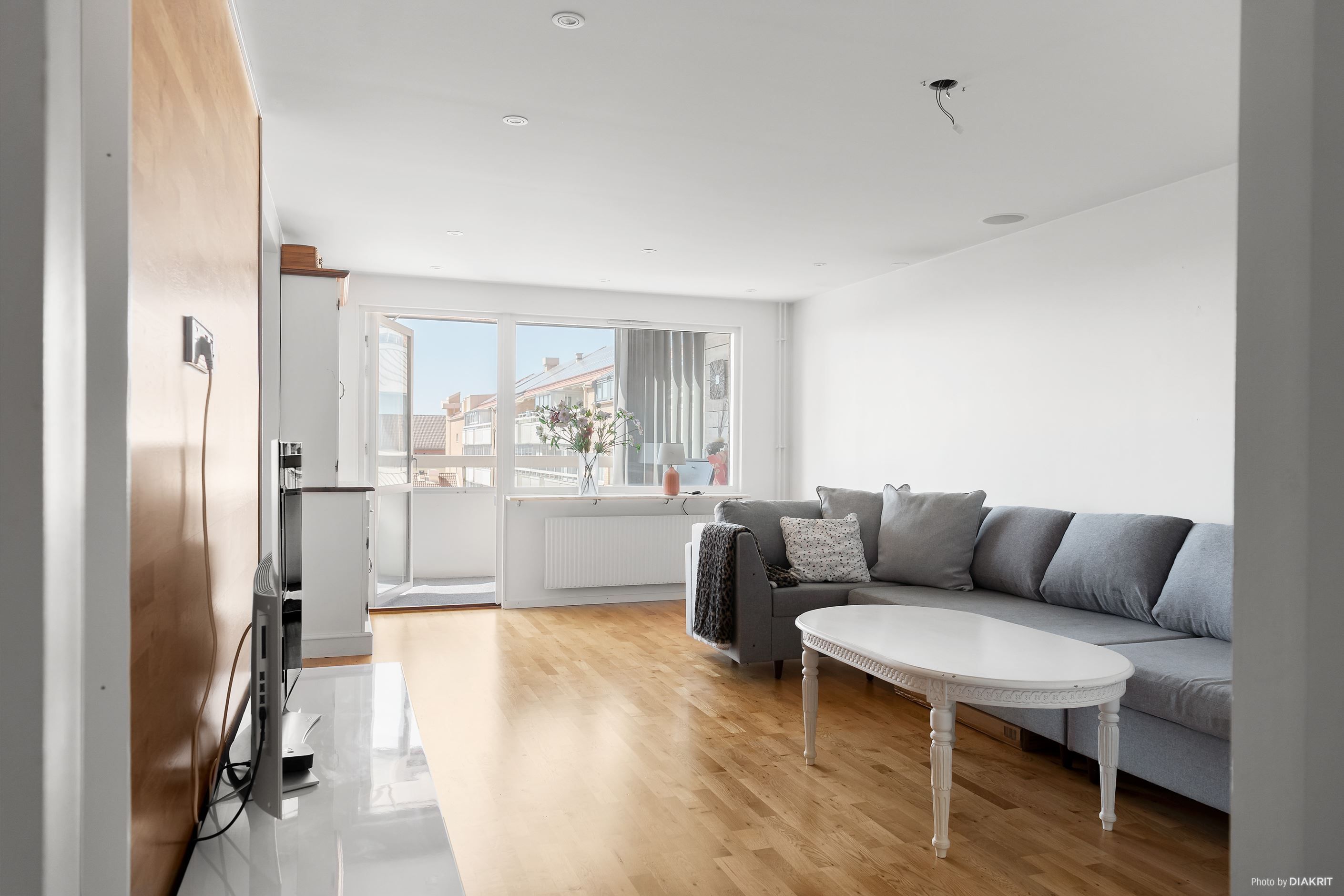 Bostaden disponeras med ett rymligt vardagsrum som bjuder in till sociala stunder och har direkt utgång till den stora, inglasade balkongen. Här kan du njuta av lugnet mot gården samt en glimt av sundet – en perfekt plats för avkoppling året om.