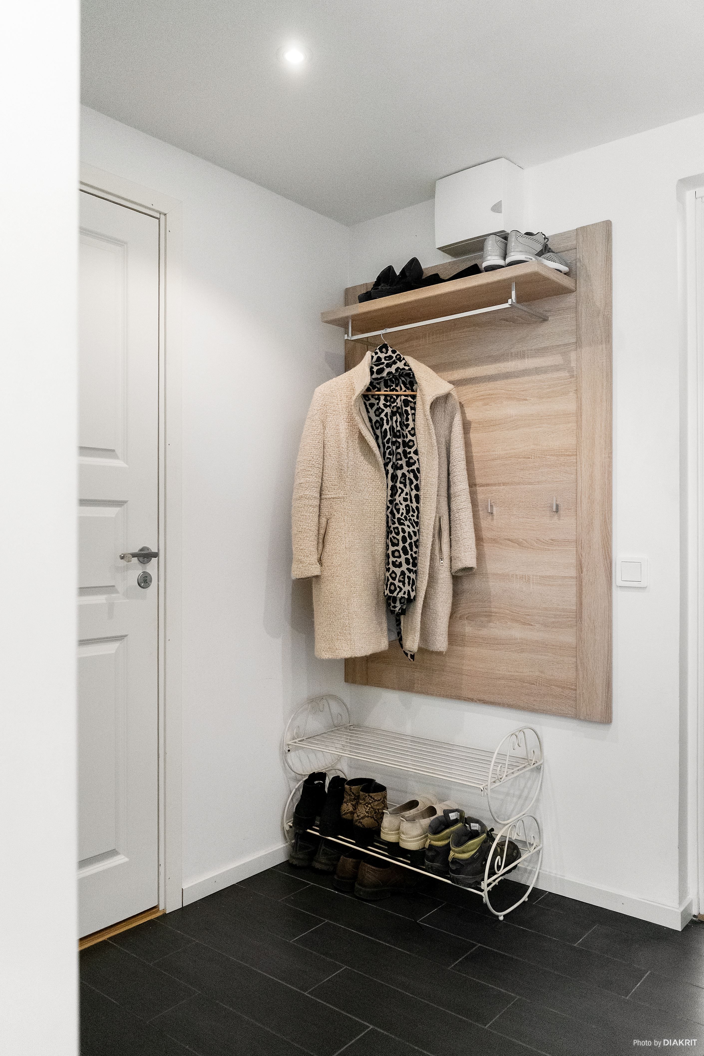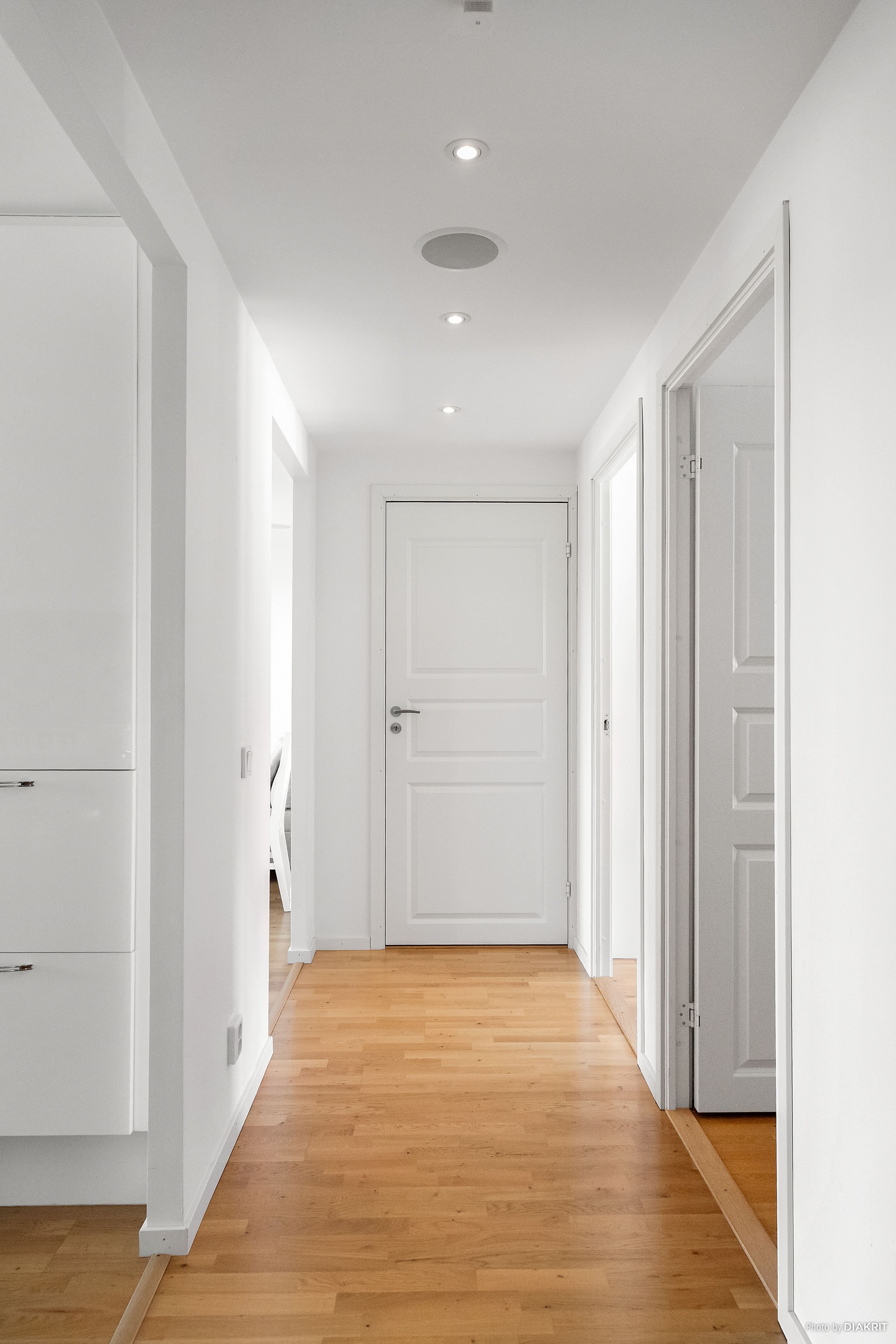 Förvaringsmöjligheterna är goda tack vare en rymlig klädkammare, och i hallen möts du av stilfulla spotlights i taket. Genomgående parkettgolv skapar en enhetlig och hemtrevlig känsla i hela bostaden.