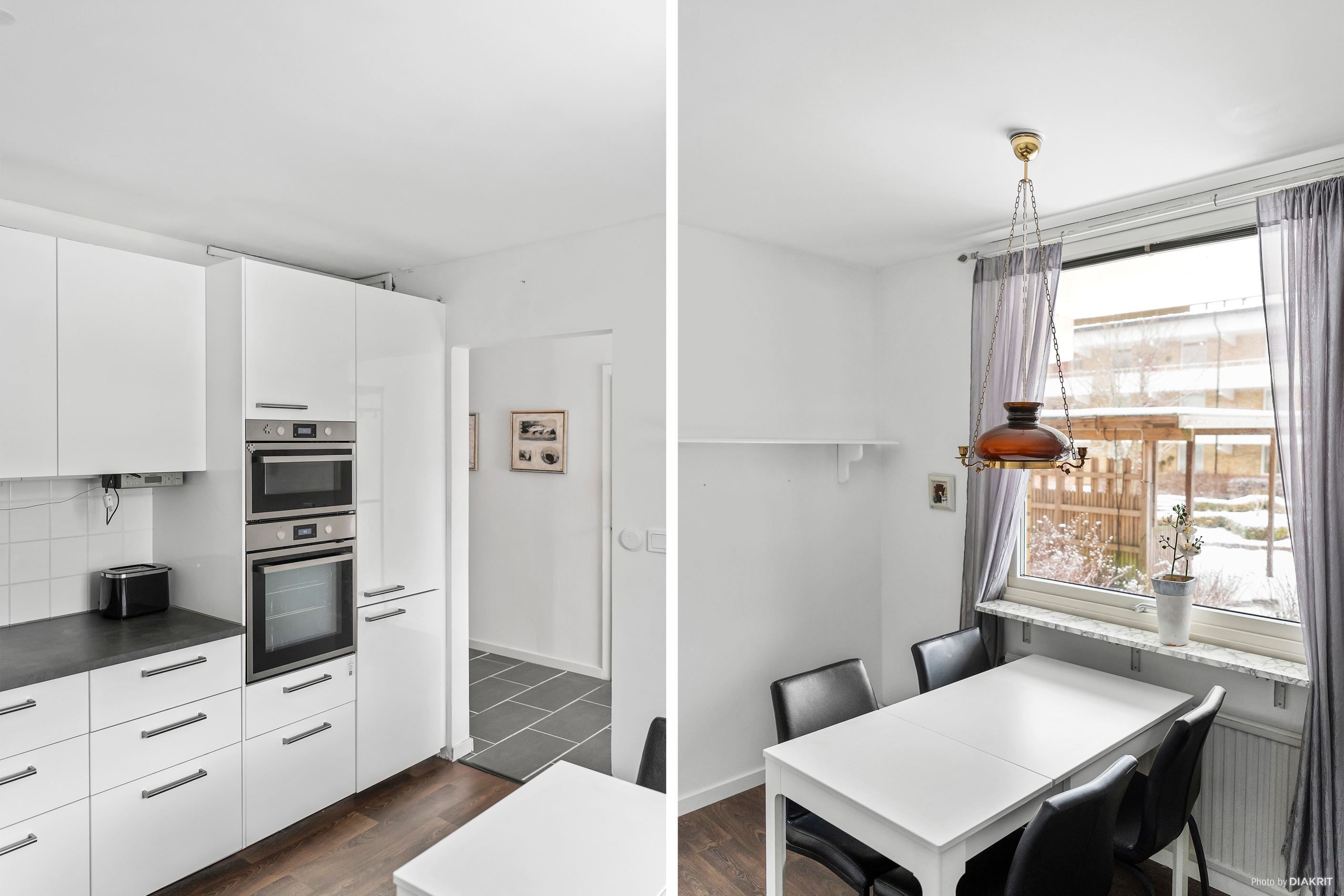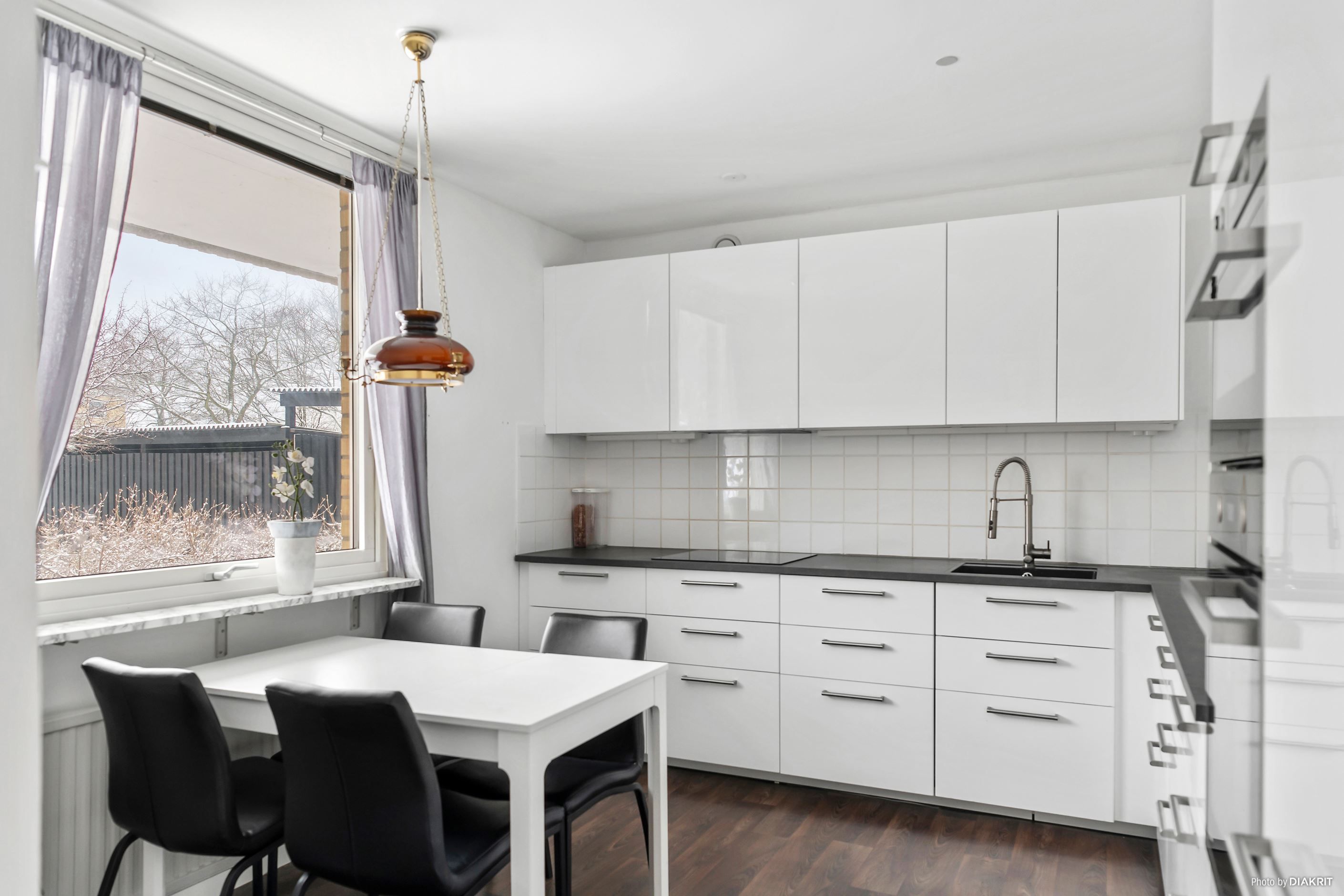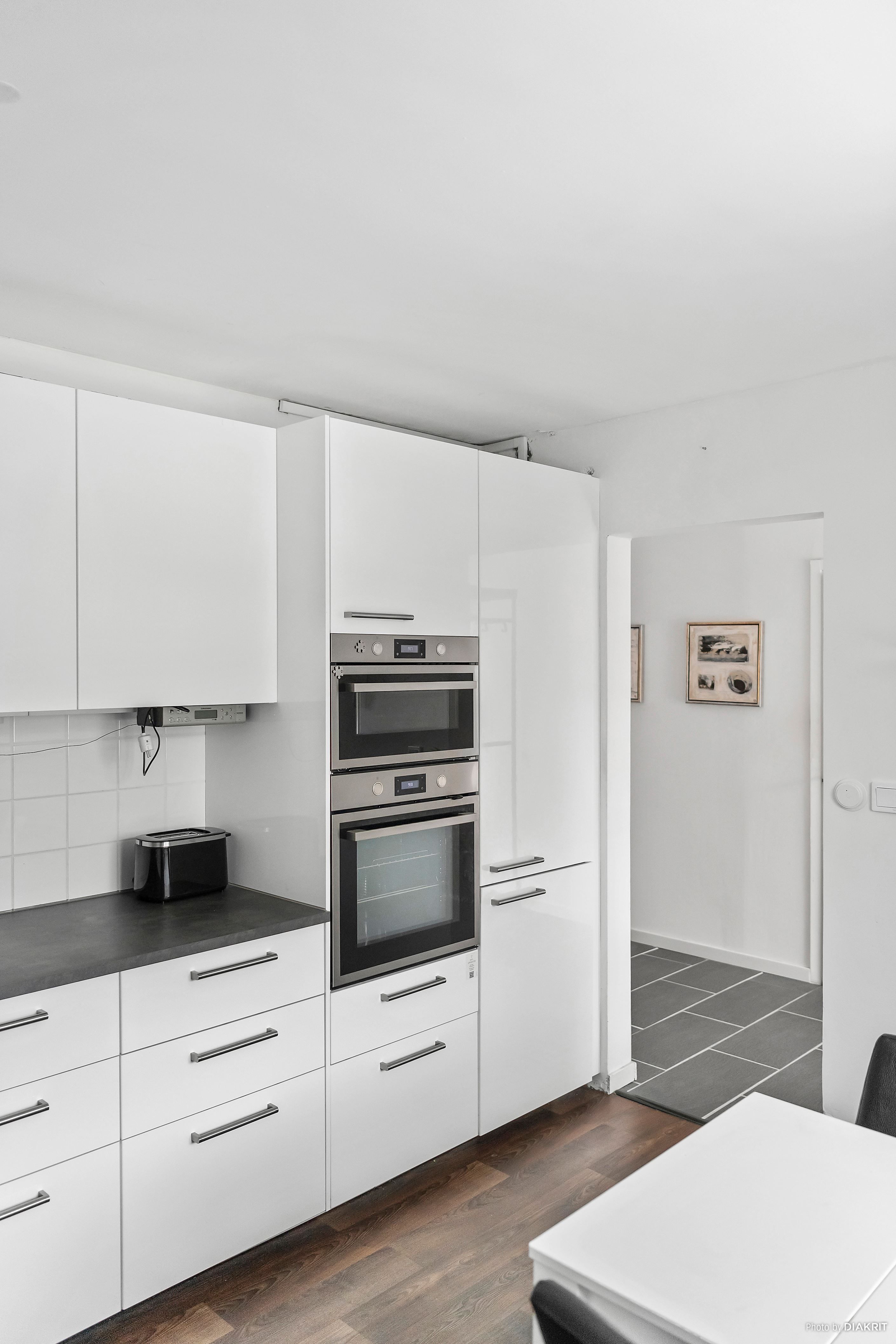 Det generösa köket erbjuder gott om arbetsyta och förvaring samt plats för matbord. Köket är utrustat med diskmaskin, takspottar samt ny kyl och frys – perfekt för både vardag och middagar med vänner.