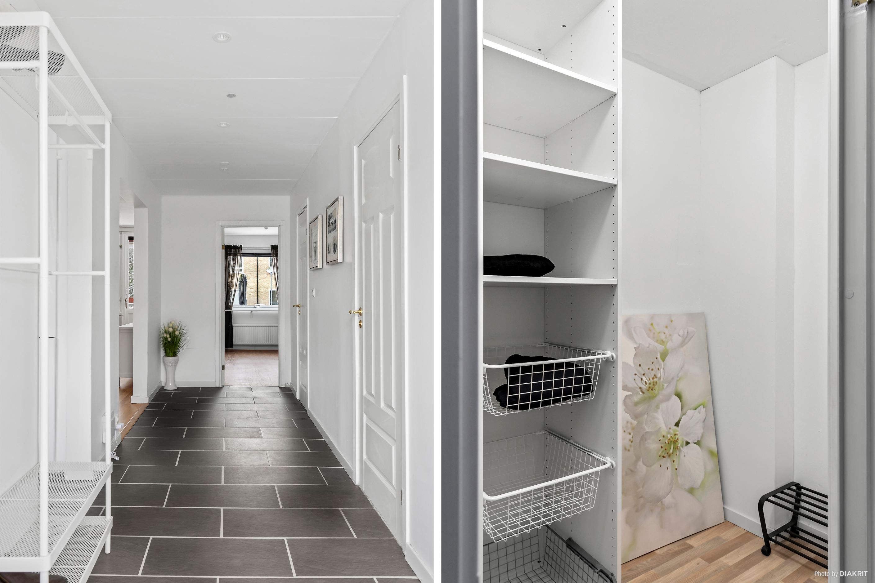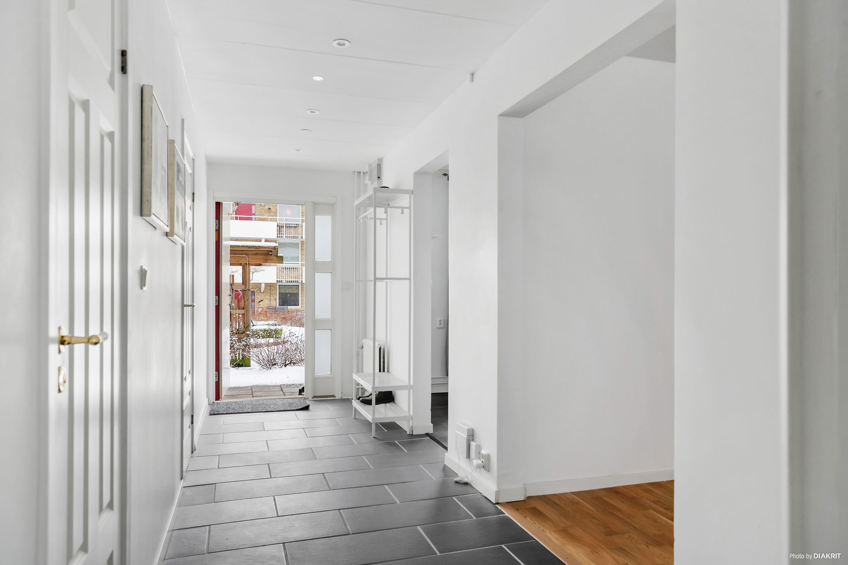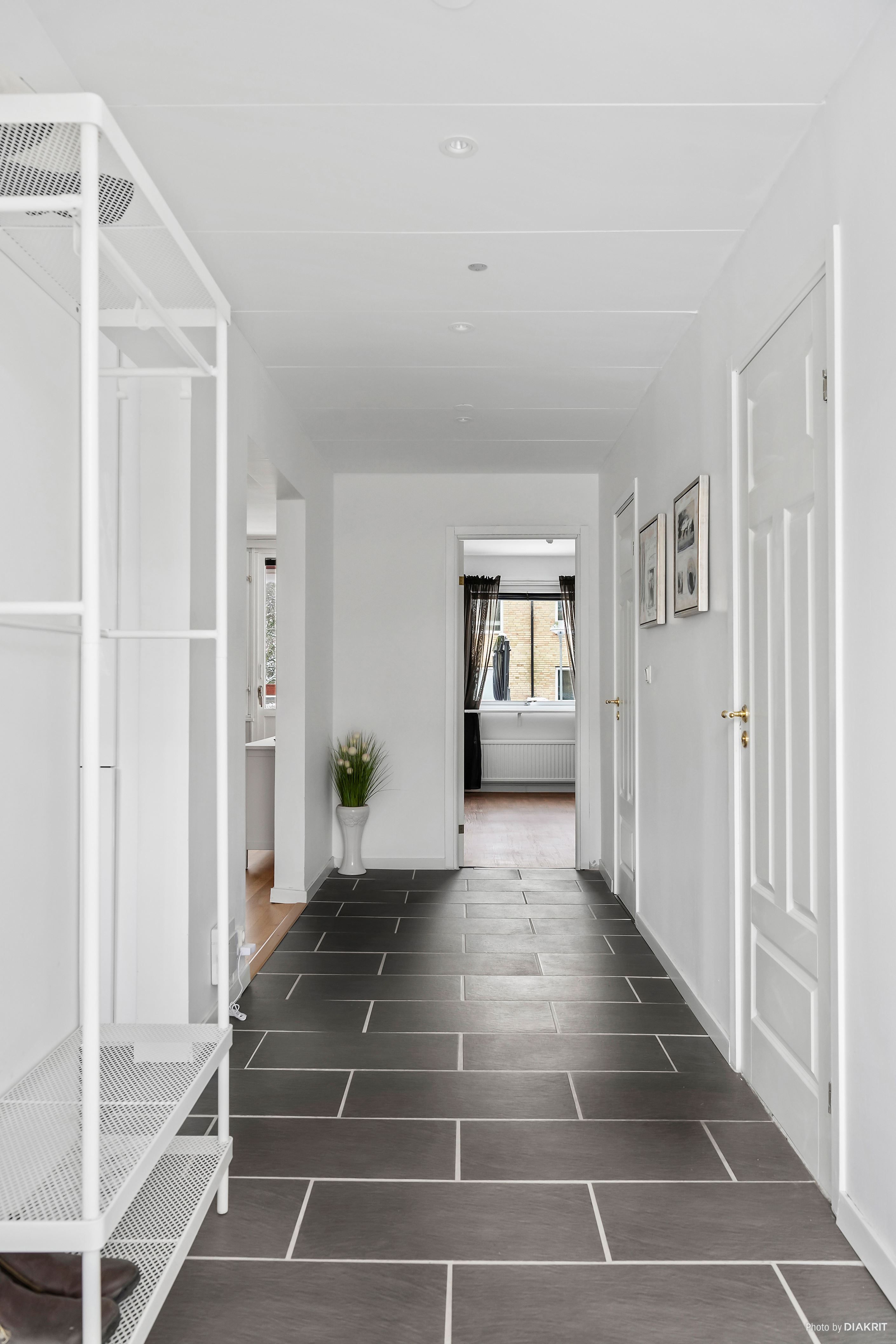 Redan i hallen möts du av ett stilrent stengolv. Intill finns en rymlig klädkammare/förråd som ger utmärkta förvaringslösningar.