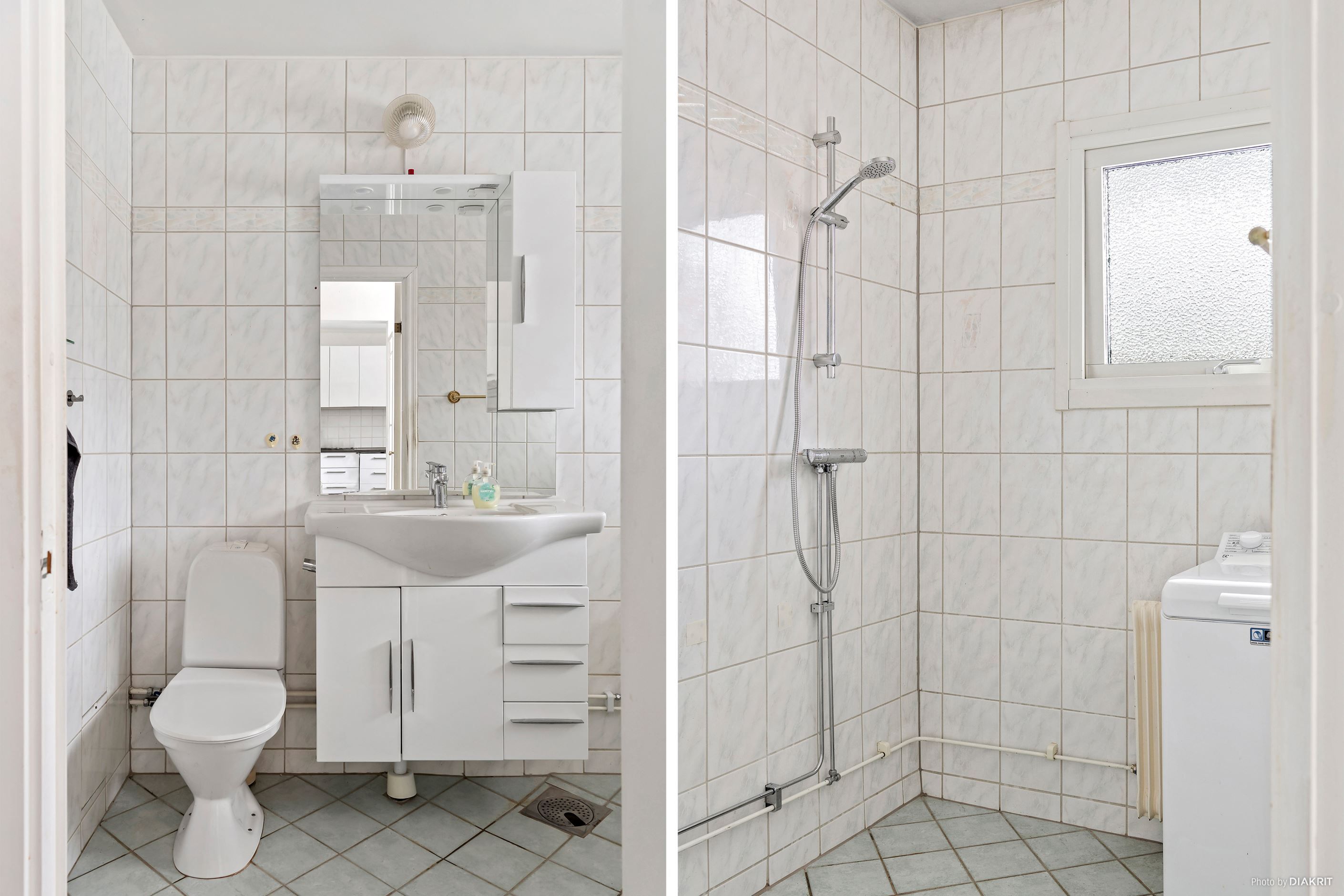 Badrummet är fräscht och funktionellt med dusch och fönster som ger naturligt ljus och god ventilation.