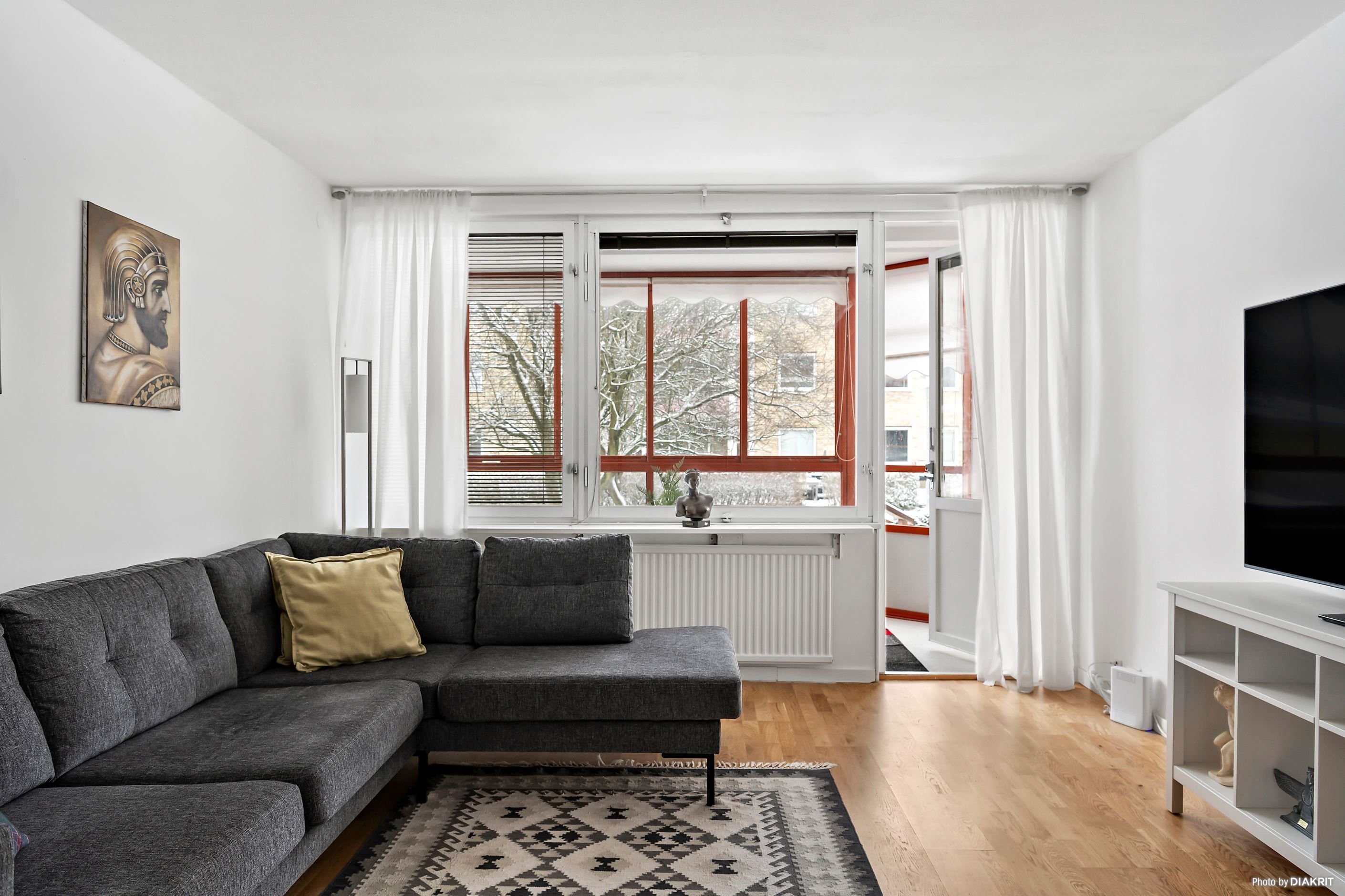 Vardagsrummet är luftigt och lättmöblerat med parkettgolv och direkt utgång till den inglasade balkongen, som förlänger säsongen och skapar ett extra rum större delen av året. Från balkongen nås även uteplatsen – idealisk för morgonkaffet eller sommarens grillkvällar.