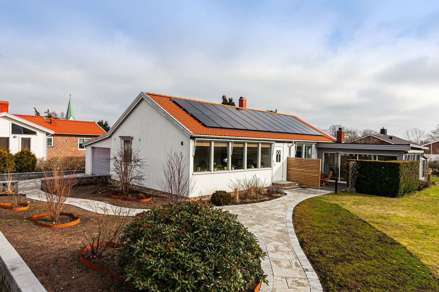 På en lugn återvändsgatan i centrala Åstorp hittar vi denna fina enplansvillan med närhet till både centrum och naturen. Ett fräscht hus med praktiska ytor. Nyare tak med solceller installerat på södersidan. Omgivet av en mysig trädgård med stenlagda gångar och rabatter på framsidan och pallkragar, fruktträd på den fina gräsmattan på baksidan.