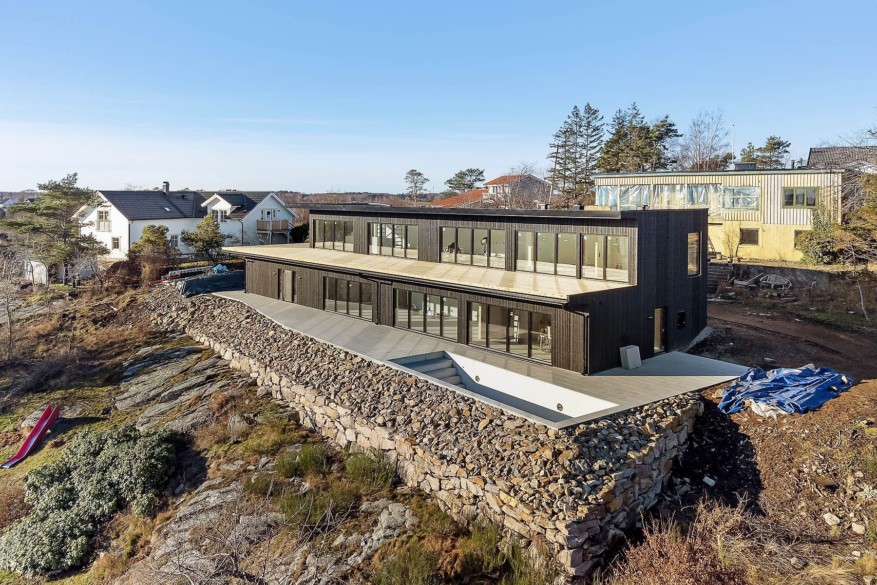 Now we have the great joy of being able to convey a dream house of 350 square meters with a high and strikingly beautiful view location. This beautiful home is under construction and most of it is getting ready. The house will be 100% completed by the contractor, but as a buyer, you have the opportunity to enter at an earlier stage to be able to decide for yourself the choice of materials and colors in, for example, the kitchen and bathroom. The house is built to a clearly higher standard than what ordinary catalog houses offer. The extra space with high ceilings, large rooms and huge windows facing the sea is incredibly beautiful. The roof terrace of over 150 square meters inspires creative exterior design of the outdoor environment and from the spa area on the entrance floor you will be able to enjoy both sea and pool views from the glazed sauna. Right from the start, the house has a built-in Wi-Fi system that takes care of your modern and intelligent home. There is also built-in free cooling in the home, which assures you of a cool home even on the hottest summer days. (Free cooling means that you use the cold from the geothermal heat carrier circuit to cool the home. At the same time as you get free cooling, you make the geothermal heat more efficient by adding heat to the coolant).