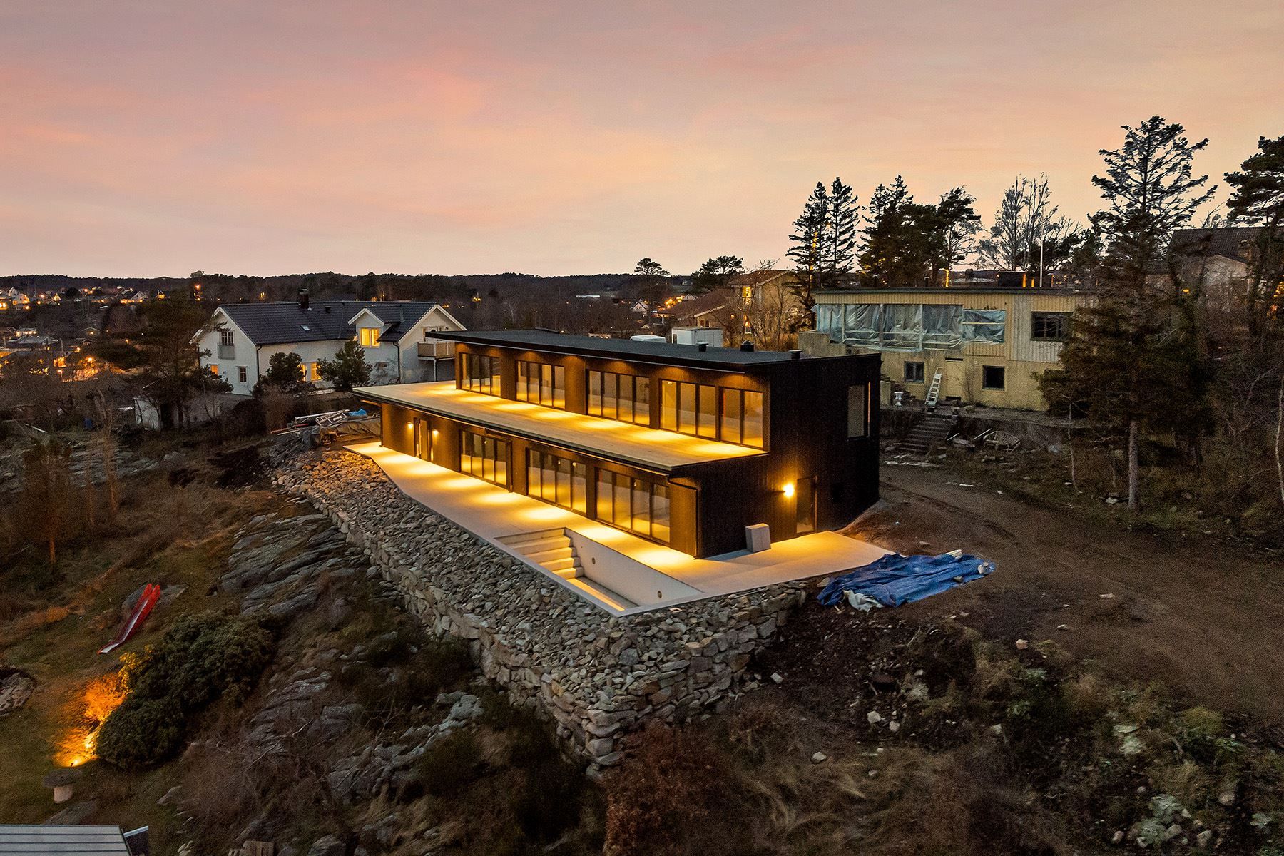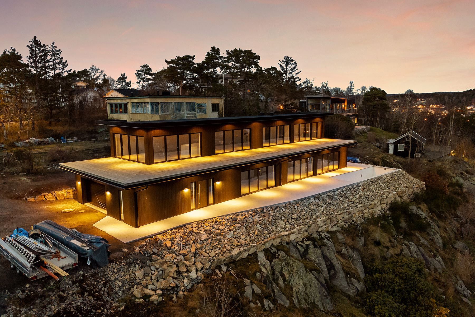 Nu har vi den stora glädjen att få förmedla ett drömhus om 350 kvm med högt och slående vackert utsiktsläge. Denna vackar bostad är under uppförande och det mesta börjar bli klart. Huset kommer att färdigställas till 100 % av entreprenören men som köpare har du möjlighet att komma in i ett tidigare skede för att själv kunna bestämma material- och färgval i exempelvis kök och badrum. Huset byggs med en klart högre standard än vad vanliga kataloghus erbjuder Den extra rymden med hög takhöjd, stora rum och enorma fönsterpartier ut mot havet är oerhört vackert. Takterrassen på över 150 kvm inspirerar till kreativ inredning av utemiljön och från spaavdelningen på entréplan kommer du bland annat att kunna njuta av både havs-och poolutsikt från den glasade bastun. Huset har redan från start ett platsbyggt wi-fi system som tar hand om ditt moderna och intelligenta hem. Det finns också inbyggd frikyla i bostaden som försäkrar dig om en sval bostad även de mest varma sommardagarna. (Frikyla innebär att du använder kylan från bergvärmens köldbärarkrets till att kyla bostaden. Samtidigt som du får gratis kyla gör du bergvärmen effektivare genom att tillskjuta värme till köldmedlet).