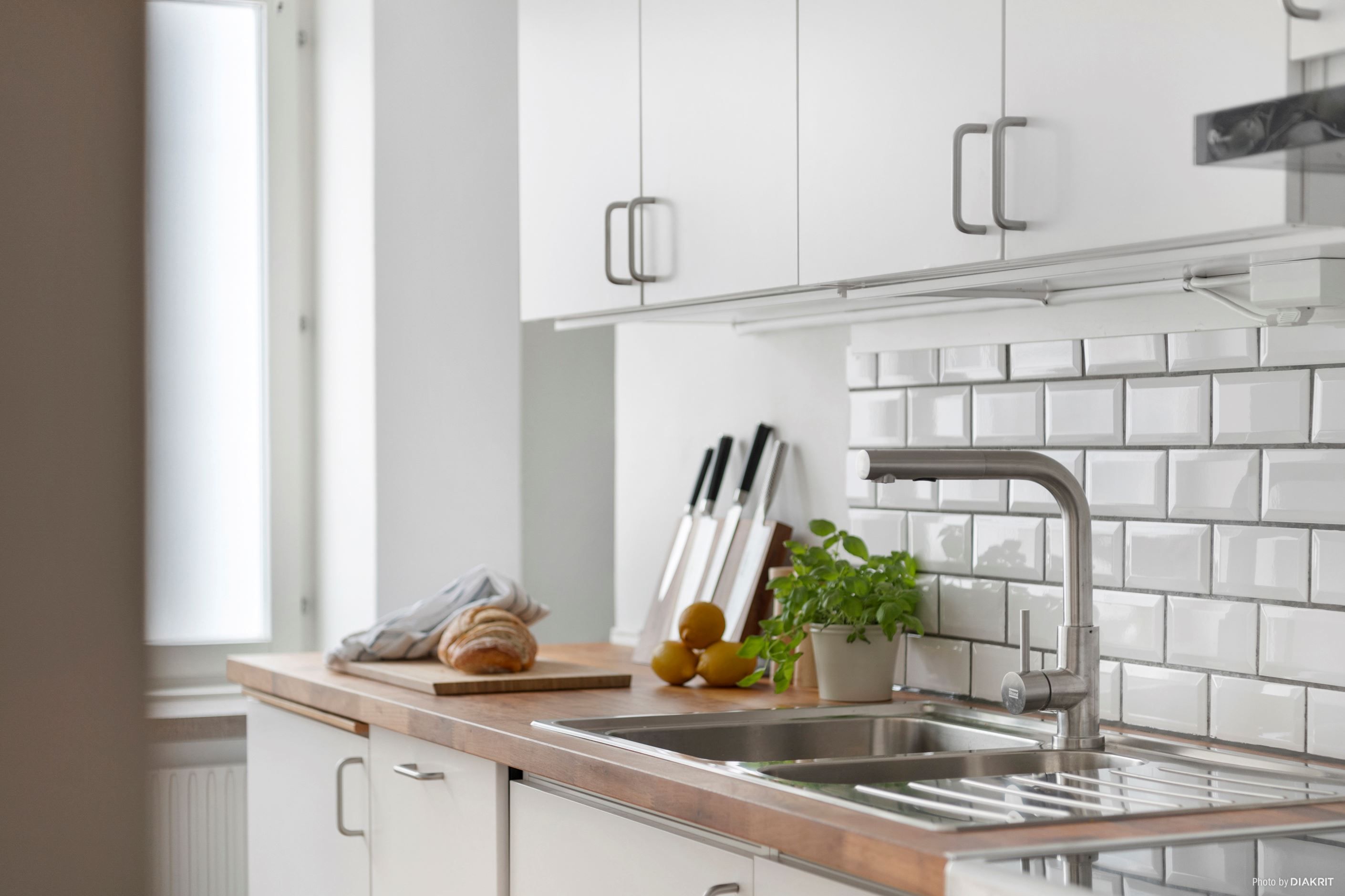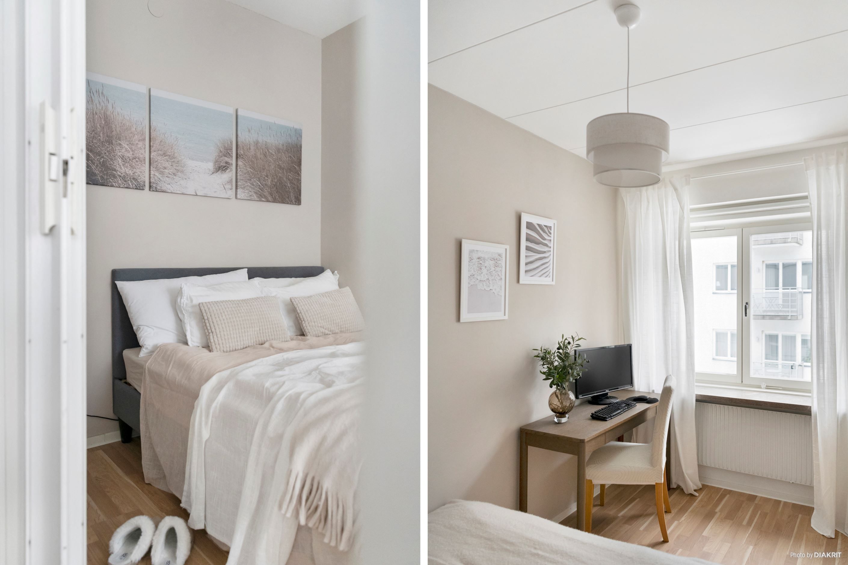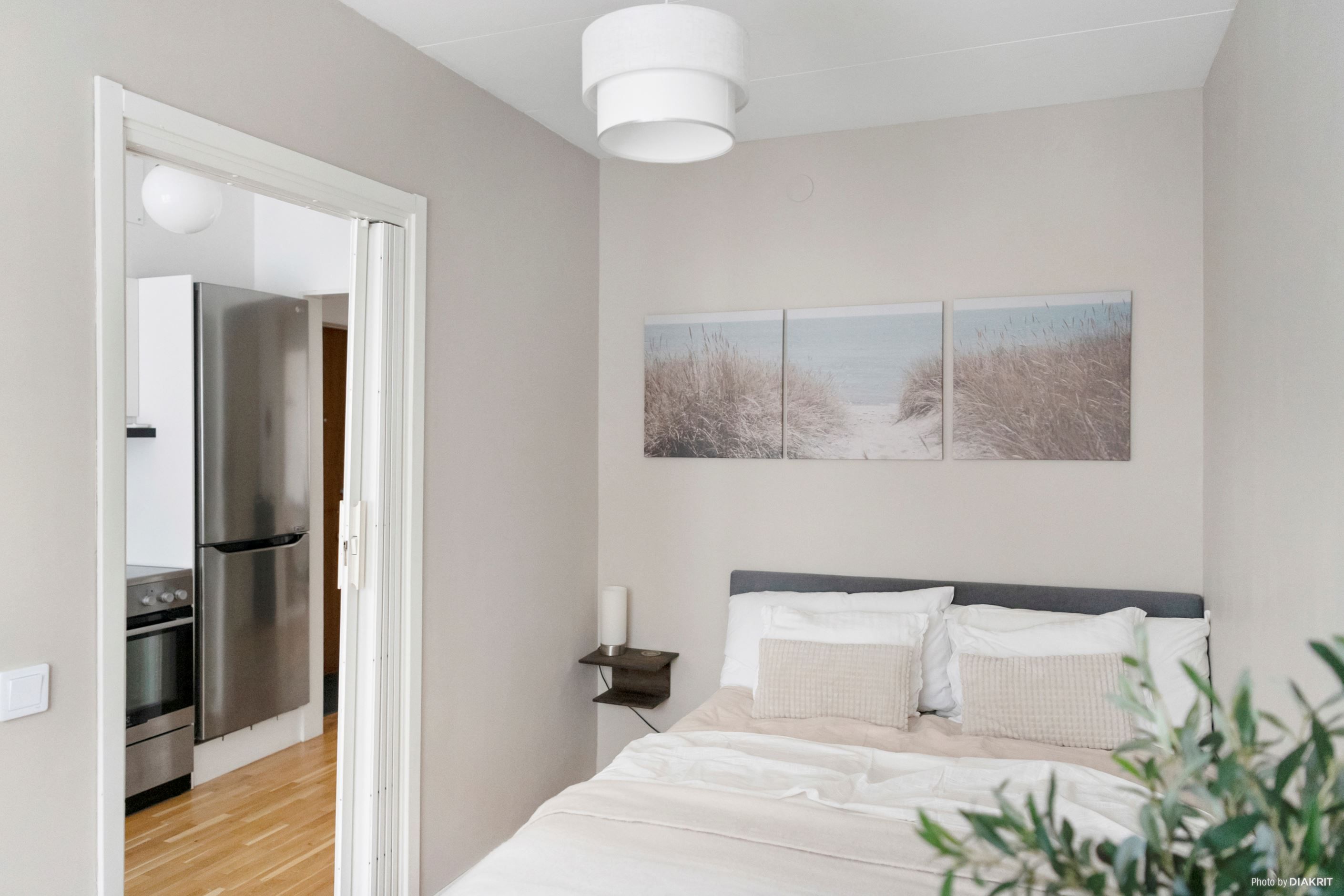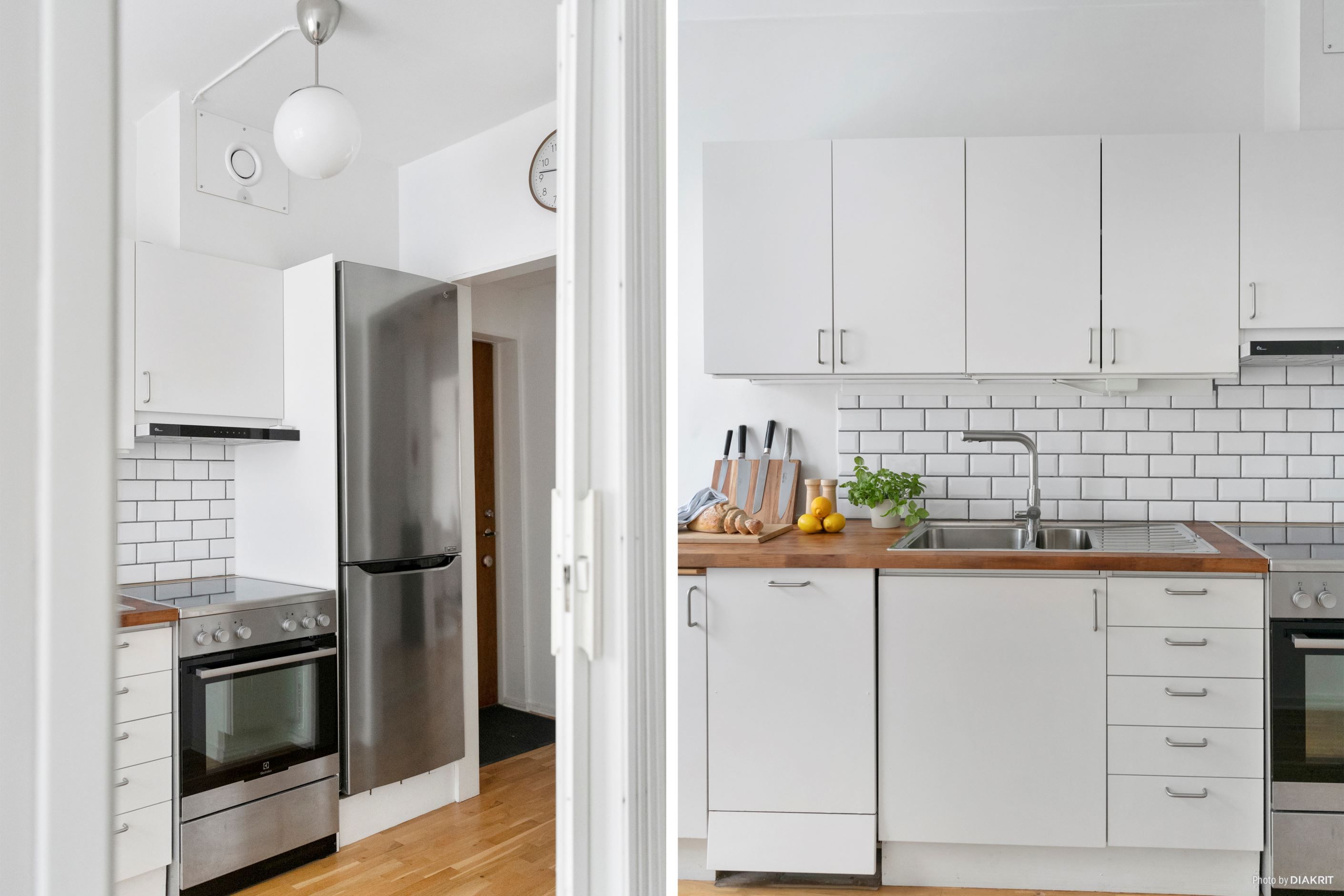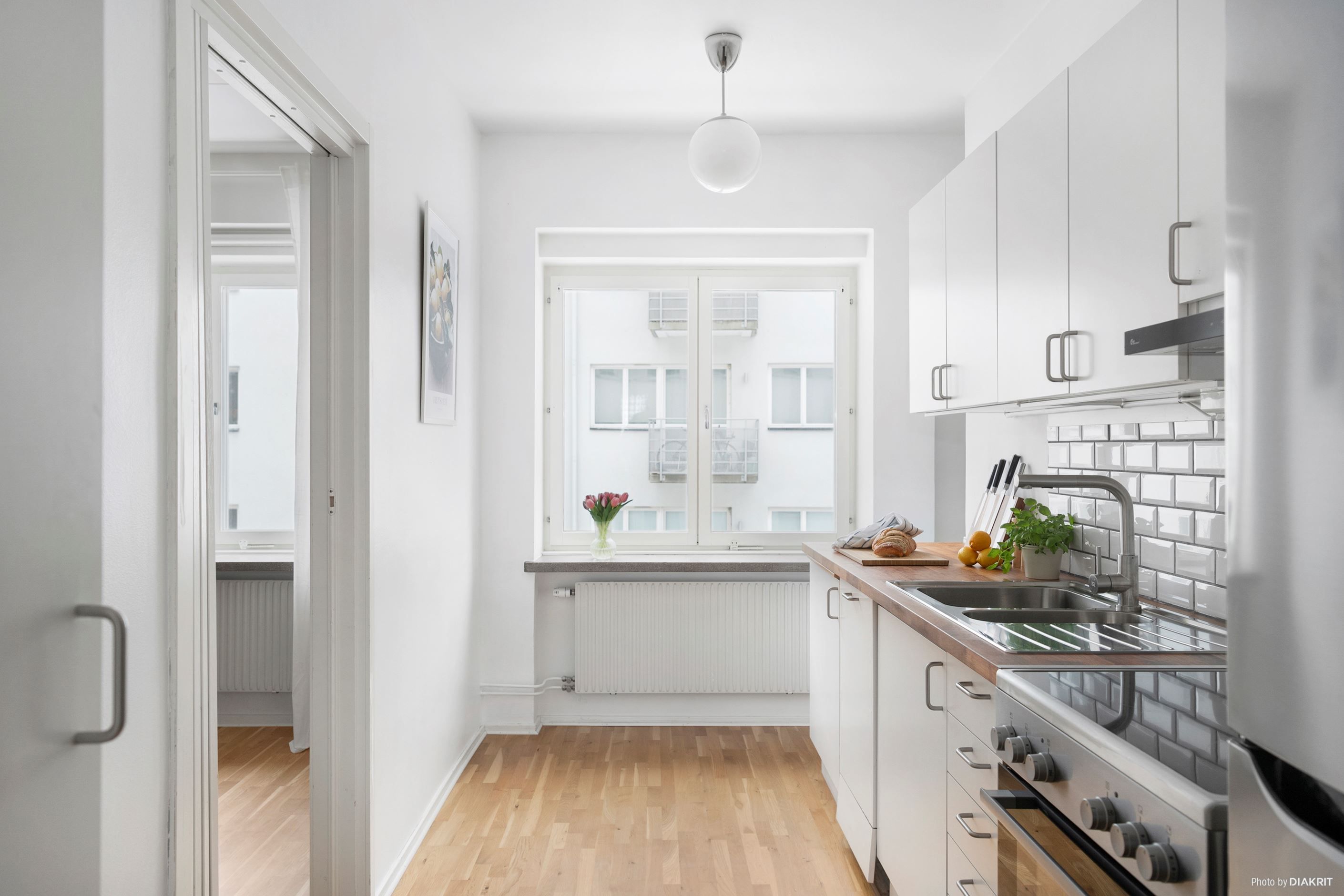Till höger från hallen möts vi av köket – här samspelar ljusa väggar och vit köksinredning med en bänkskiva i trä. Den maskinella utrustningen består av ugn med häll, kyl/frys, fläkt, vask och diskmaskin. Det finns gott om förvaring och även här blir ljusinsläppet optimalt tack vare det stora köksfönstret. För den som önskar finns plats att skapa ytterligare en matplats eller förvaringsyta även här. Sovrummet blir lägenhetens lugna oas; här finns plats för både dubbelsäng och förvaringsmöbler eller arbetshörna.