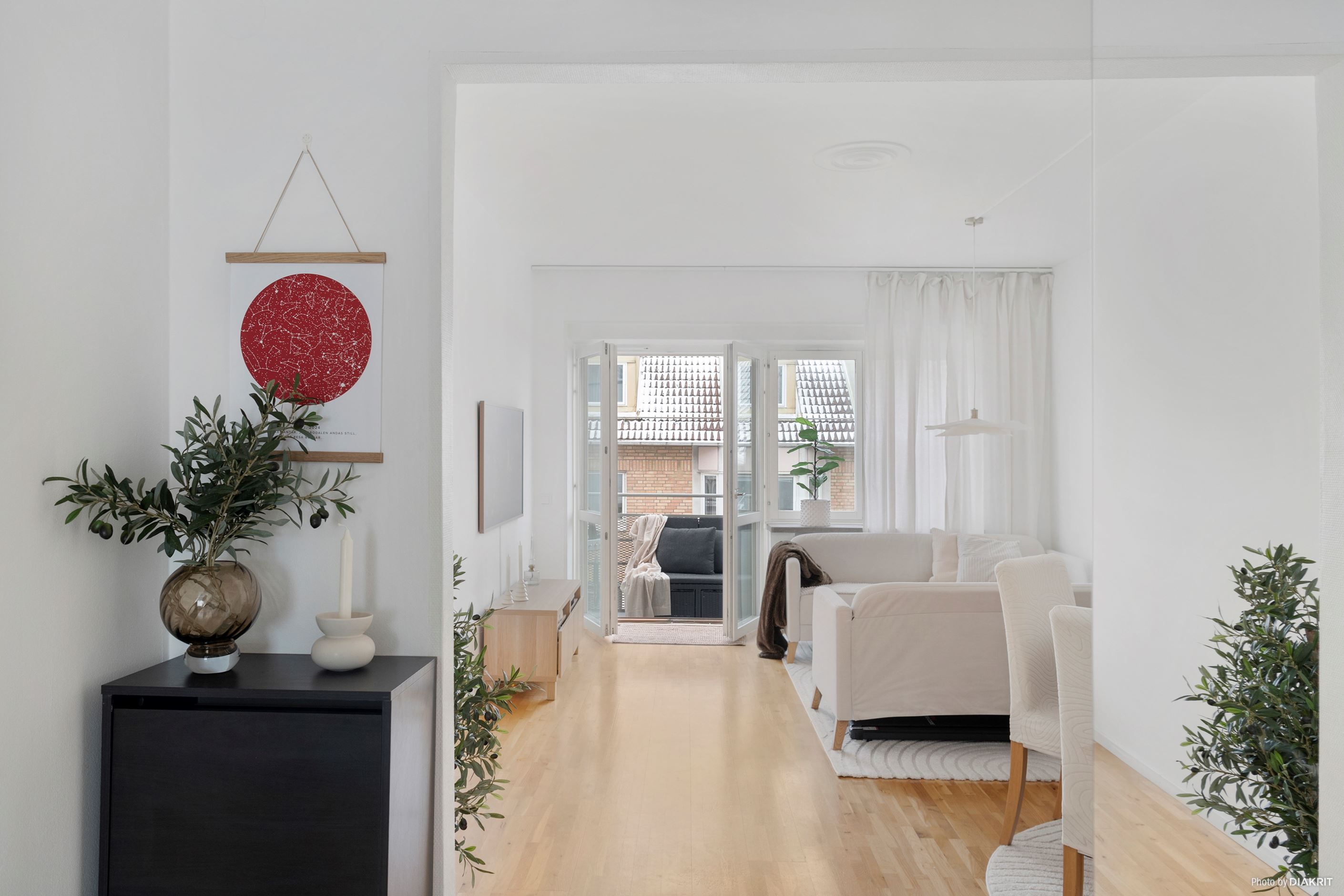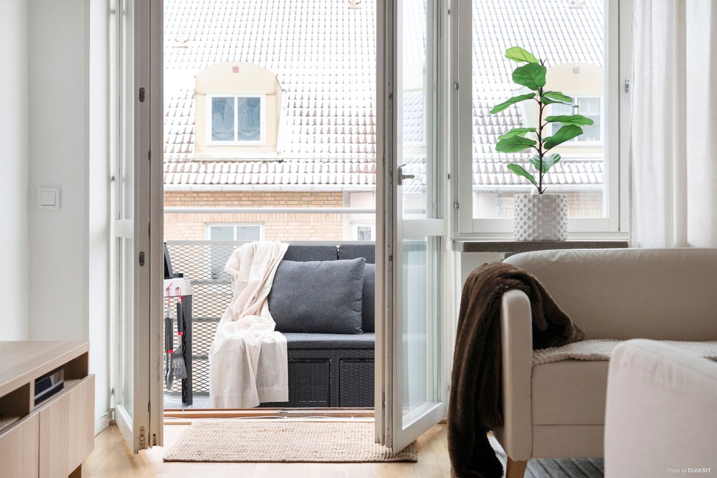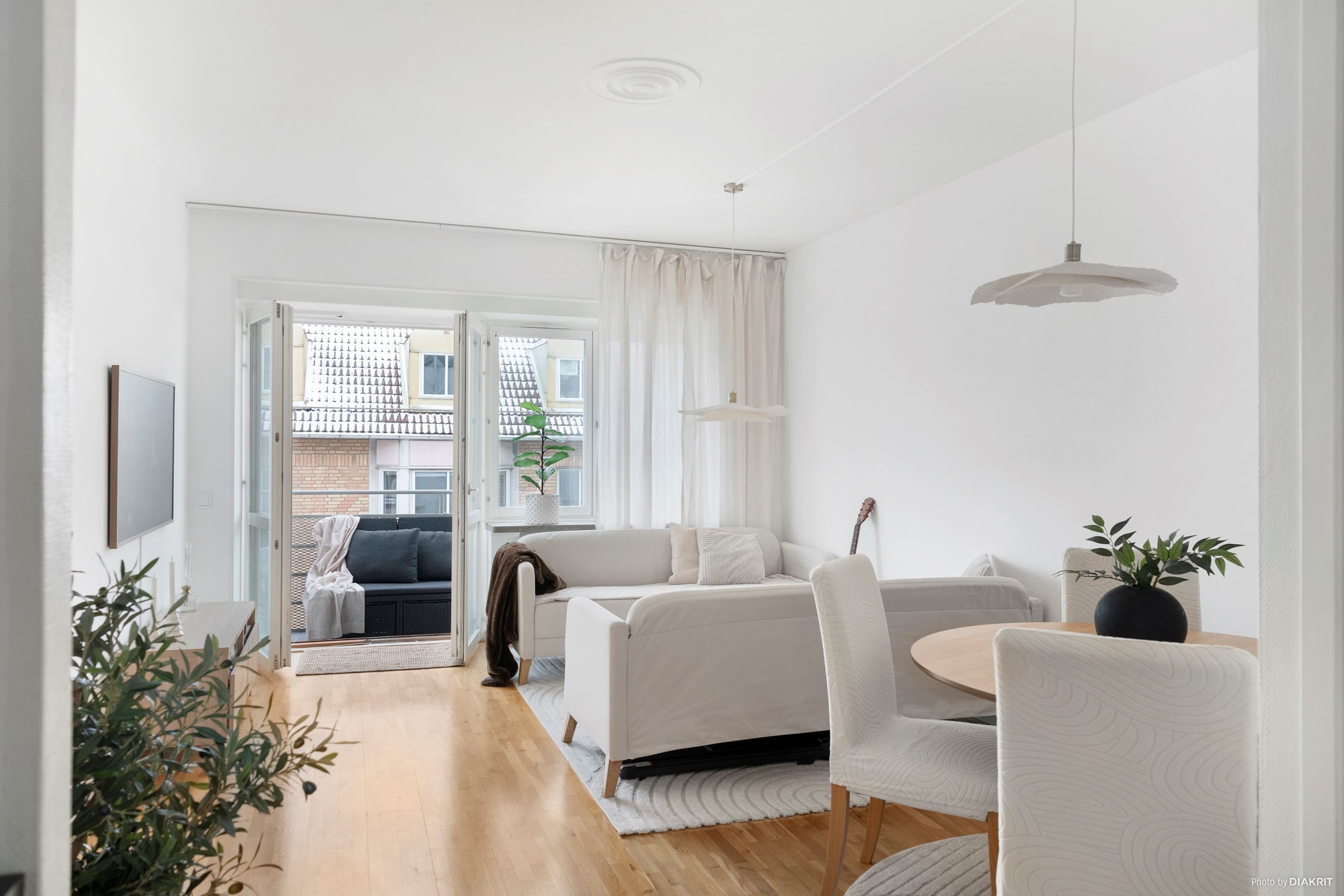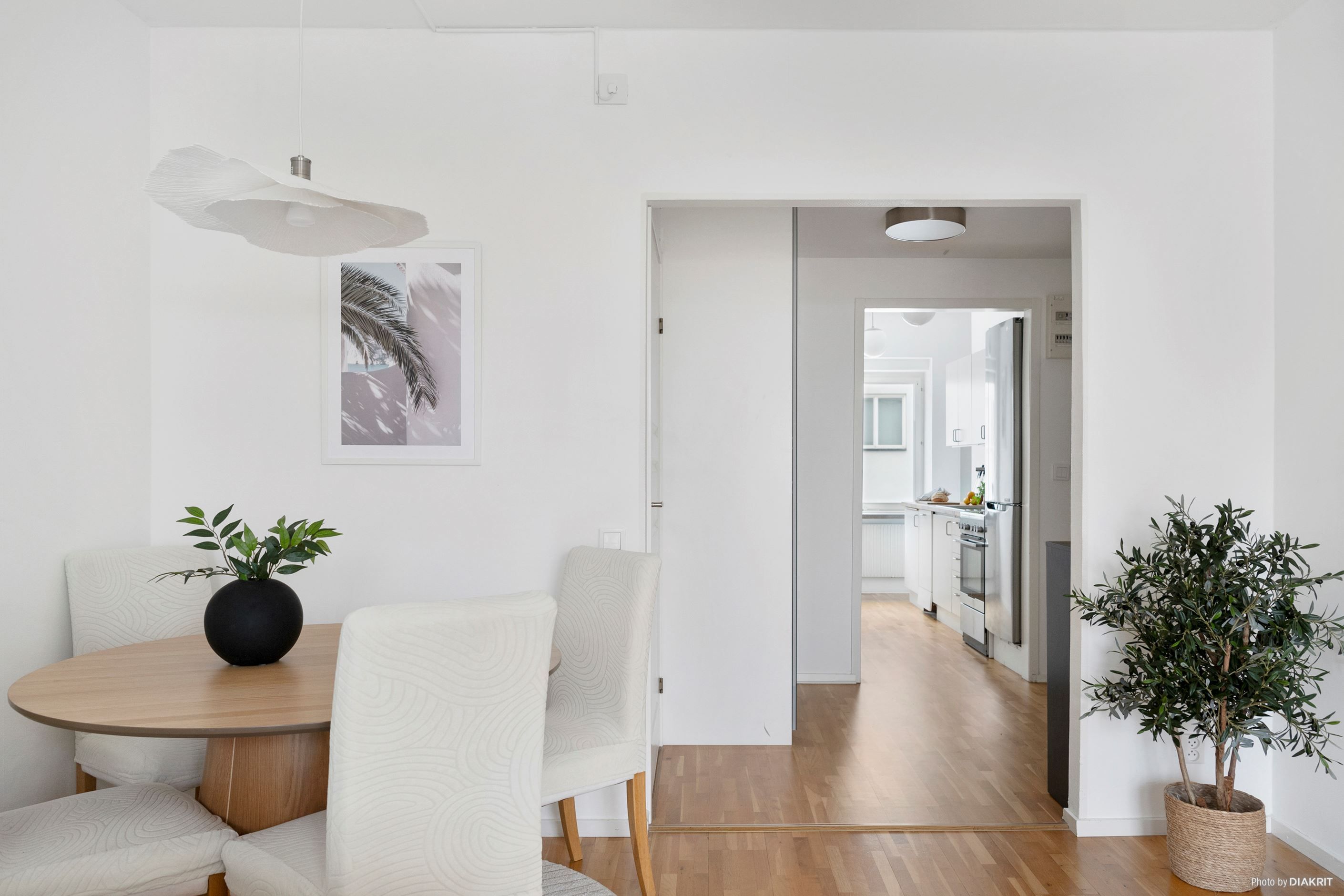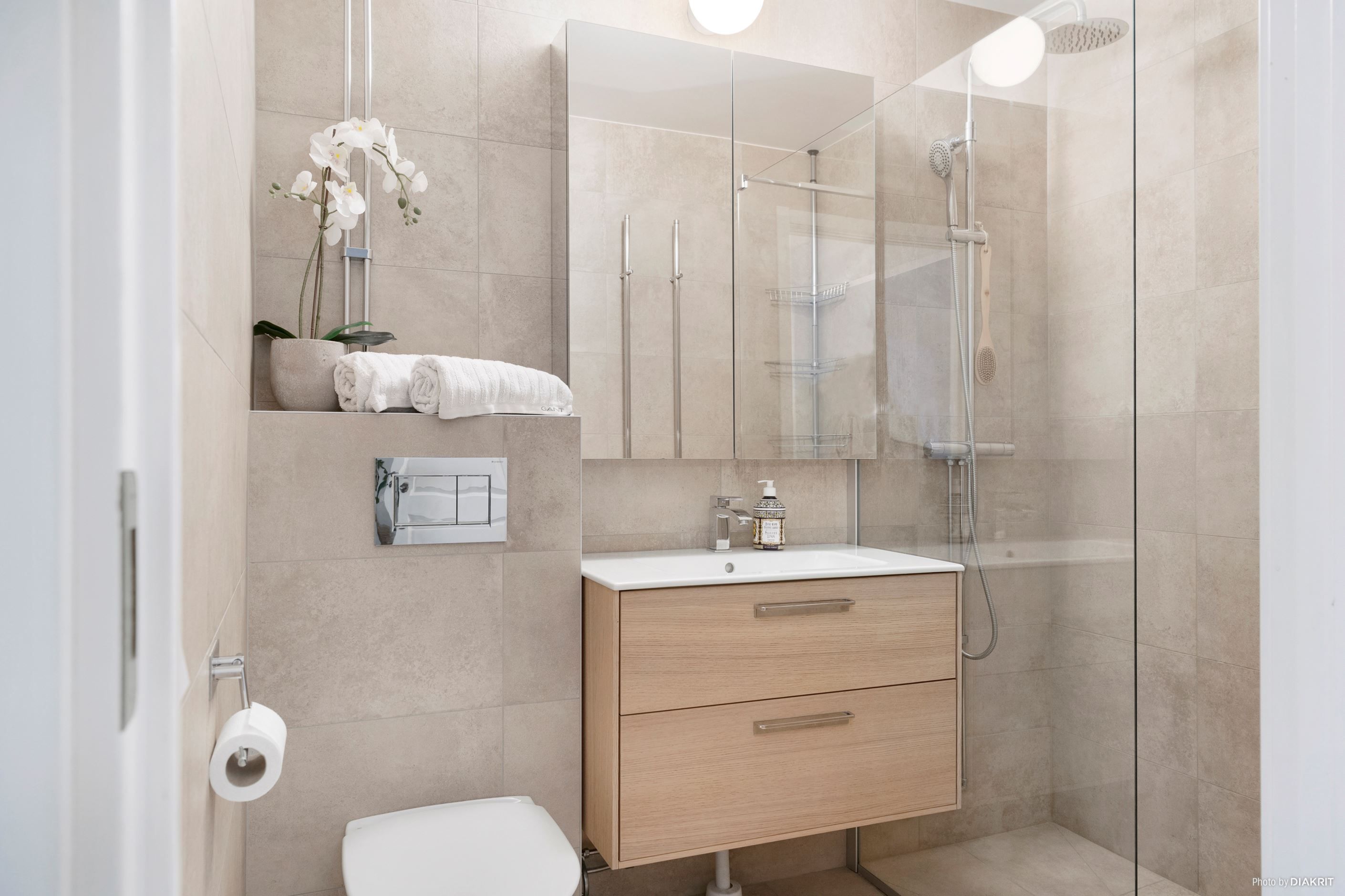 Lägenheten välkomnar oss med en luftig hall med inbyggda garderober för optimal förvaring av ytterkläder och skor. Till vänster möts vi av ett ljust och rymligt vardagsrum med plats för såväl soffgrupp med tv som matplats. Härifrån når vi även den inbjudande balkongen i optimalt västerläge, stor nog för grill och sittplatser. Från hallen når vi även det nyligen renoverade badrummet, utrustat med dusch med glasväggar, vask med kommod, wc samt handdukstork.