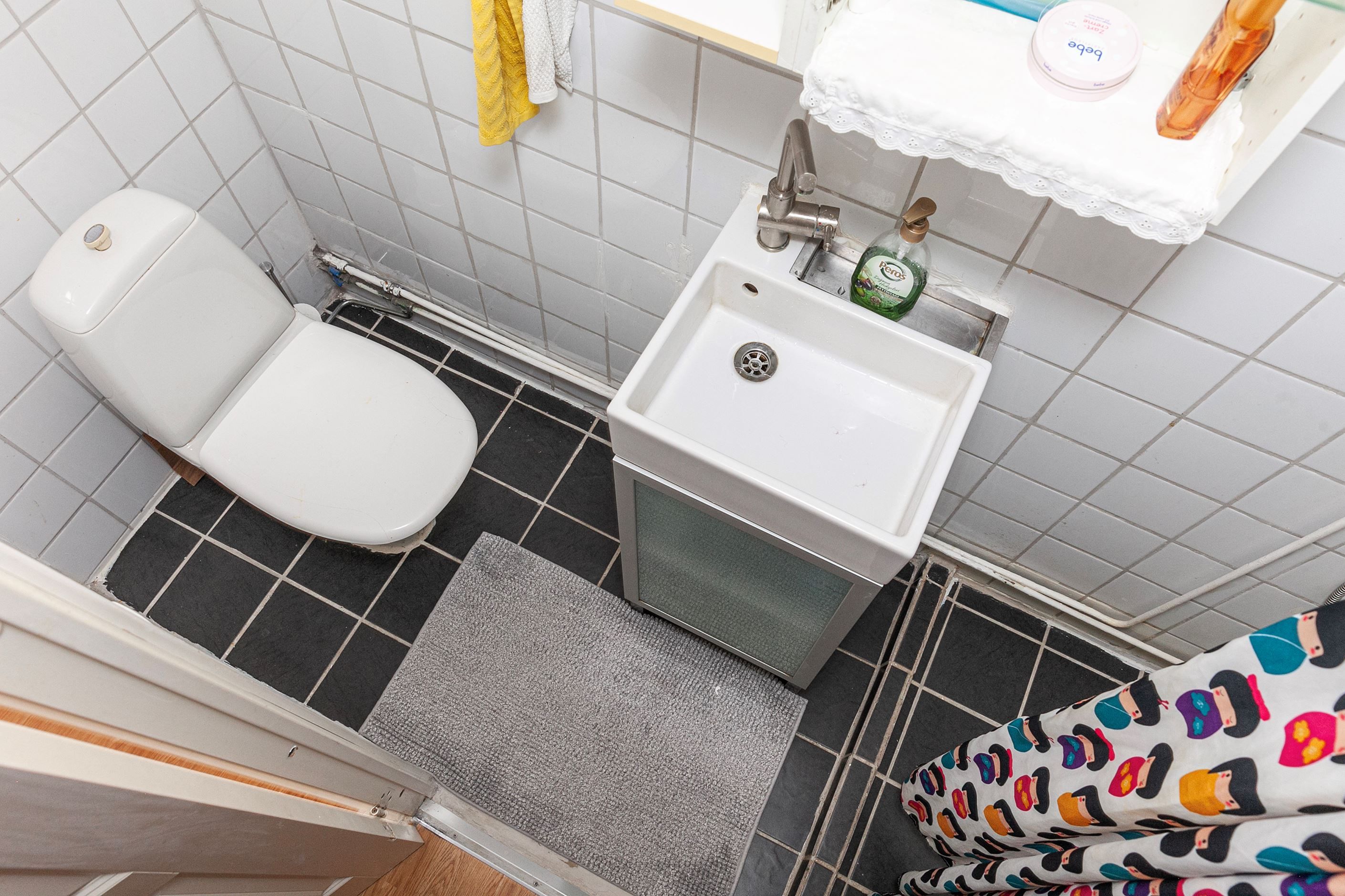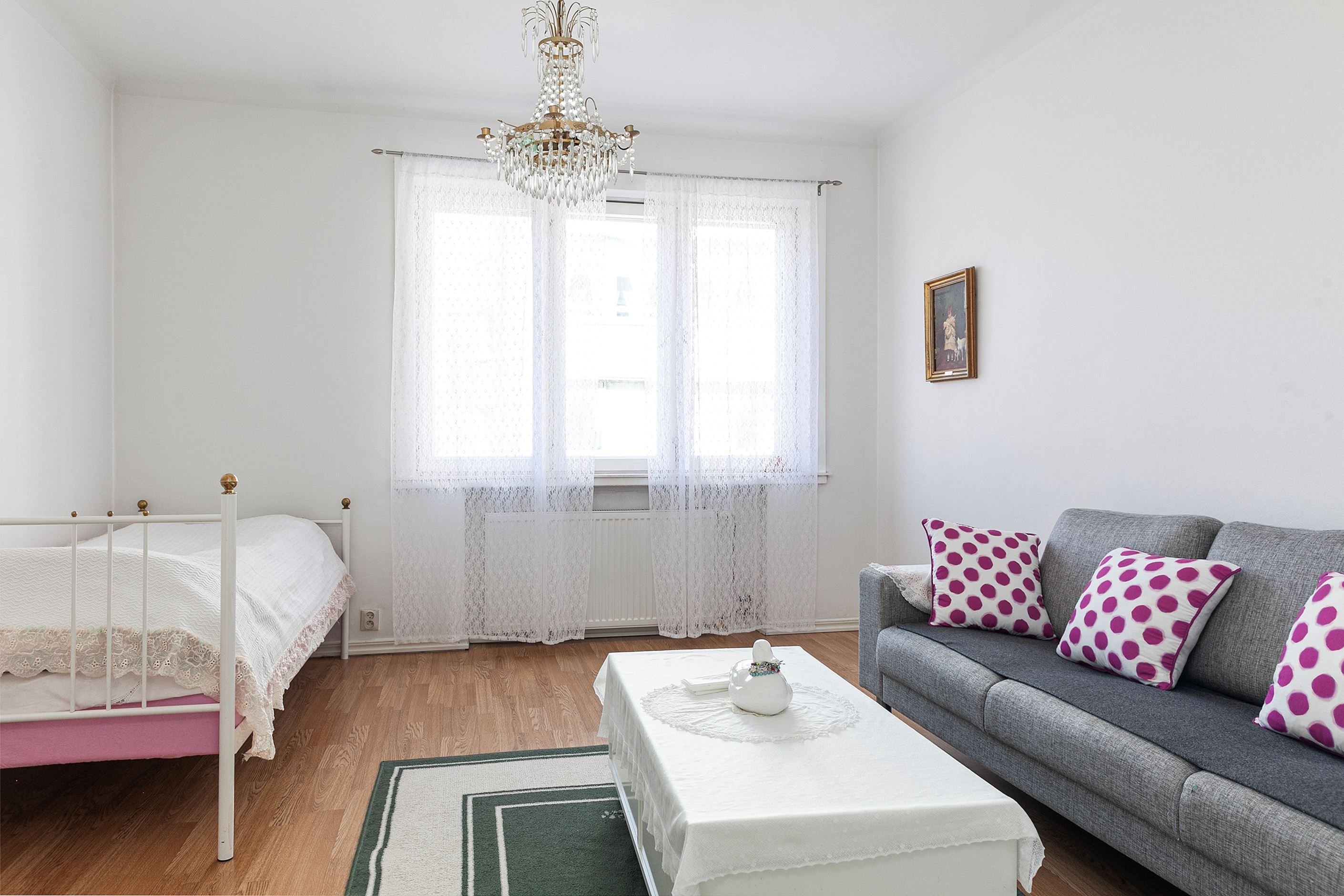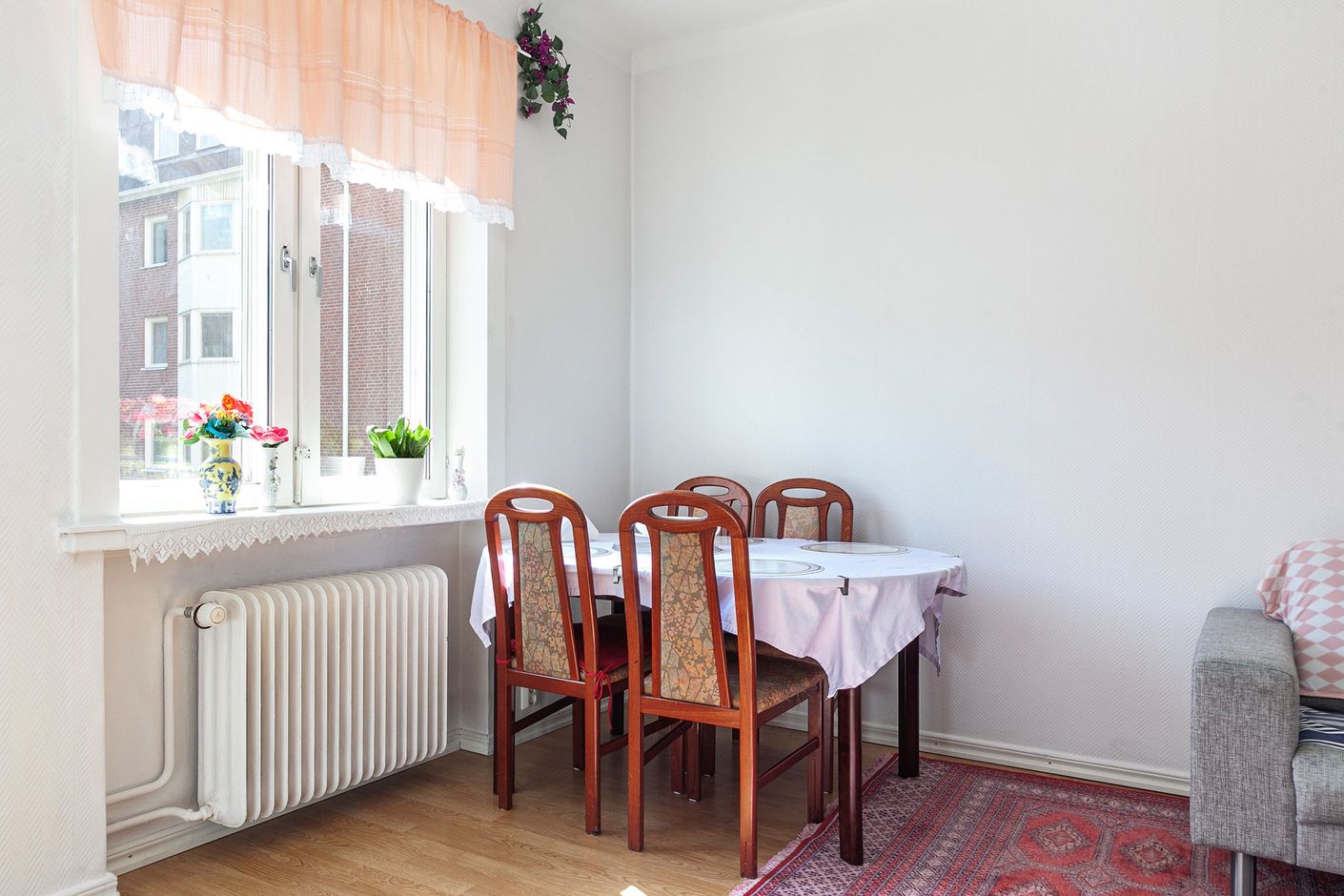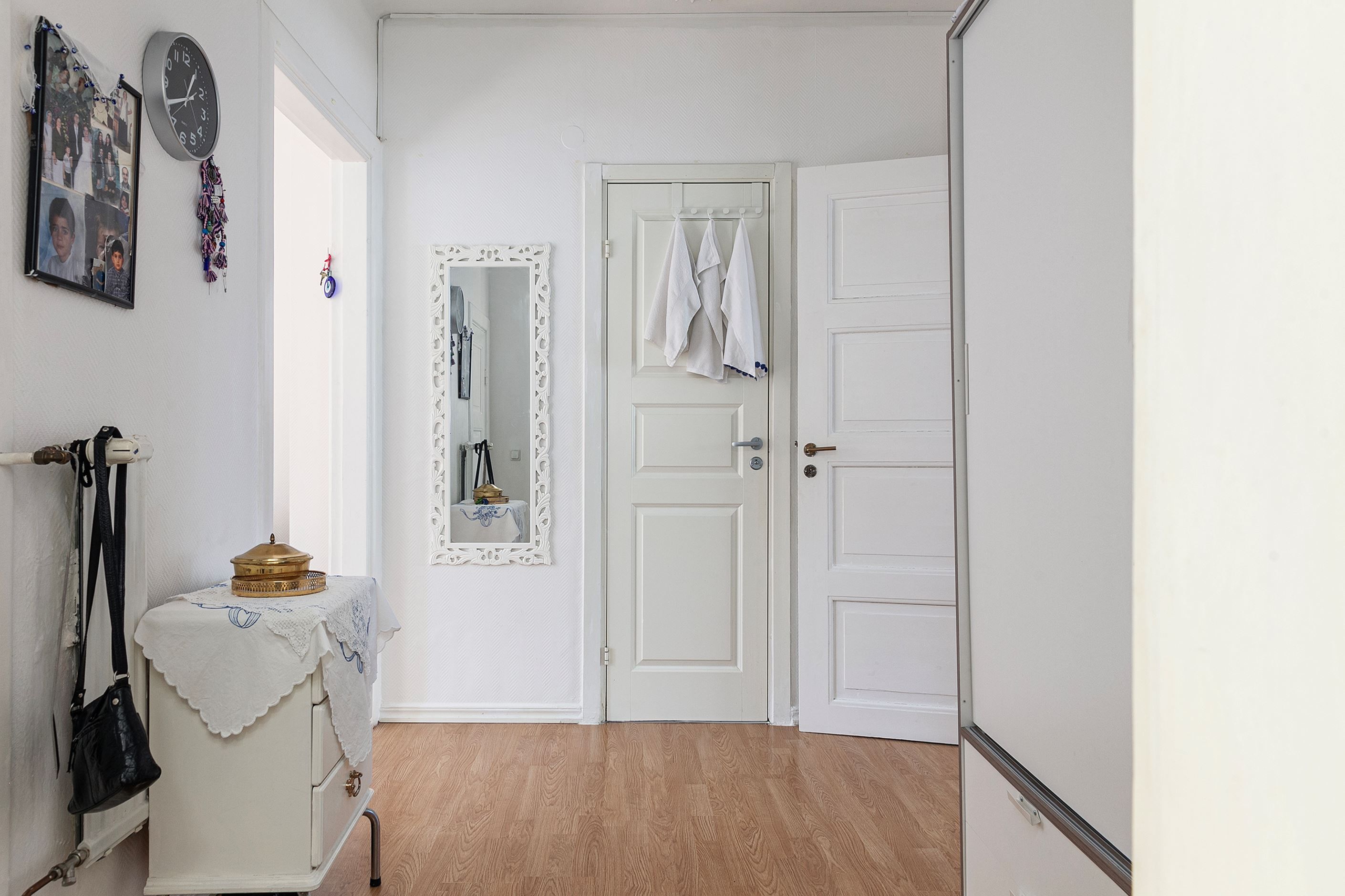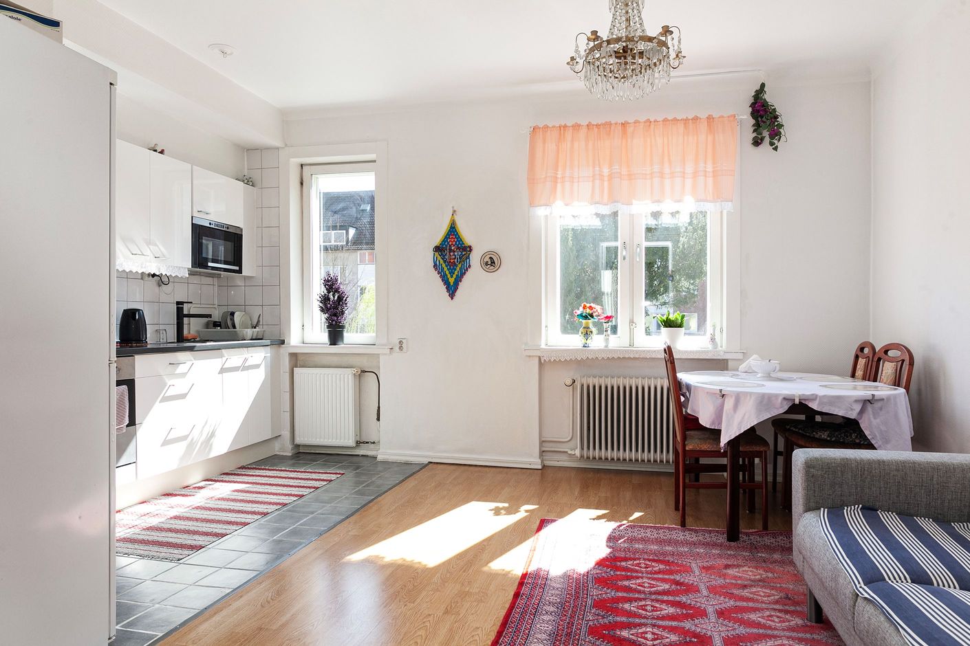 Lägenheten är genomgående och har ljusinsläpp från två väderstreck, vilket ger en öppen och trivsam känsla. Köket har öppnats upp mot ett tidigare sovrum och fungerar idag som ett socialt allrum i öppen planlösning. Det tidigare vardagsrummet har istället omvandlats till ett rymligt sovrum med plats för både säng, förvaring och övrigt möblemang. Badrummet är helkaklat och praktiskt inrett med dusch, toalett och handfat med kommod.