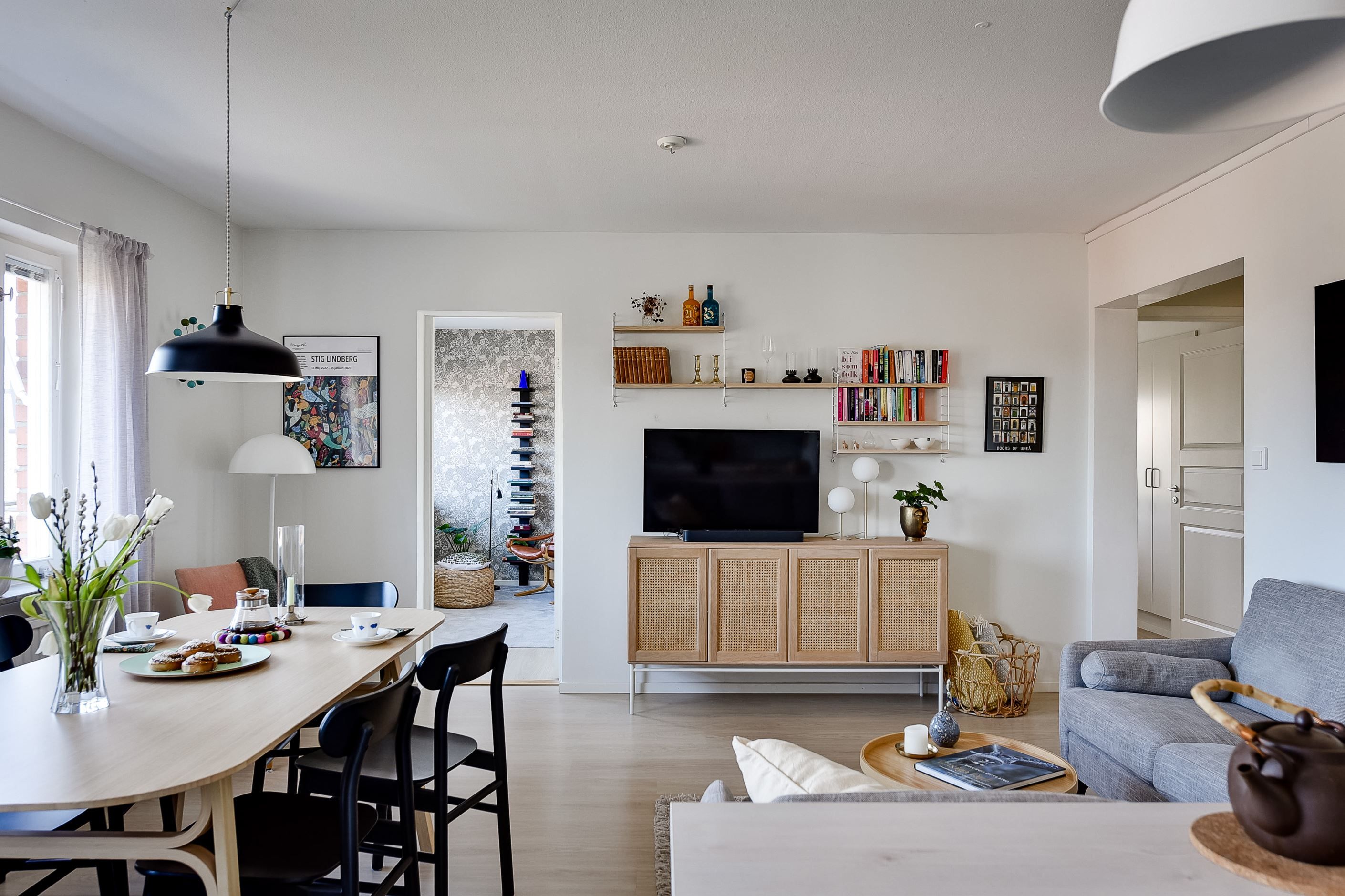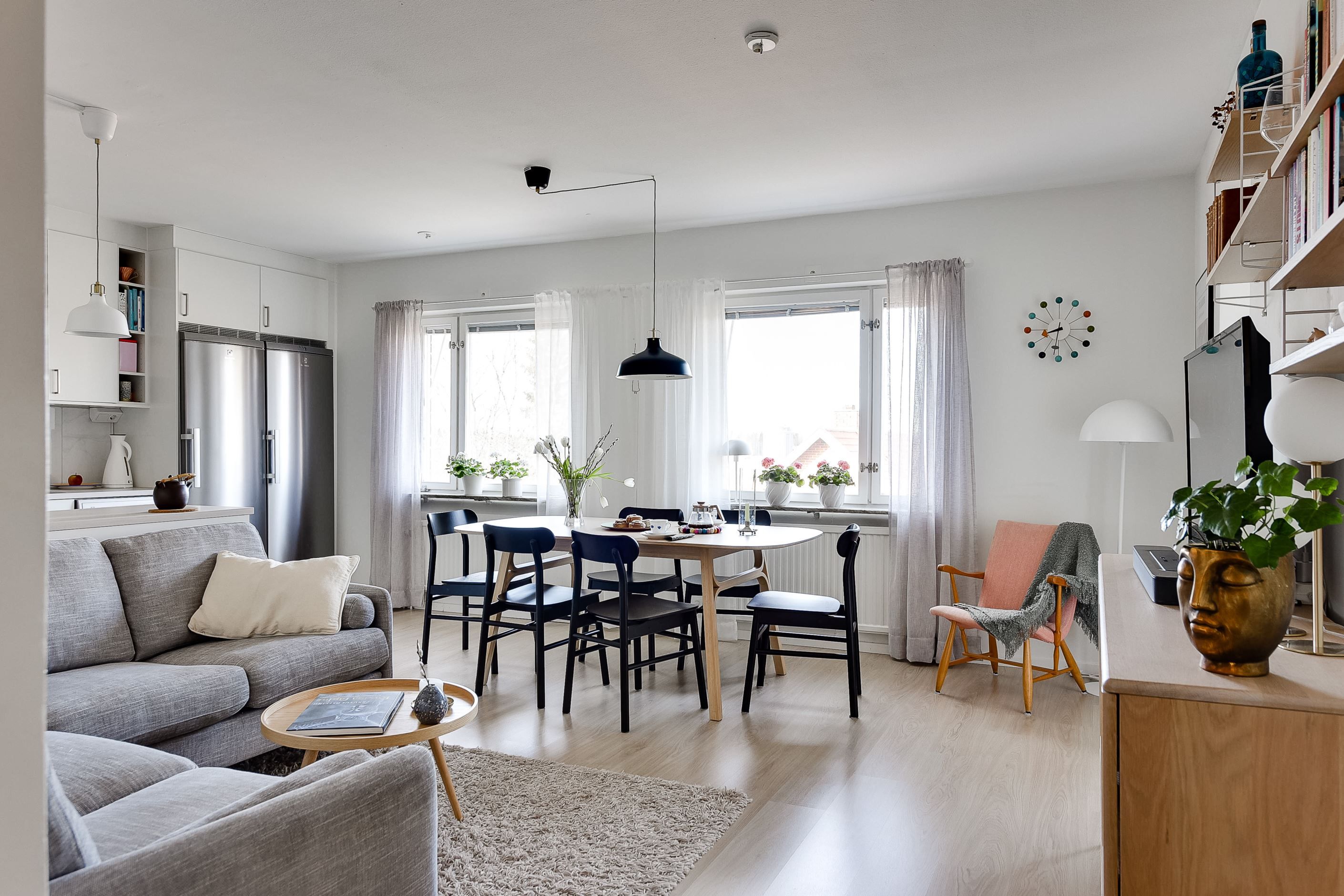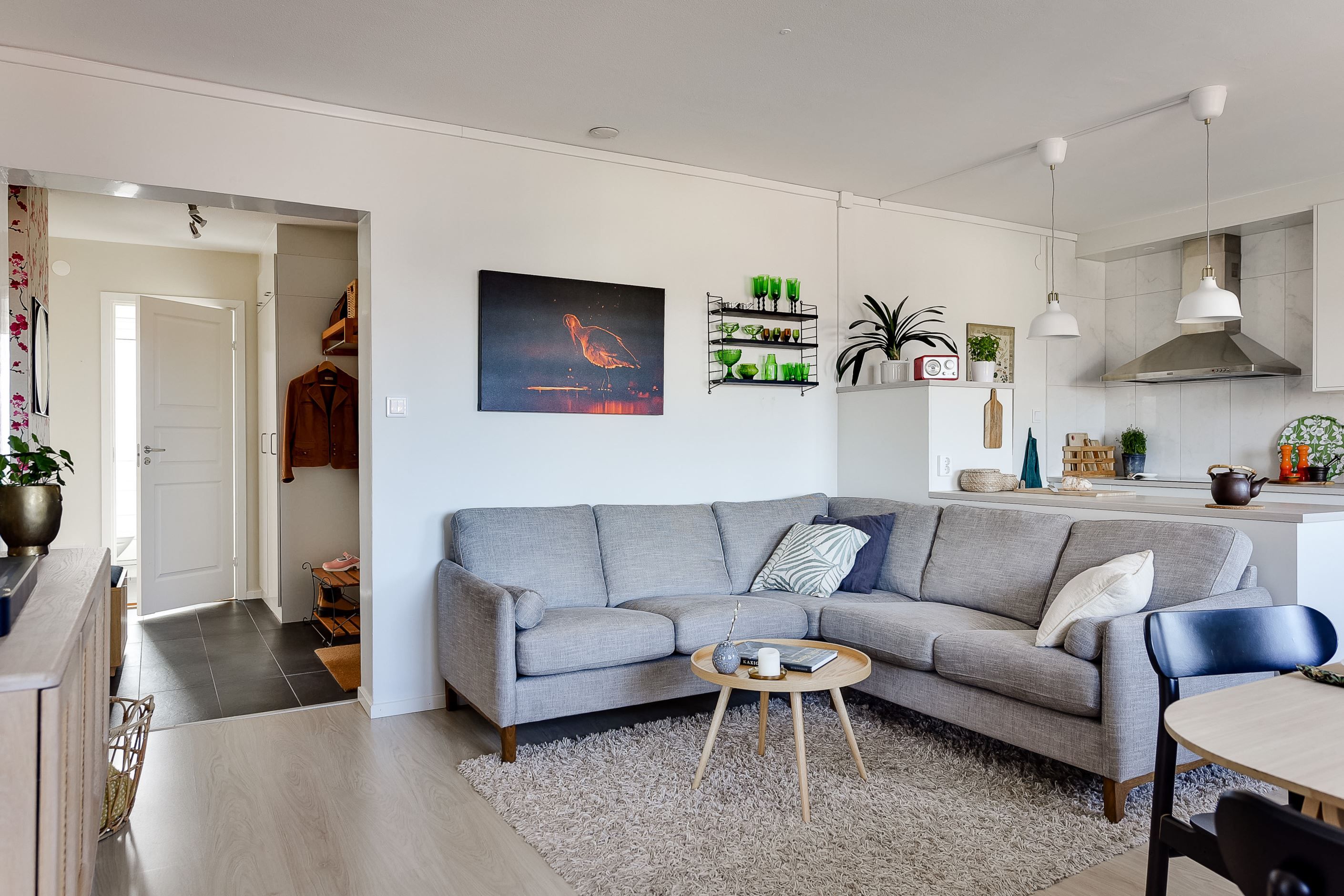 Trevligt ljusinsläpp tack vare gavelläge och fönster åt tre väderstreck. Lägenhetens 70,2 kvm disponeras väl genom ett luftigt vardagsrum i öppen planlösning med köket i stilrena färger och köksö. Två rymliga sovrum med plats för dubbelsäng och förvaring samt ett extra sovrum som lämpar sig ypperligt för hemmakontoret, gästrum eller barnrum här finner du också utgång till lägenhetens södervända balkong mot den grönskande innergården. Fräscht och helkaklat badrum med bl.a. golvvärme, duschhörn med vikväggar. Välkomnande hall med avhängning och förvaring i två garderober.
