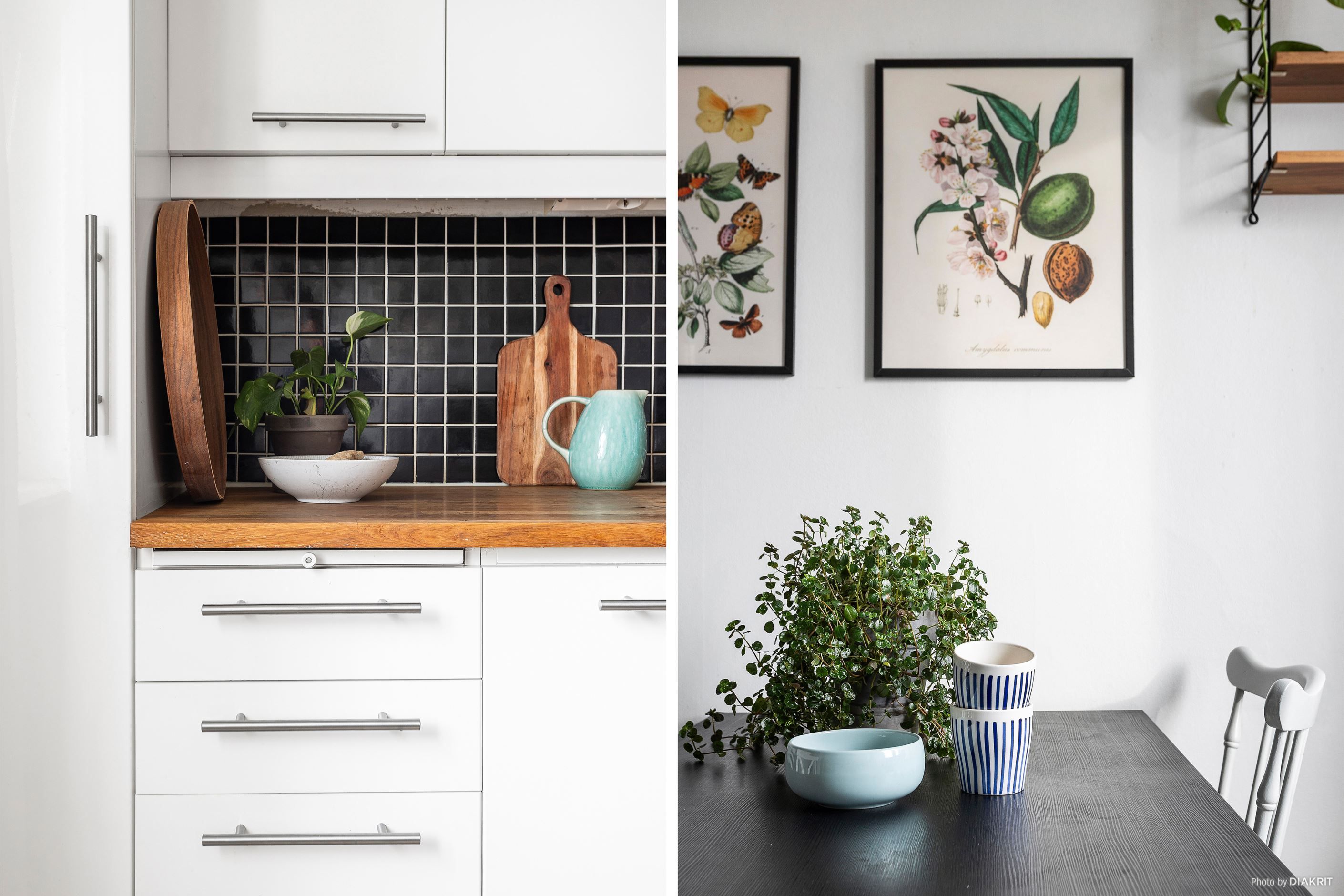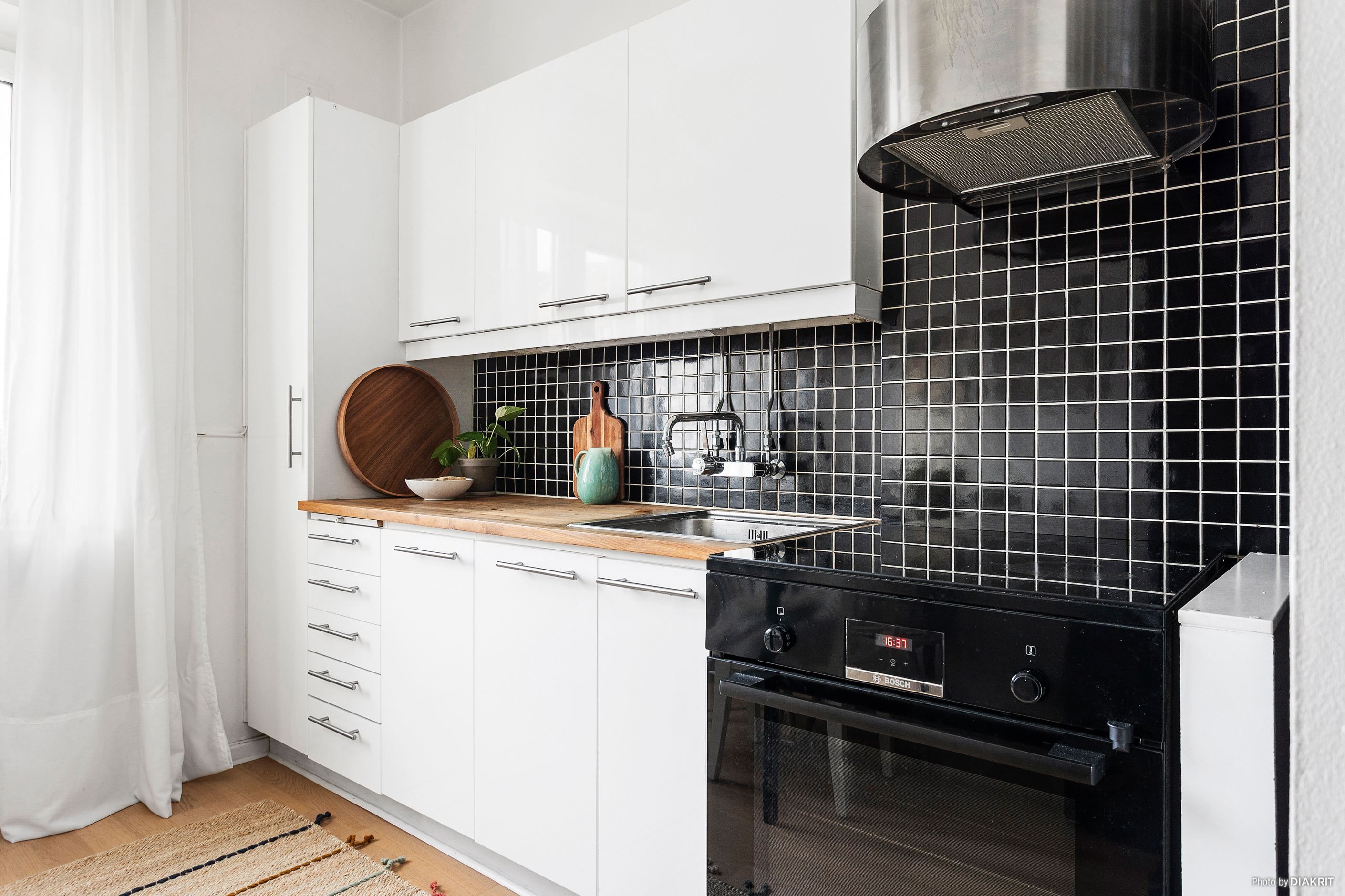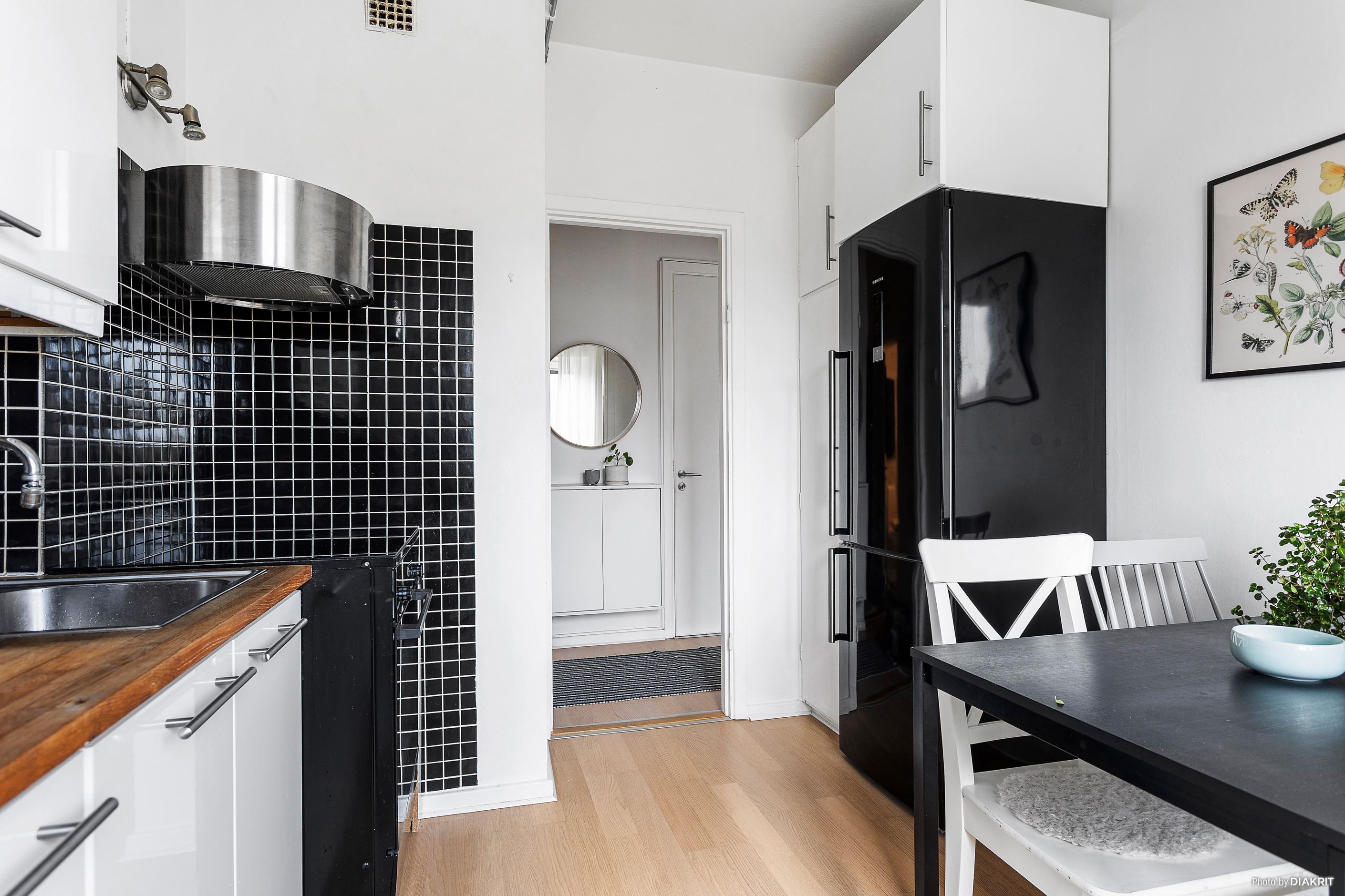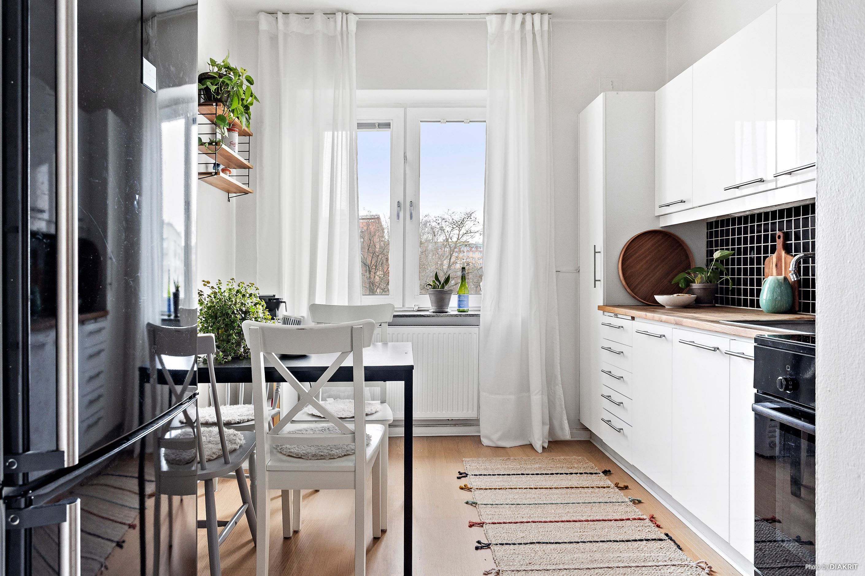 Köket är funktionellt med goda arbetsytor och förvaring. Här finns kyl och frys, spishäll, ugn samt fläkt, och en naturlig plats för matbord gör köket till en social yta att samlas kring.