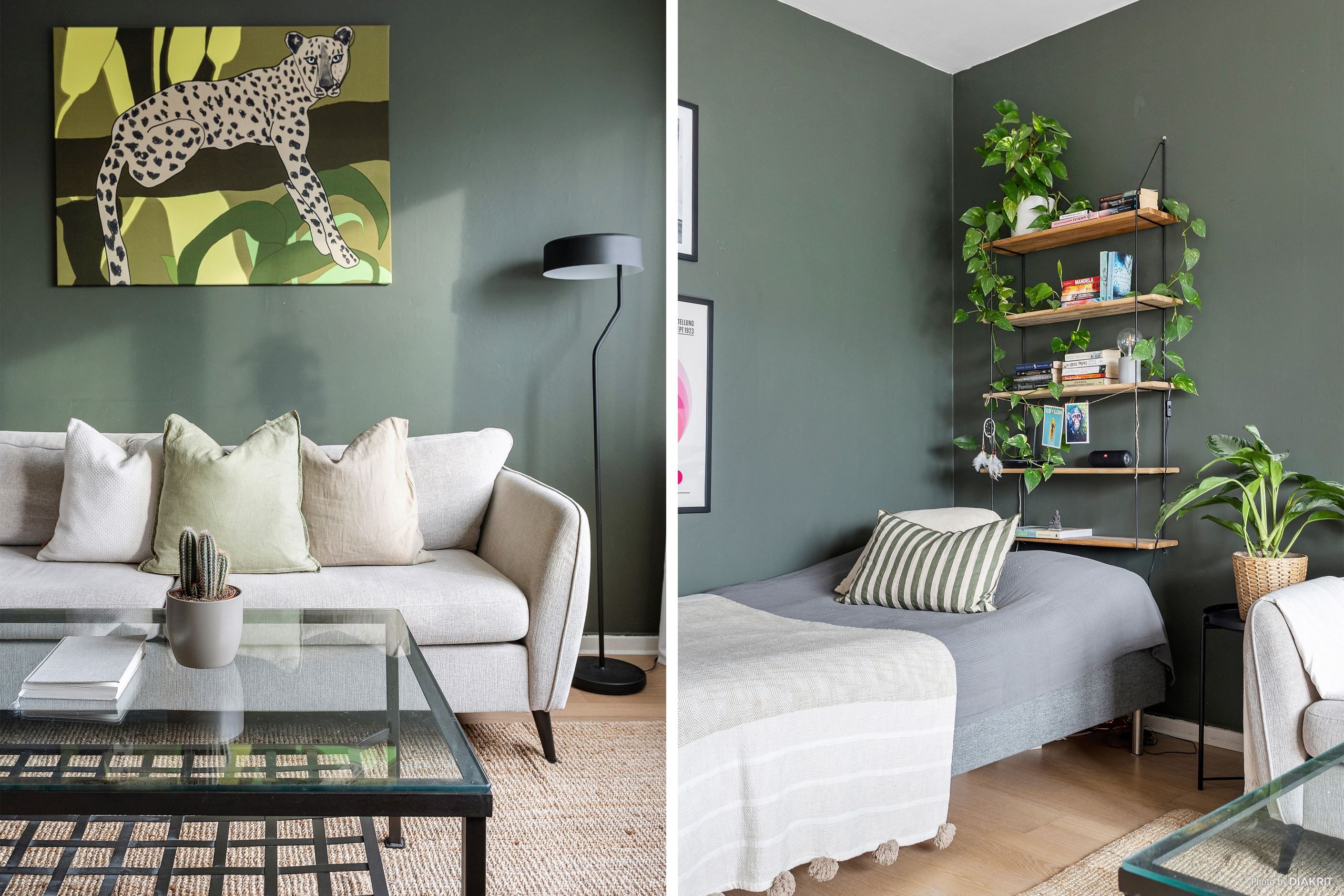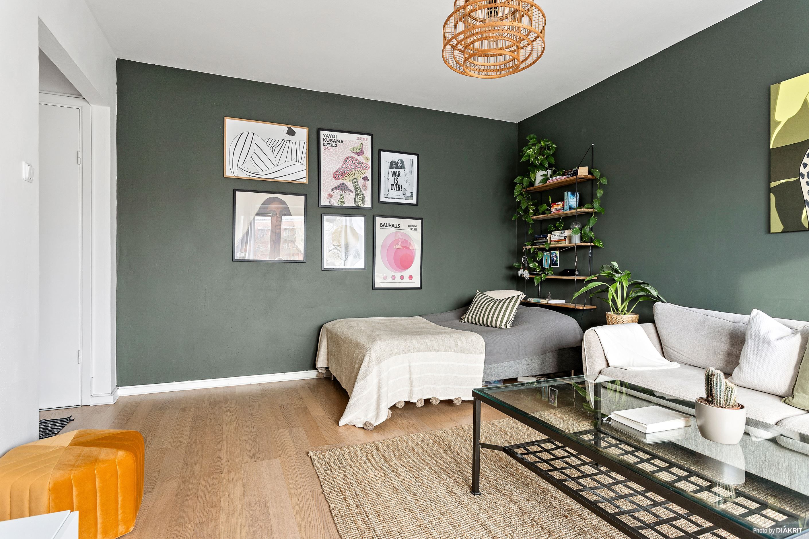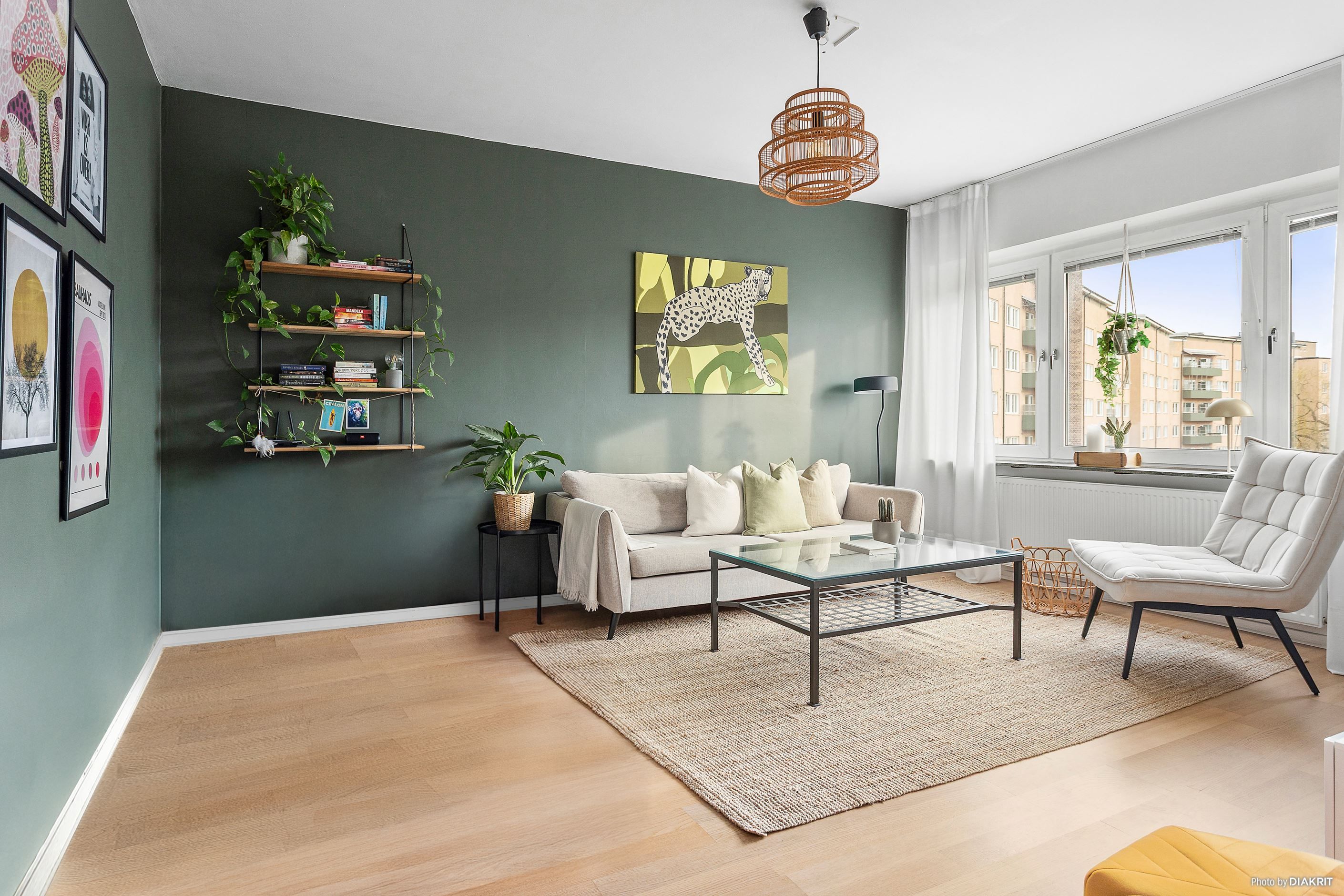 Vardagsrummet är luftigt och lättmöblerat med plats för både soffgrupp och matbord. Den gröna fondväggen ger rummet karaktär samtidigt som de stora fönsterpartierna bidrar med ett härligt ljus.
