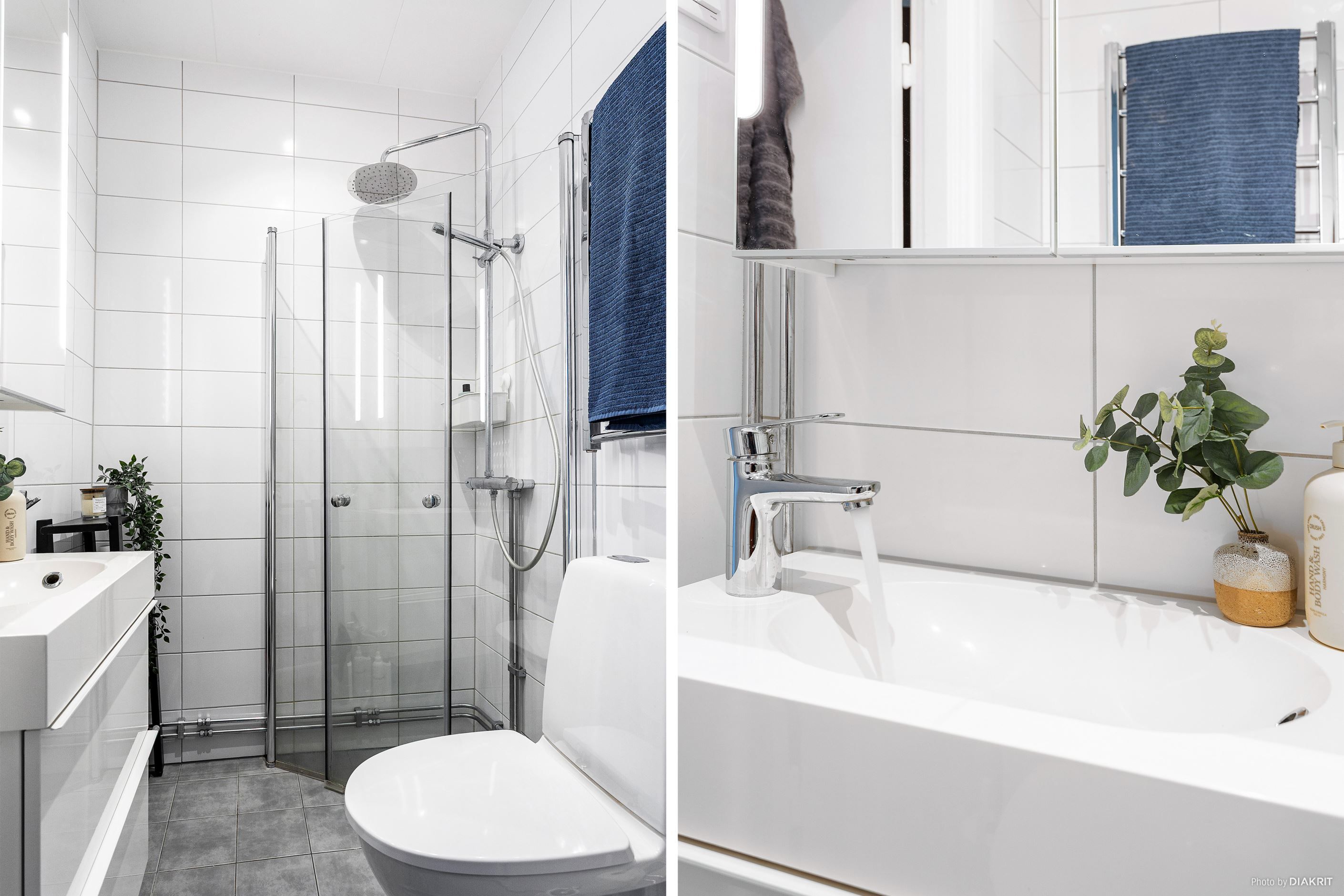 Badrummet har en modern och stilren känsla med vita kaklade väggar som skapar en ljus och neutral bas. Detta kombineras med grått klinkergolv som ger en snygg kontrast och ett mer exklusivt intryck. Här finns duschhörna med glasväggar samt handdukstork, vilket tillsammans skapar ett både funktionellt och trivsamt badrum.