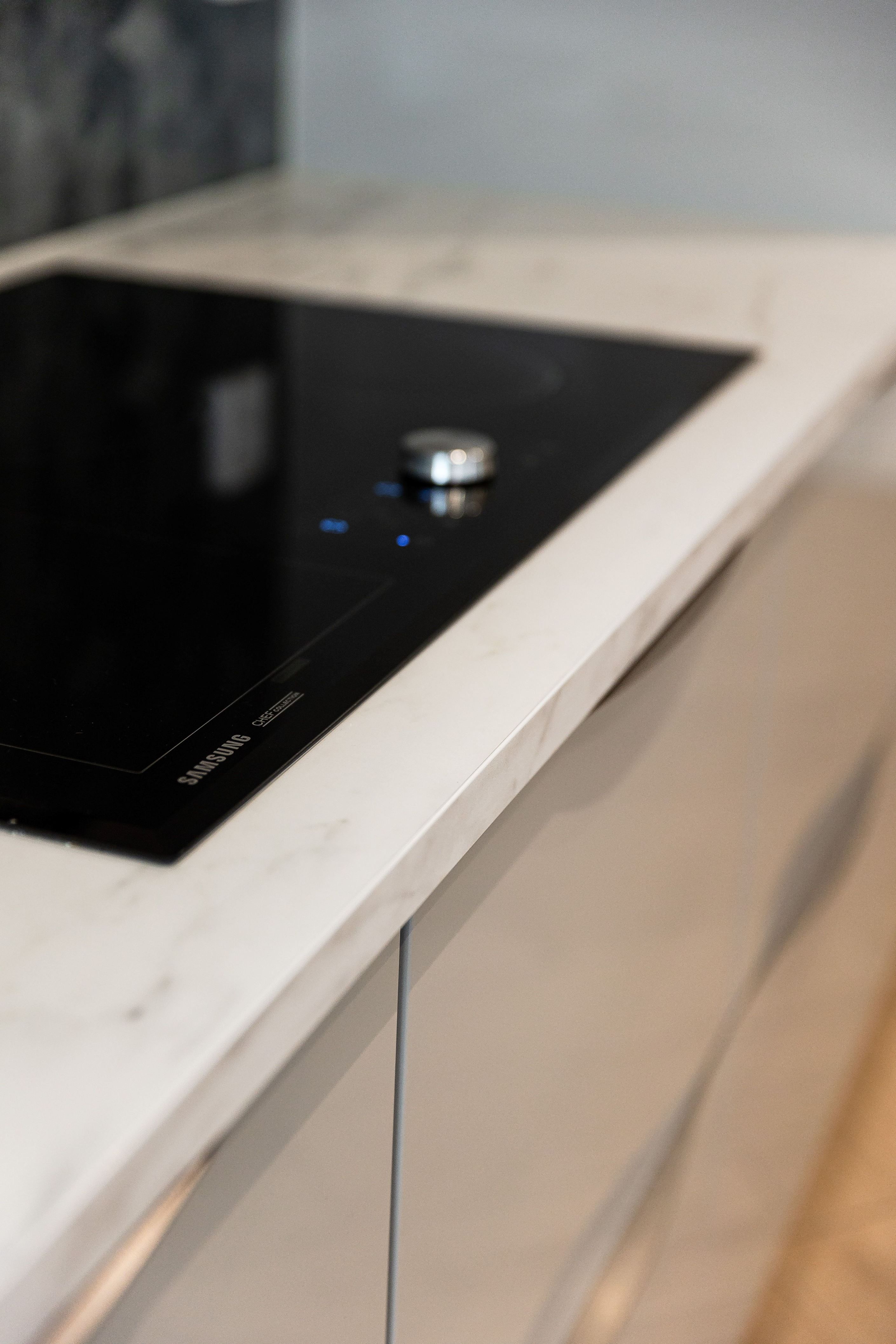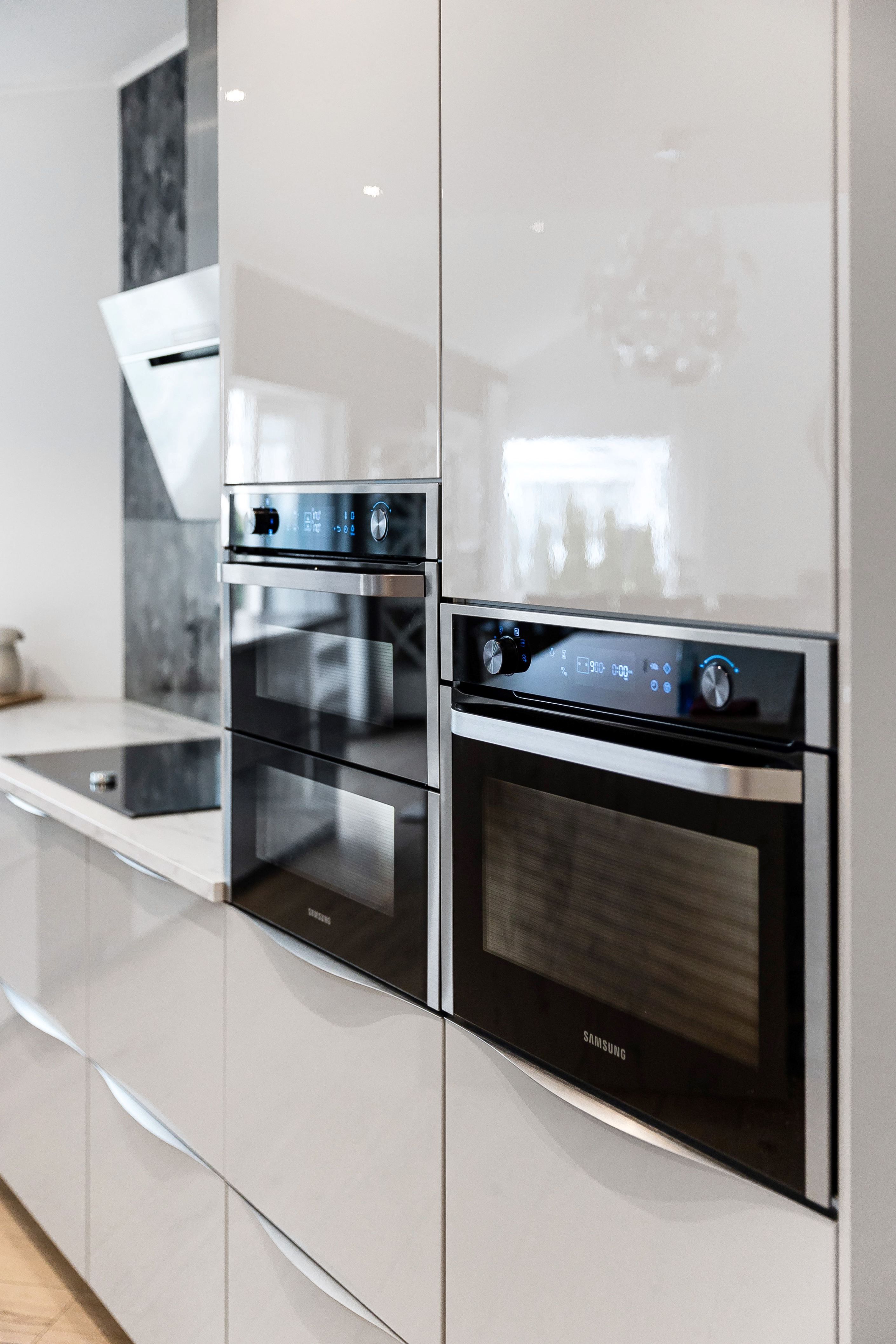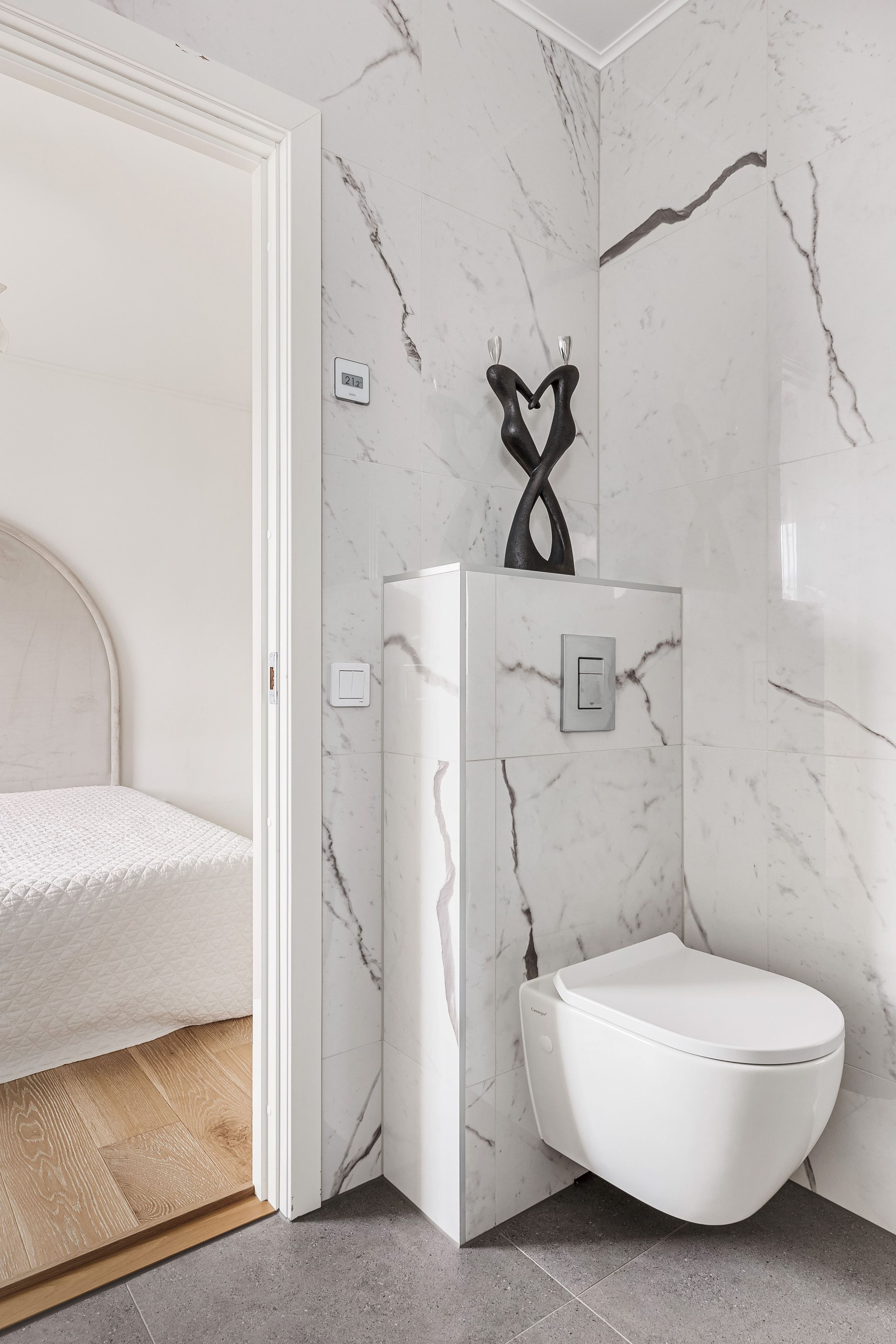 Det rymliga köket är en dröm för den som älskar matlagning, med generösa arbetsytor och extra utrymme på en praktisk köksö. Här finns exklusiva materialval och stilfull design med en tidlös grund i vitt, som kompletteras av eleganta detaljer i sten och kakel. Köket är utrustat med toppmoderna vitvaror från Samsung med smarta funktioner som du enkelt kan styra med din mobil.