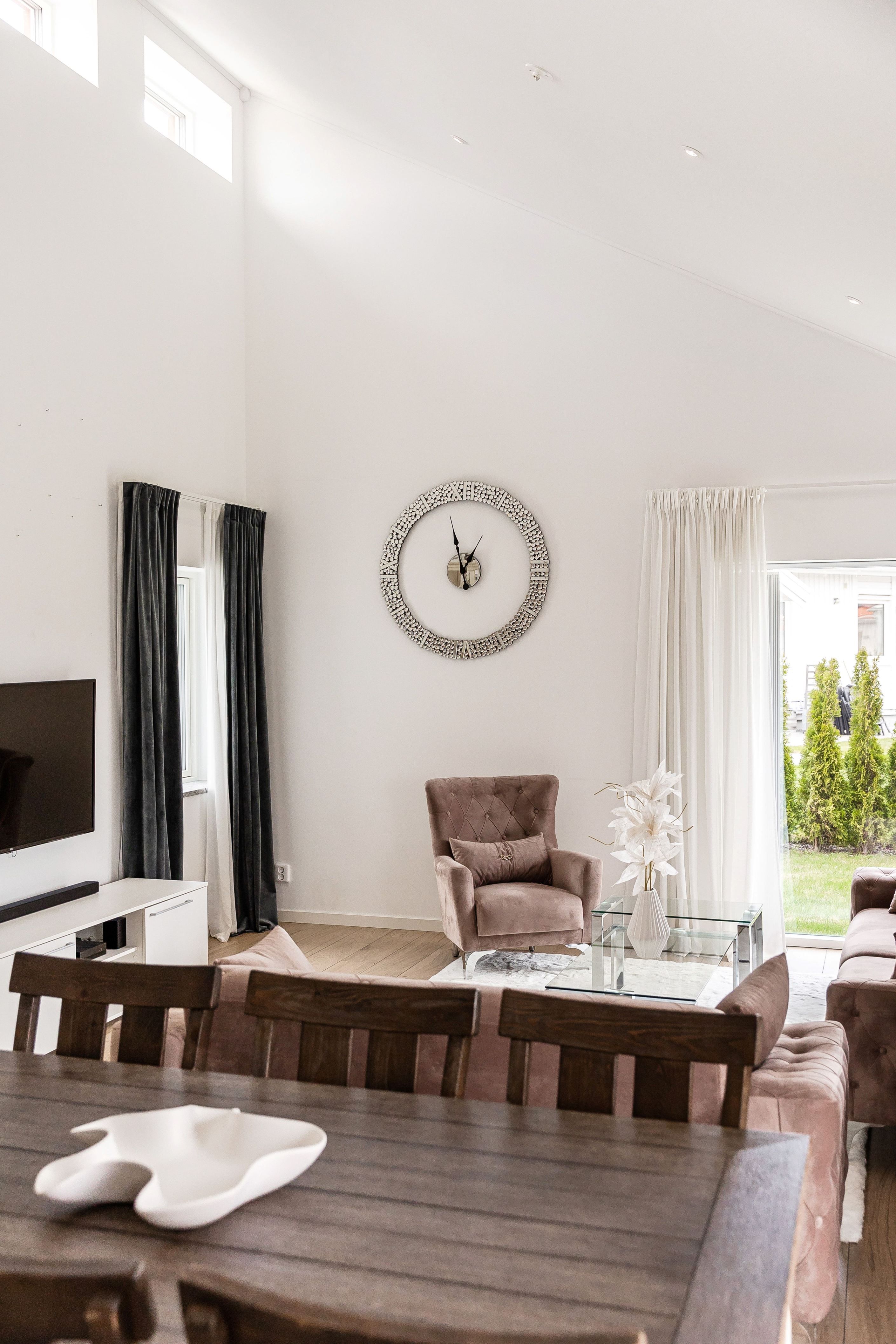 Från hallen öppnar det upp sig med stort allrum och kök i öppen planlösning och högt i tak. Rummet ger en enorm känsla! Ett underbart vardagsrum, ett modernt kök och utgång till inglasat uterum. Här möts du av en tidlös design med materialval av högsta kvalitet, som skapar en behaglig atmosfär. Uterummet är en riktig oas och ger dig ännu mer plats att njuta.