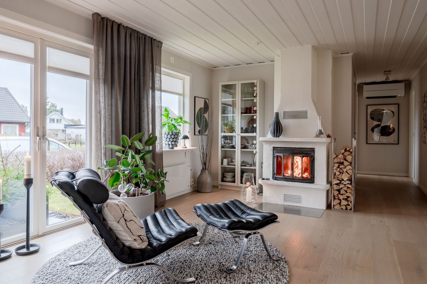 Interiört möts du av en varm och harmonisk atmosfär med genomtänkta materialval och en smakfull helhet. Den öppna planlösningen mellan kök, matplats och vardagsrum skapar generösa ytor för både vardag och umgänge. Här sprakar brasan under kyliga kvällar och de stora fönsterpartierna bjuder in ljuset från trädgården utanför.