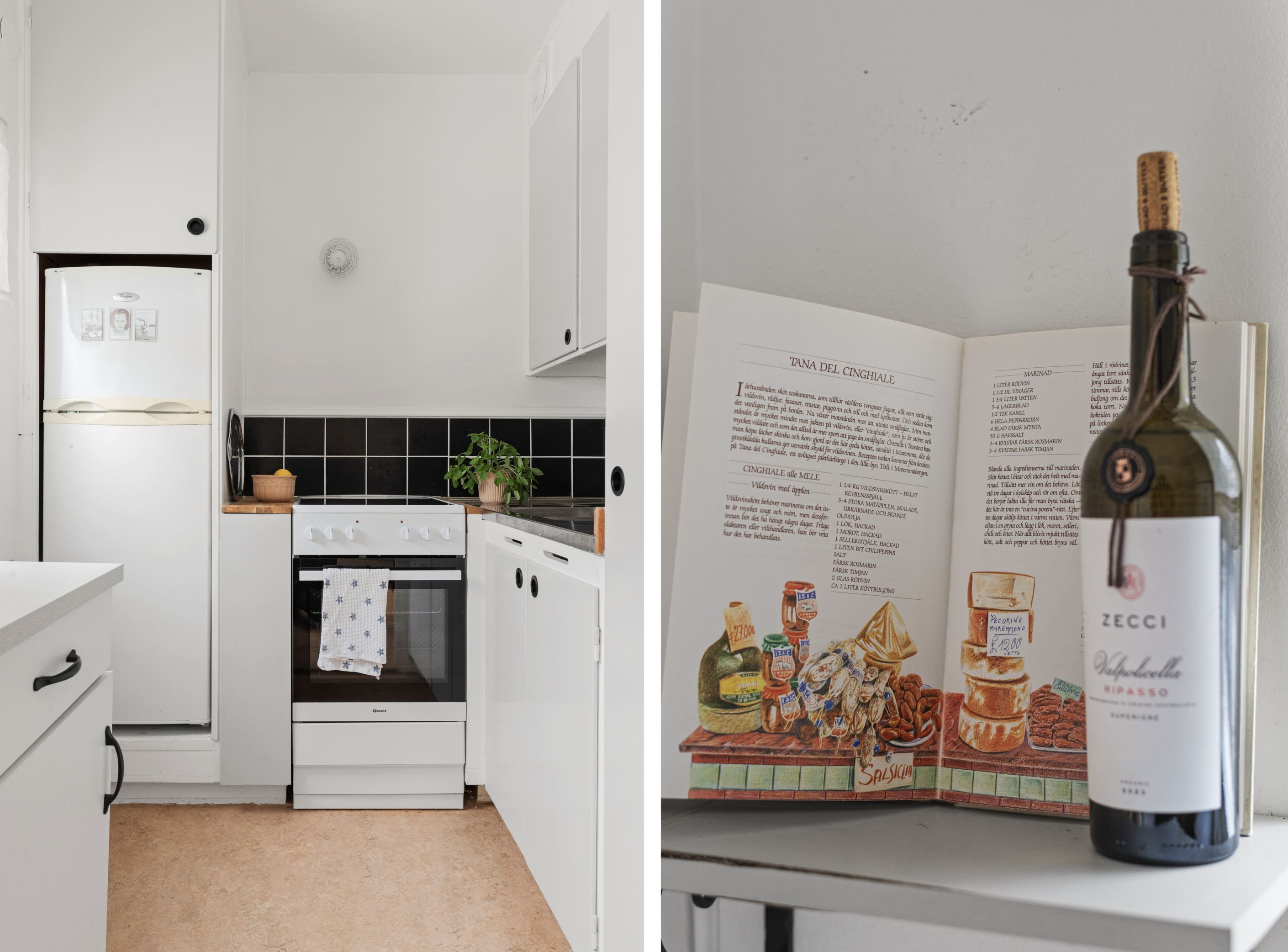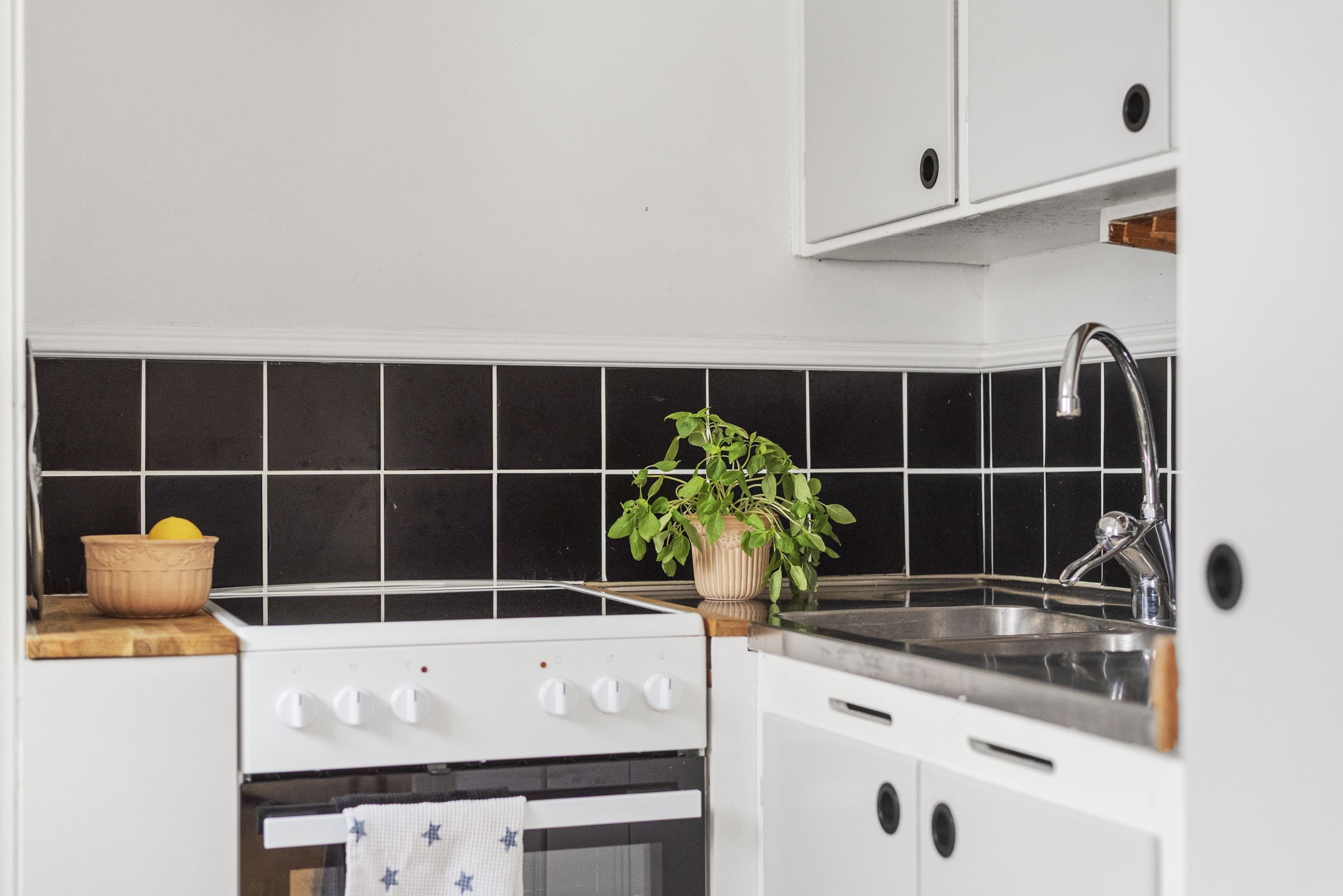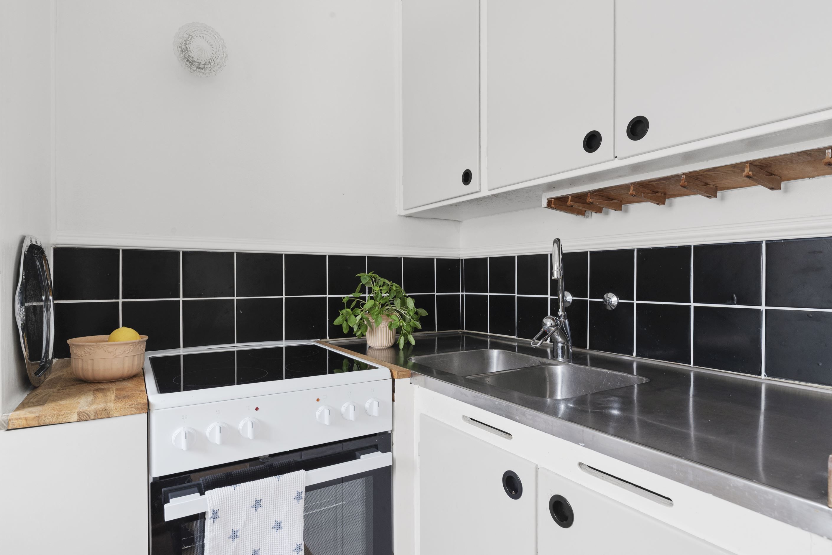 Det ljusa arbetsköket är effektivt planerat med vita snickerier och svart kakel samt god förvaring. Den maskinella utrustningen består av spis med häll (Gram, 2025) samt kyl/frys (whirlpool, okänt årtal) – allt du behöver för en smidig vardag.