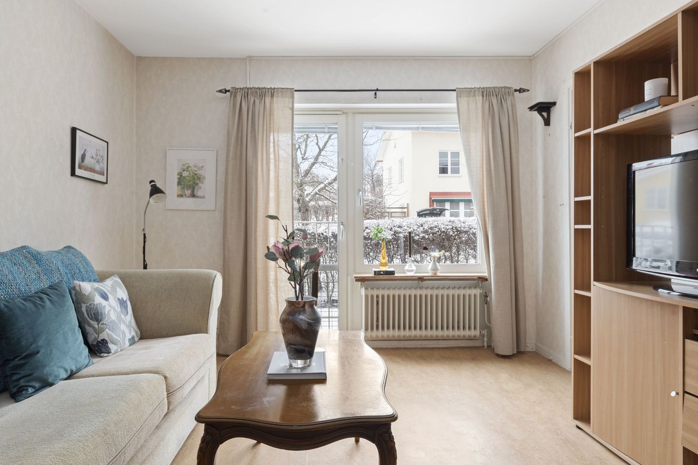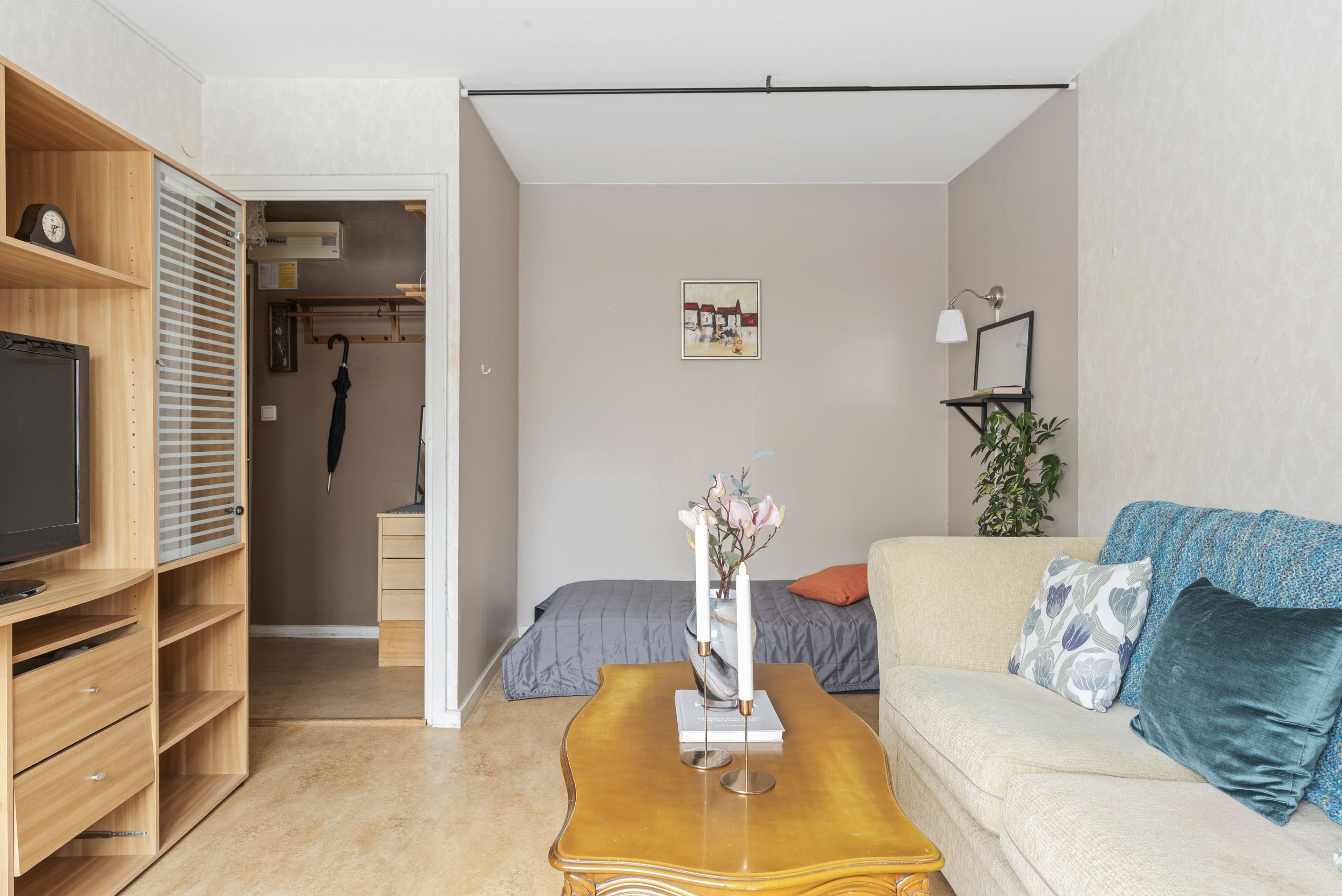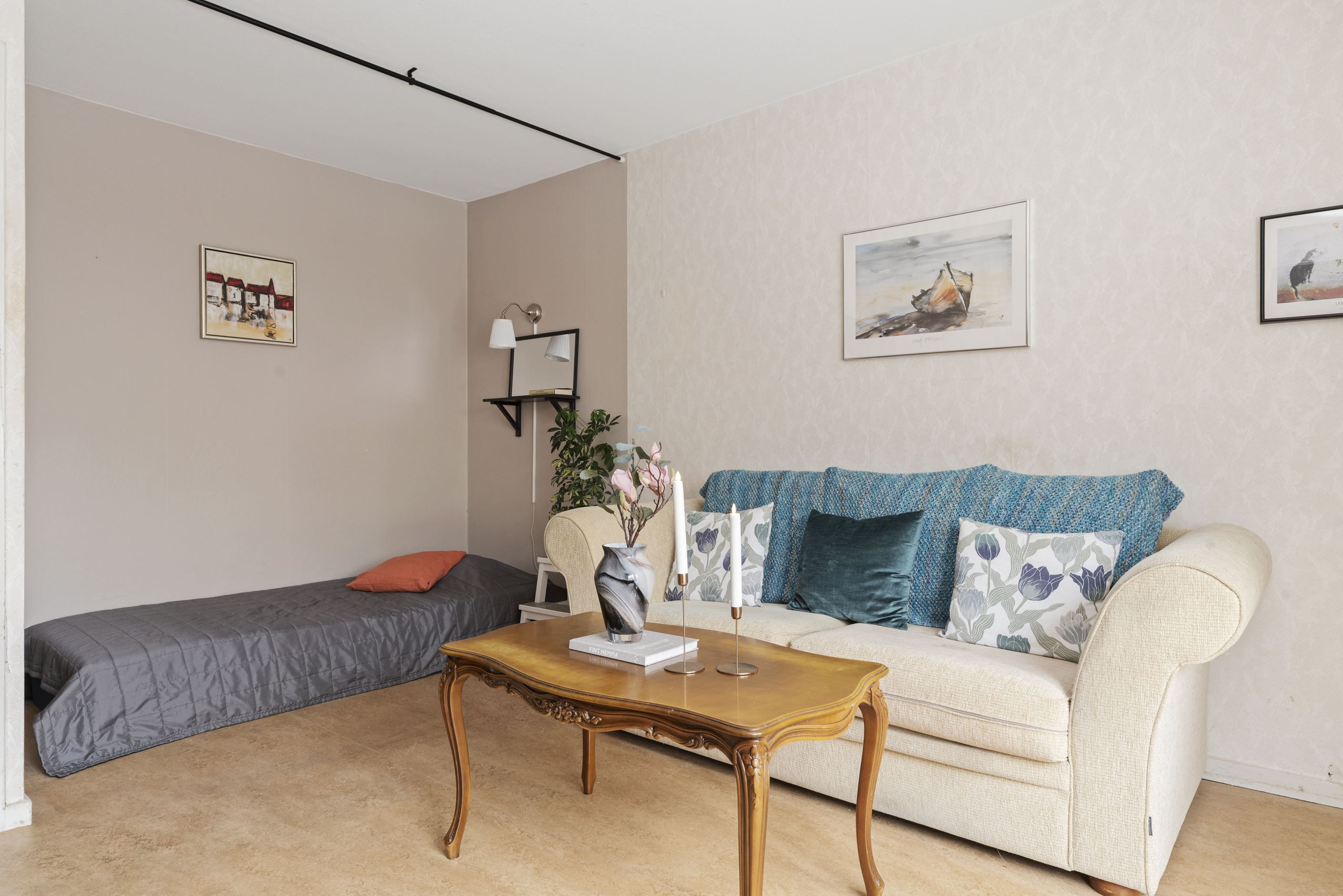 Allrummet är bostadens hjärta och bjuder på en öppen och social planlösning med praktisk sovalkov som skapar en naturlig avskild sovdel. Fönsterpartierna ger ett fint ljusinsläpp och den franska balkongen förstärker känslan av närhet mellan ute och inne. Här finns plats för både soffa, matbord och säng – ett hem som enkelt kan anpassas efter dina behov och din livsstil.