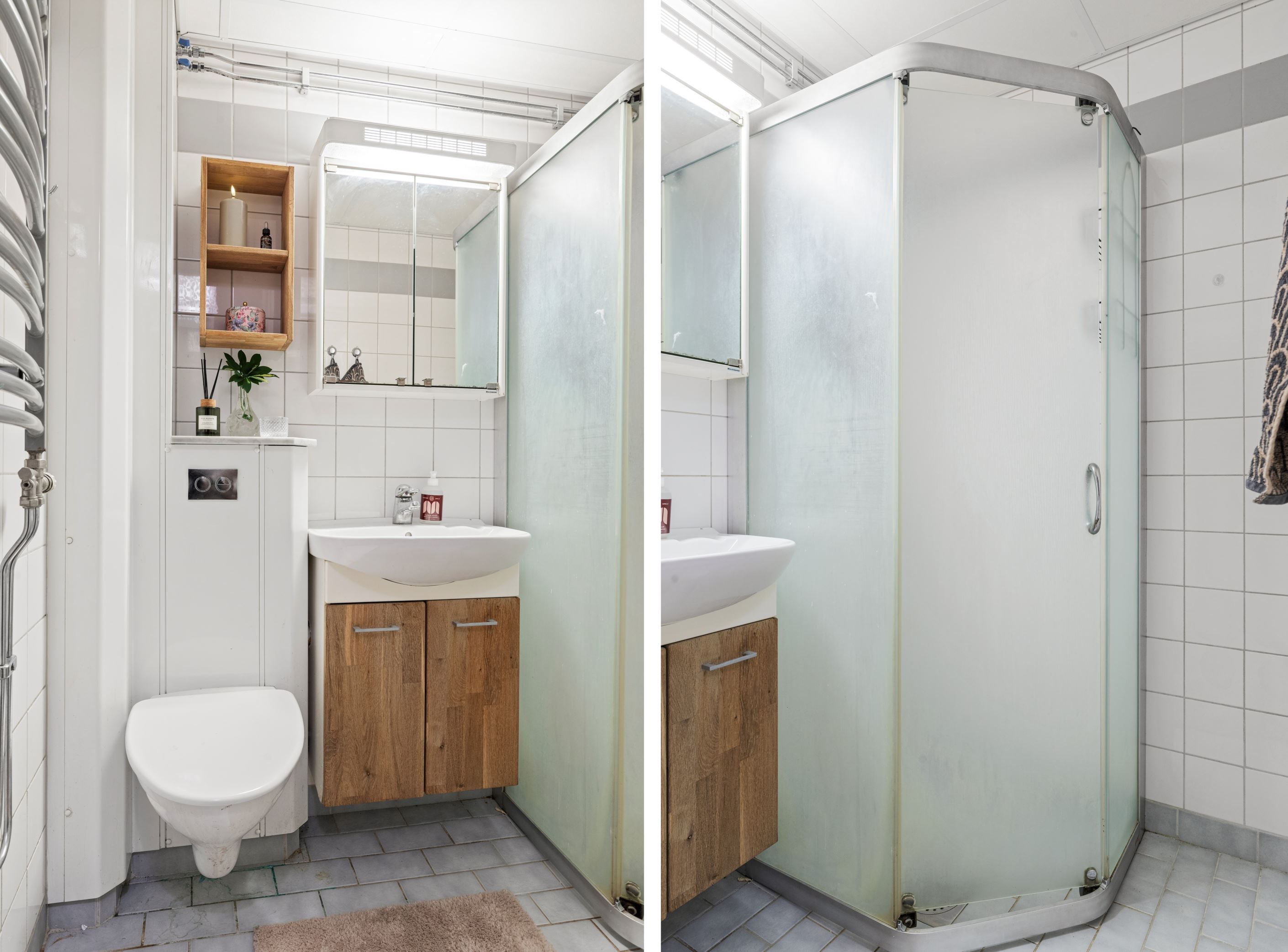 Det helkaklade badrummet med klinkergolv är utrustat med duschhörna, vägghängd-WC, handfat med underskåp, badrumsskåp samt handdukstork.