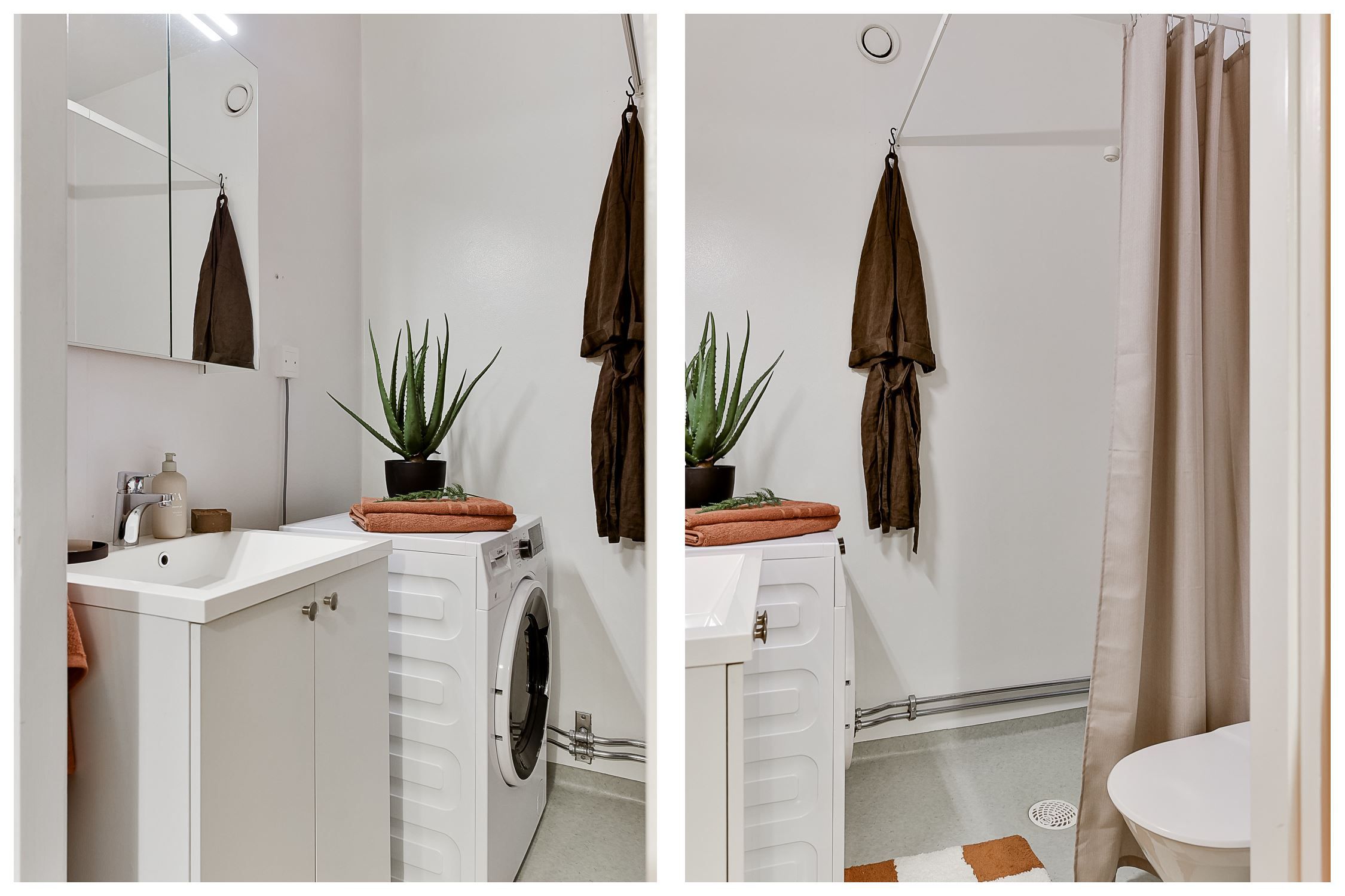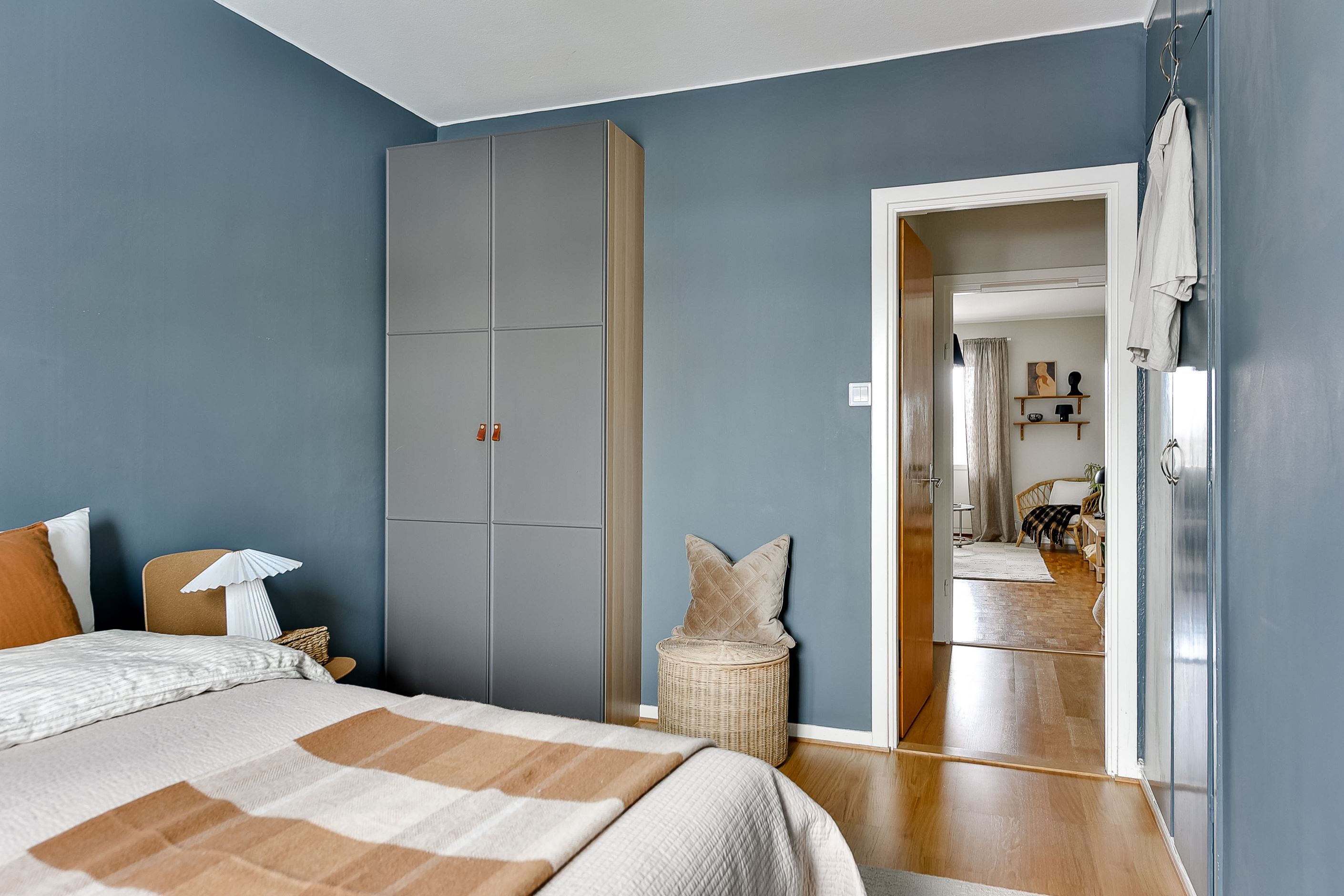 Sovrummet är rofyllt och har plats för dubbelsäng samt bra förvaringsmöjligheter. Badrummet är praktiskt utformat och utrustat med tvättmaskin, vilket förenklar vardagen.