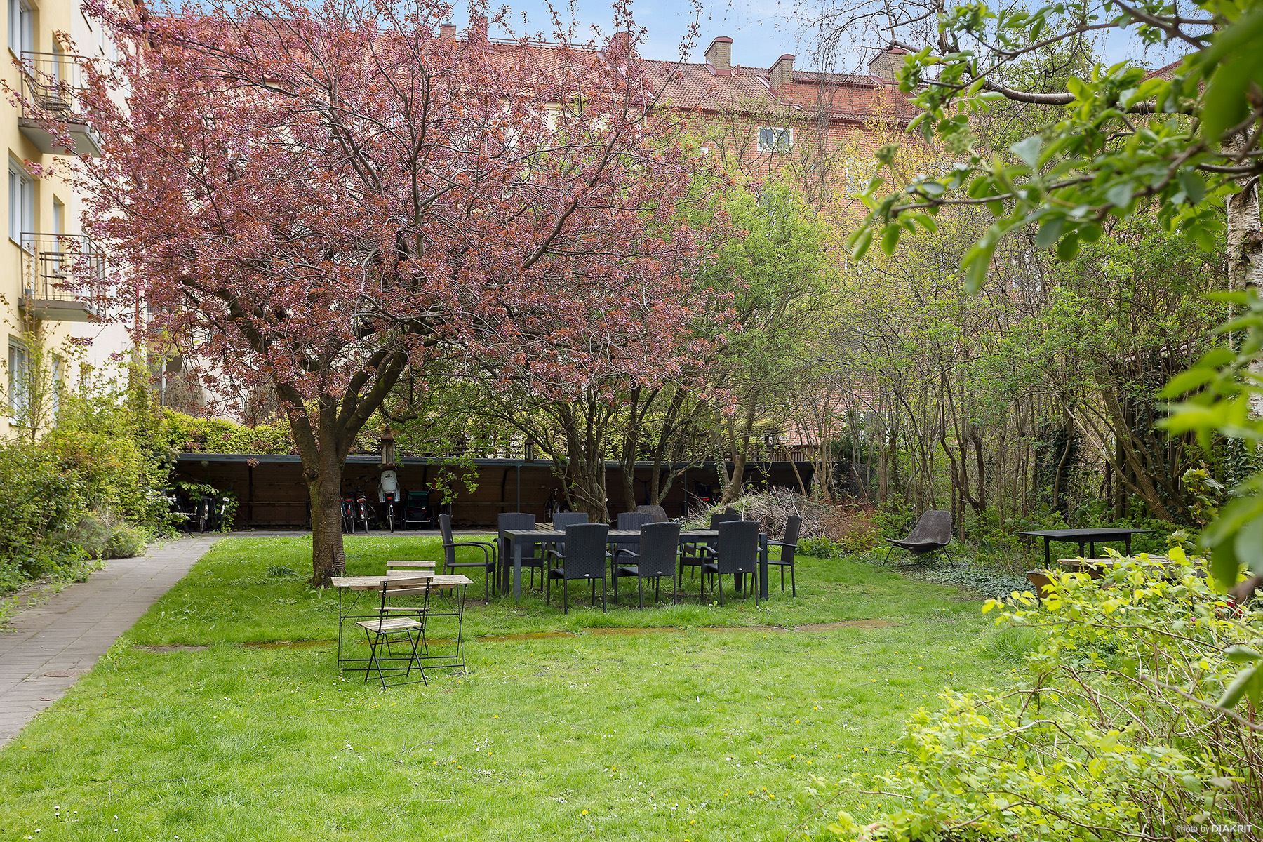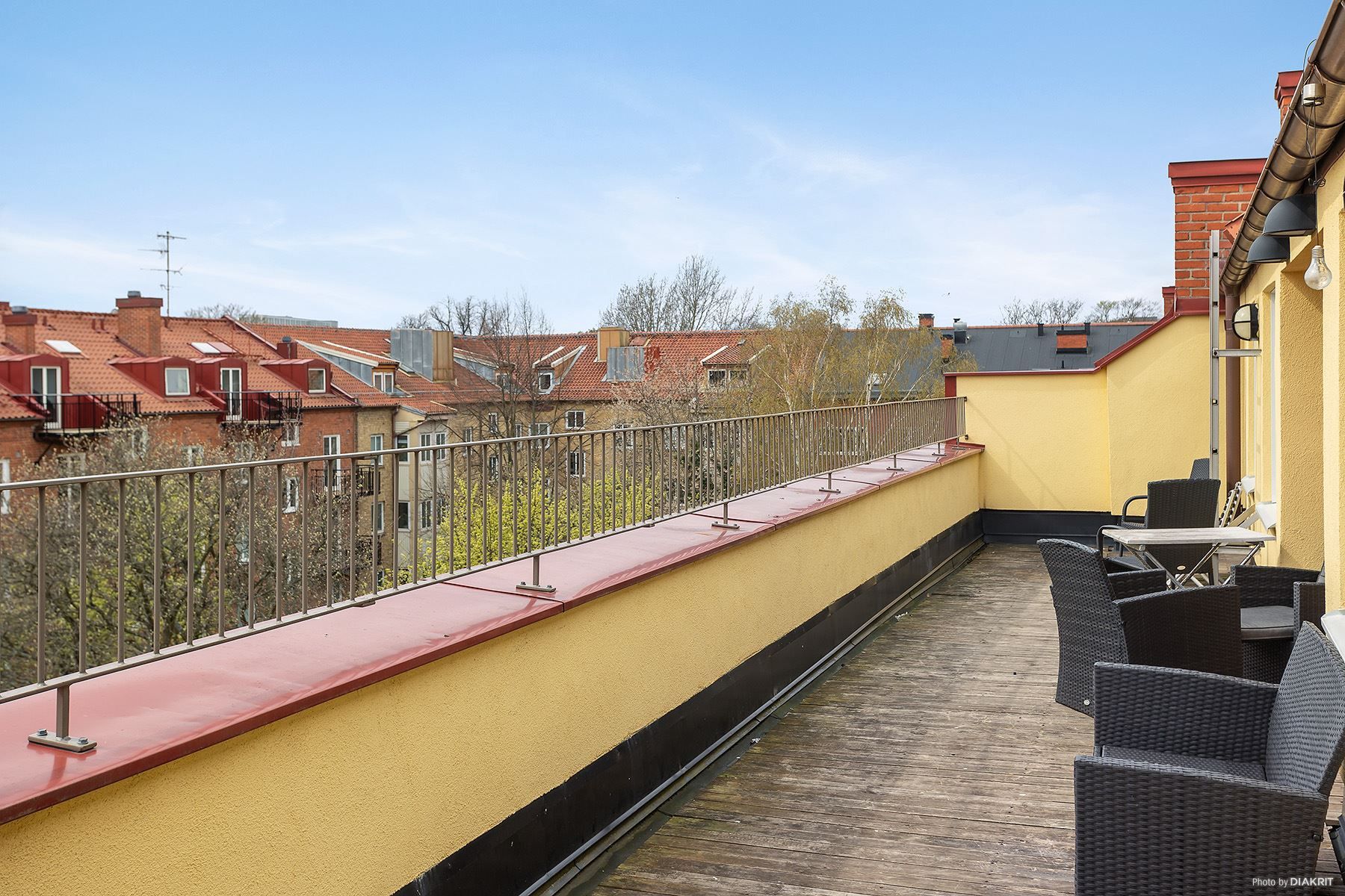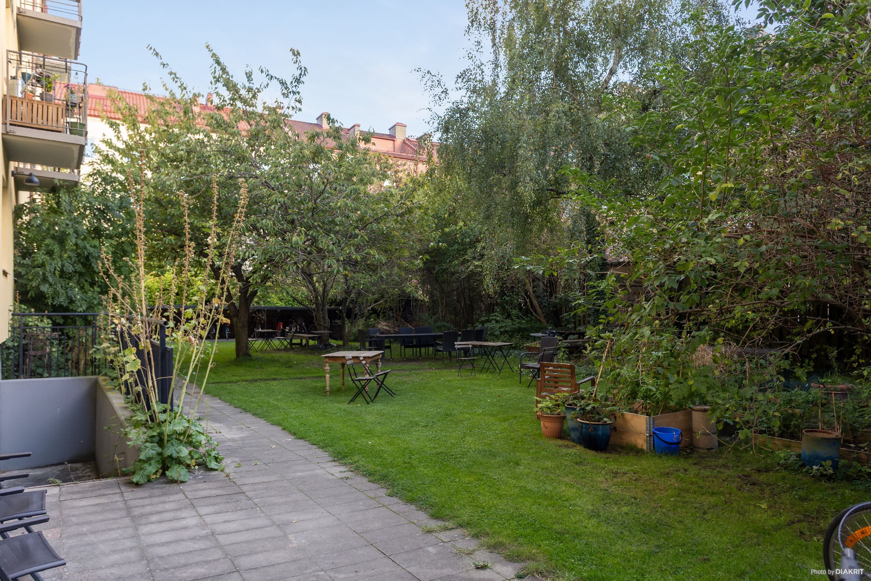 Högst upp i huset finns en stor gemensam takterrass som man kan njuta av tillsammans med vänner och grannar. Under sommarmånaderna nyttjar man med fördel föreningens härliga och grönskande innergård, en egen oas mitt i stan. Här erbjuds grill- och sittmöjligheter att njuta av.