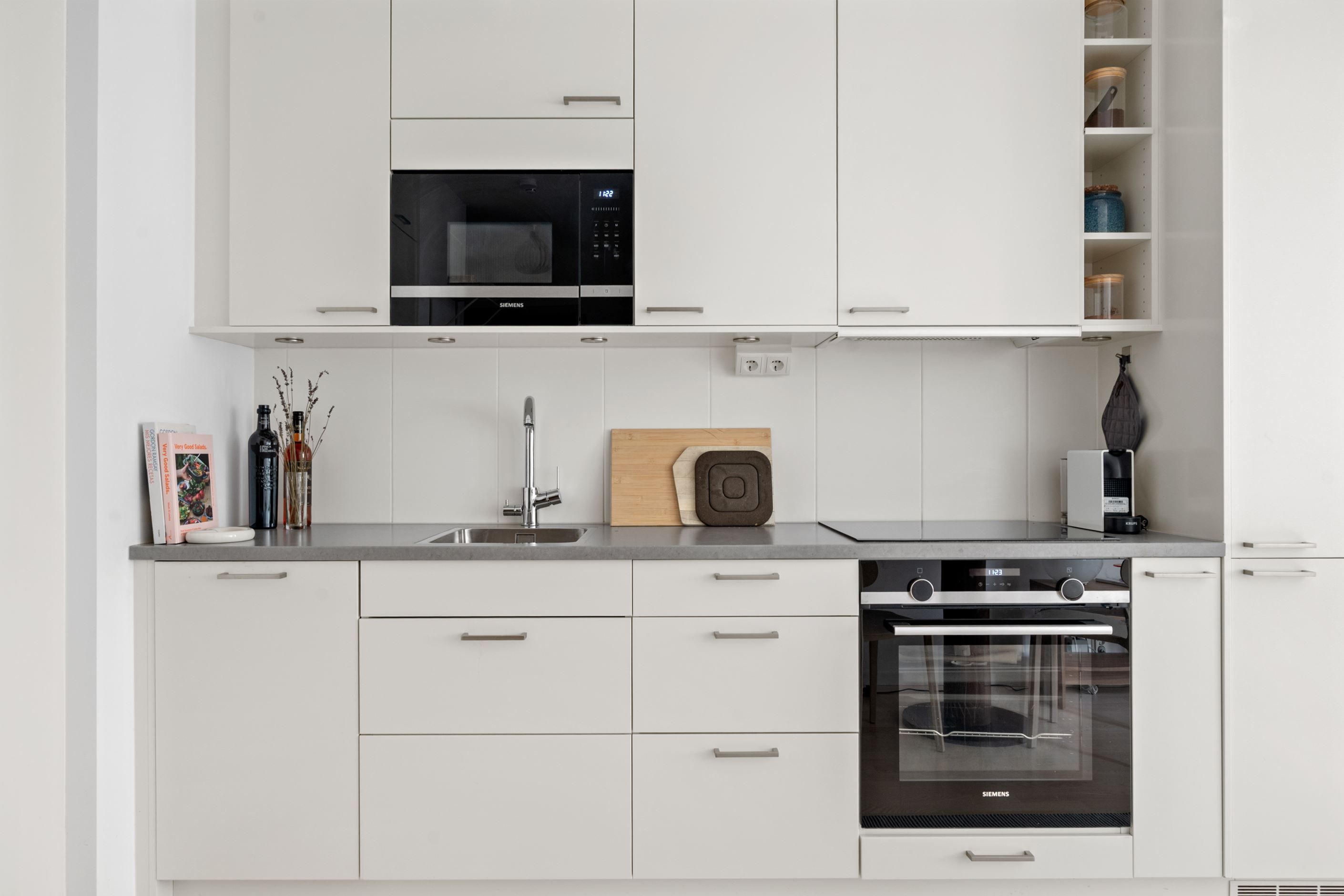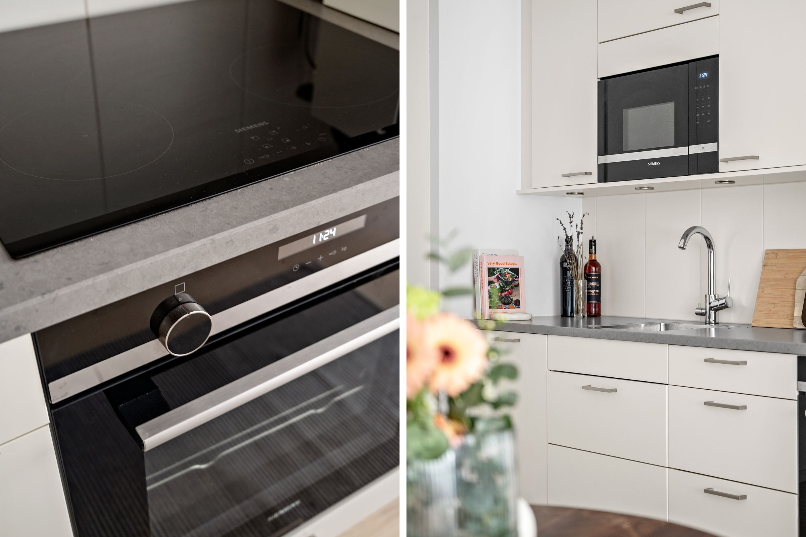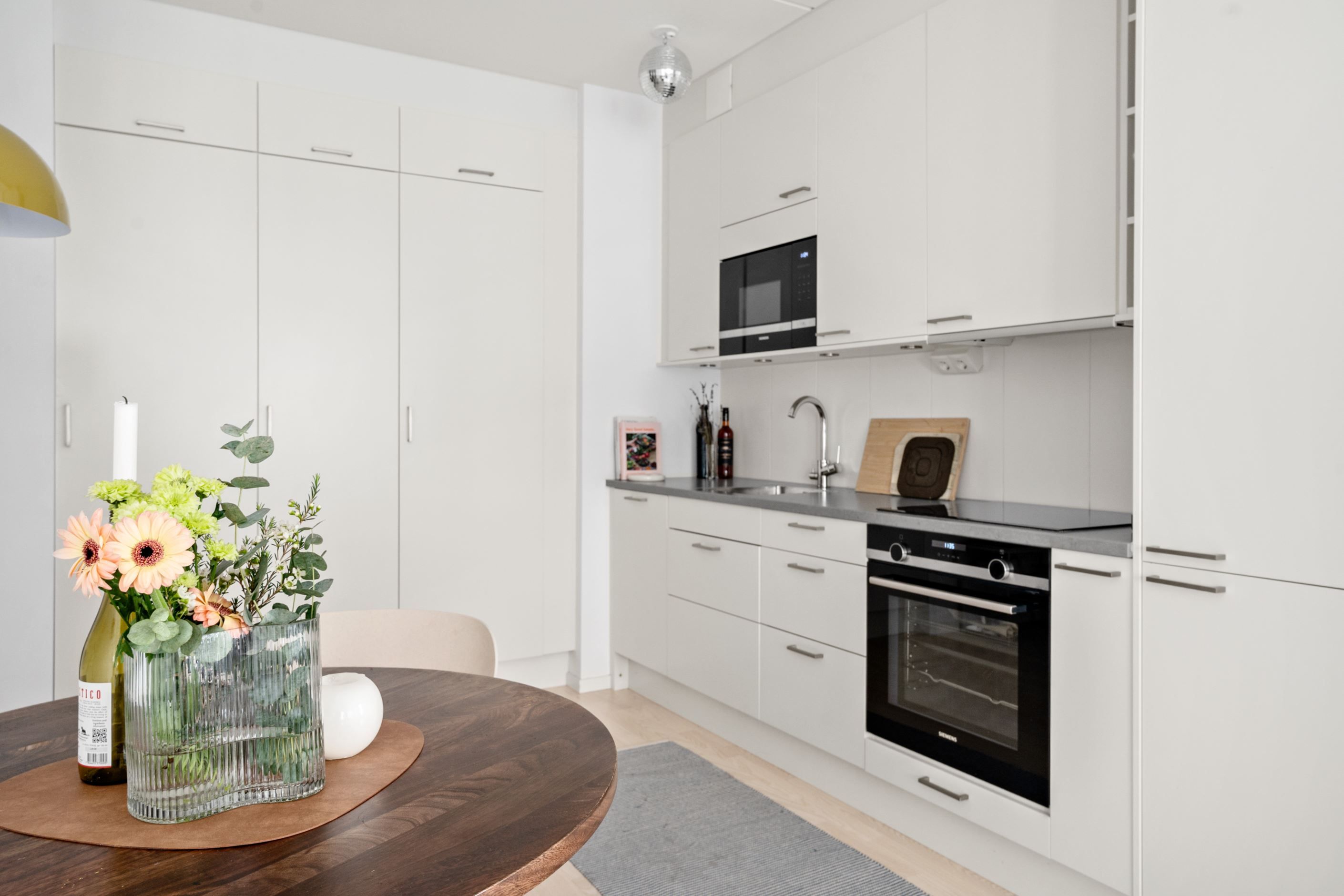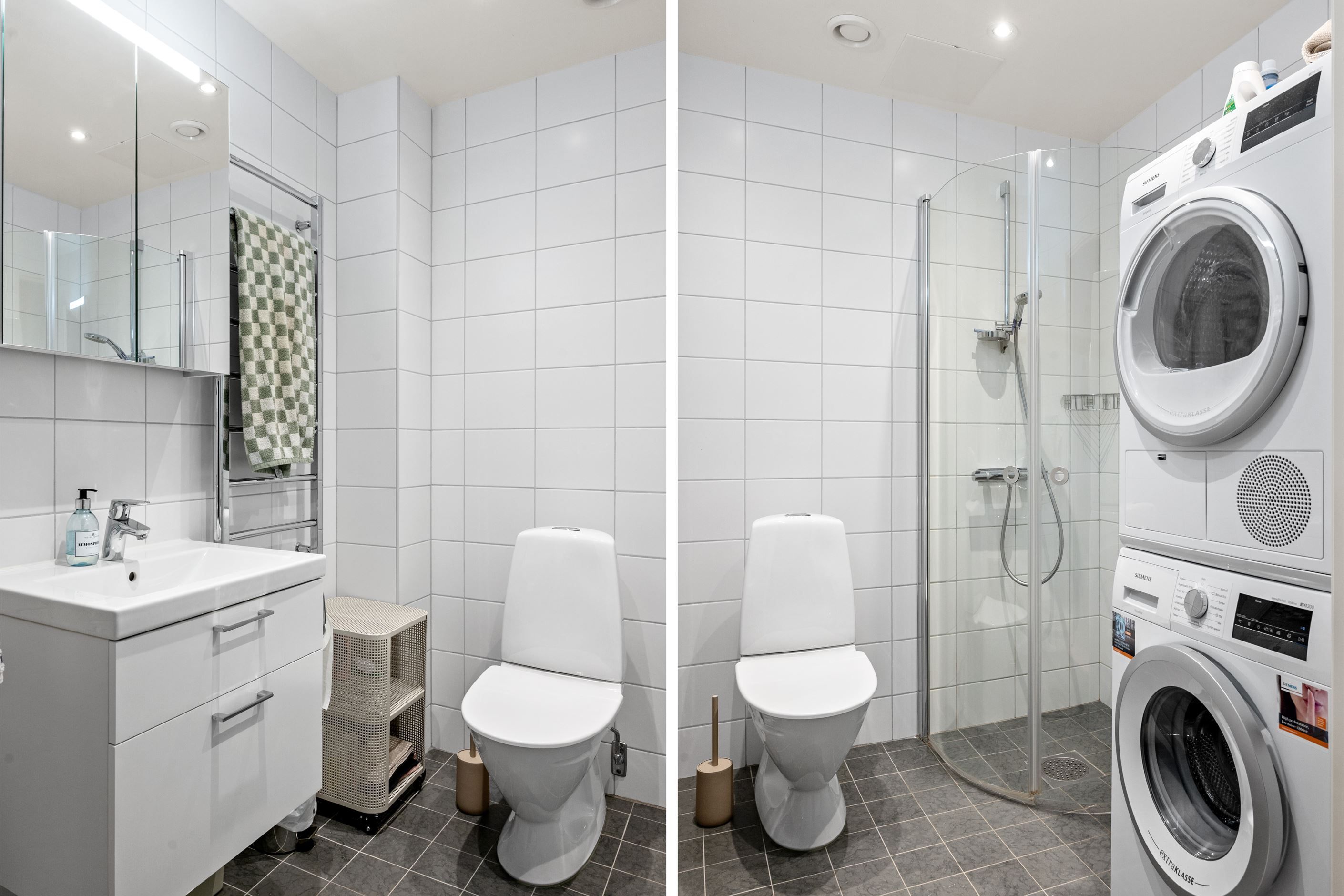 Köket är smakfullt utformat med ljusa luckor, mörk arbetsyta och full maskinell utrustning som gör vardagen smidig. Badrummet är helkaklat i tidlös design och utrustat med dusch samt egen tvättmaskin och torktumlare.